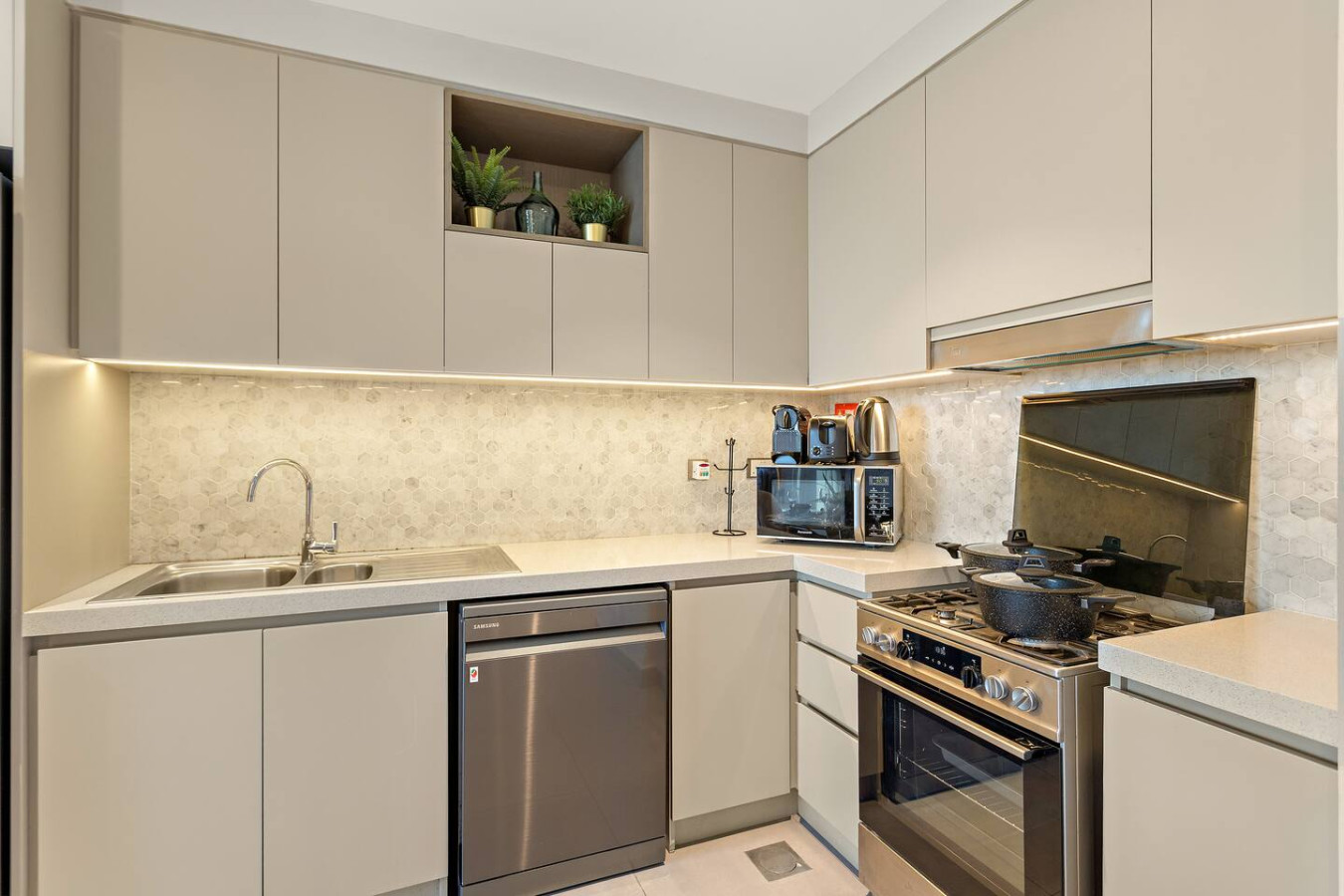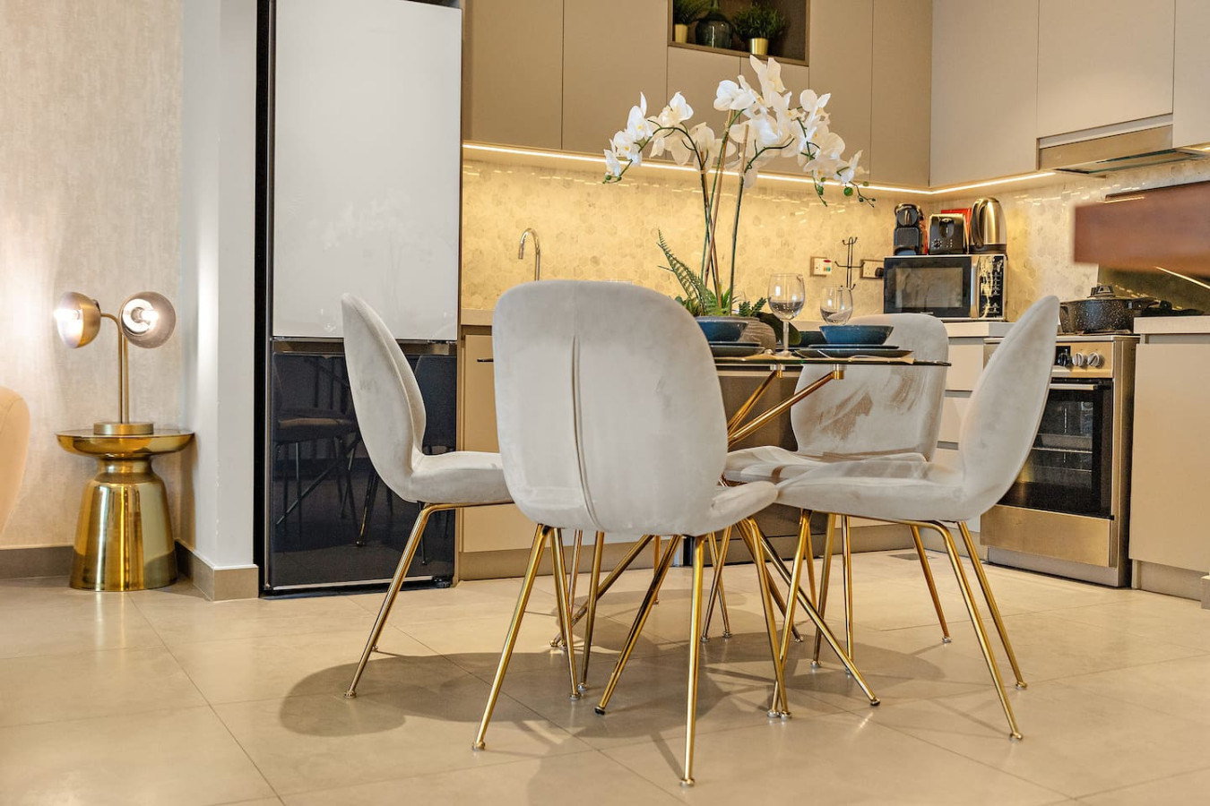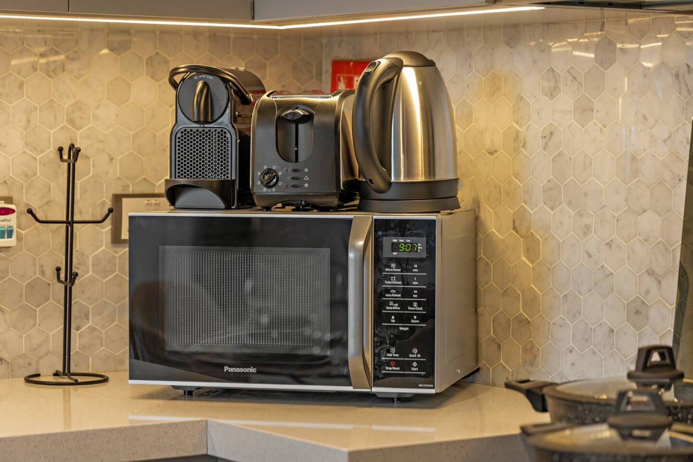 It is fully equipped with stainless-steel cooking appliances that make it suitable for preparing any meal, whether a simple breakfast, quick snack or a three-course gourmet dinner. Spacious quartz countertops and a central kitchen island provide plenty of room to work your MasterChef magic.