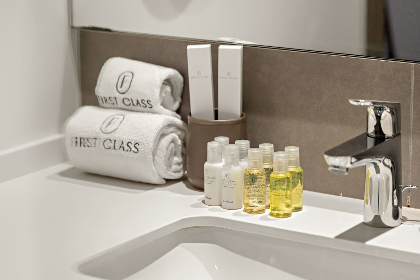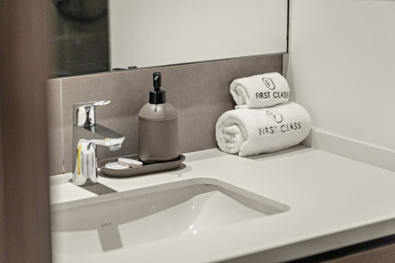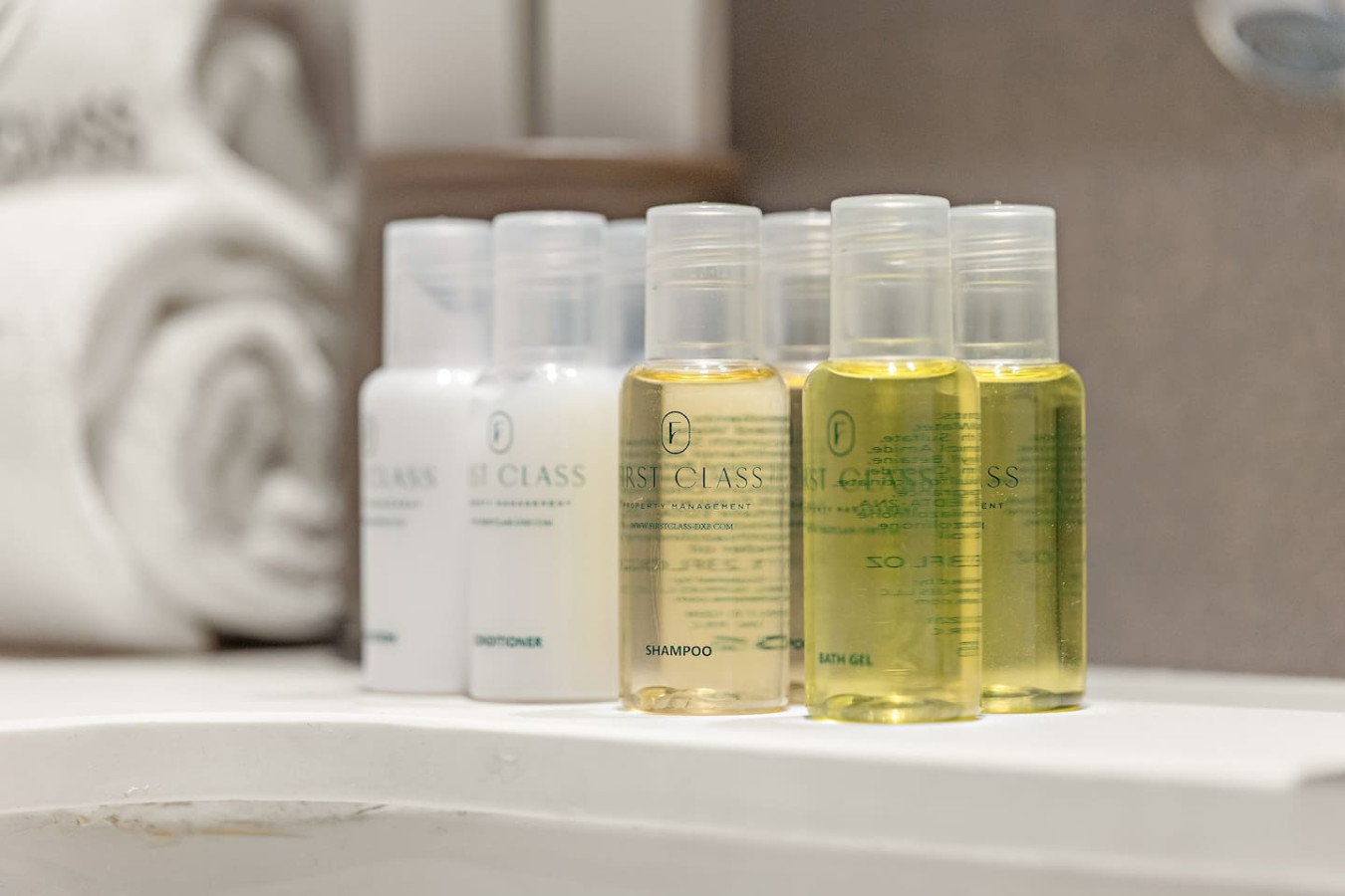 The bathroom is stocked with fresh towels and essential toiletries, so you don’t have to worry about bringing your own.