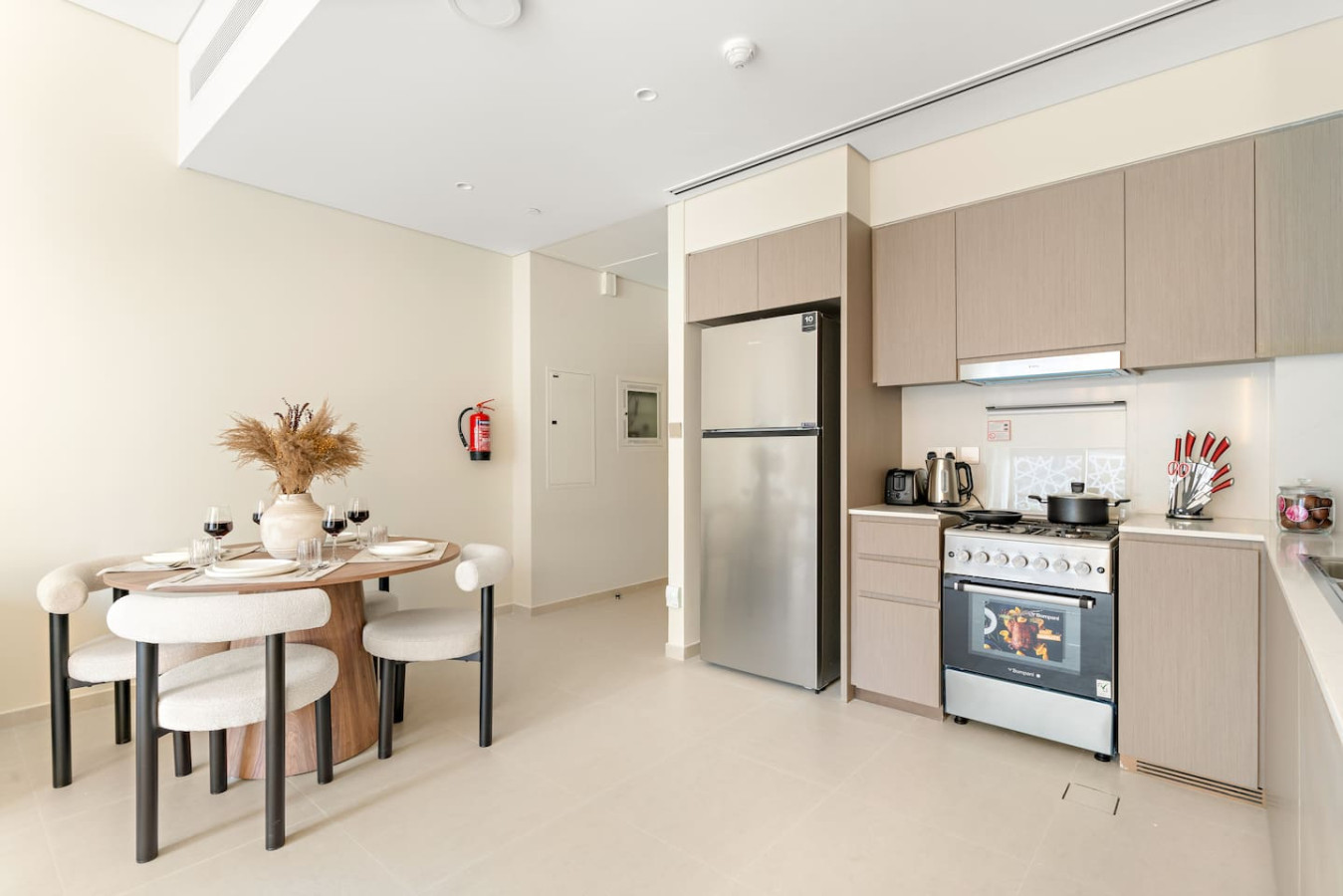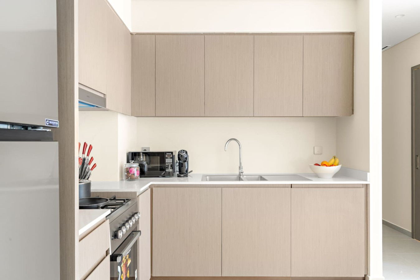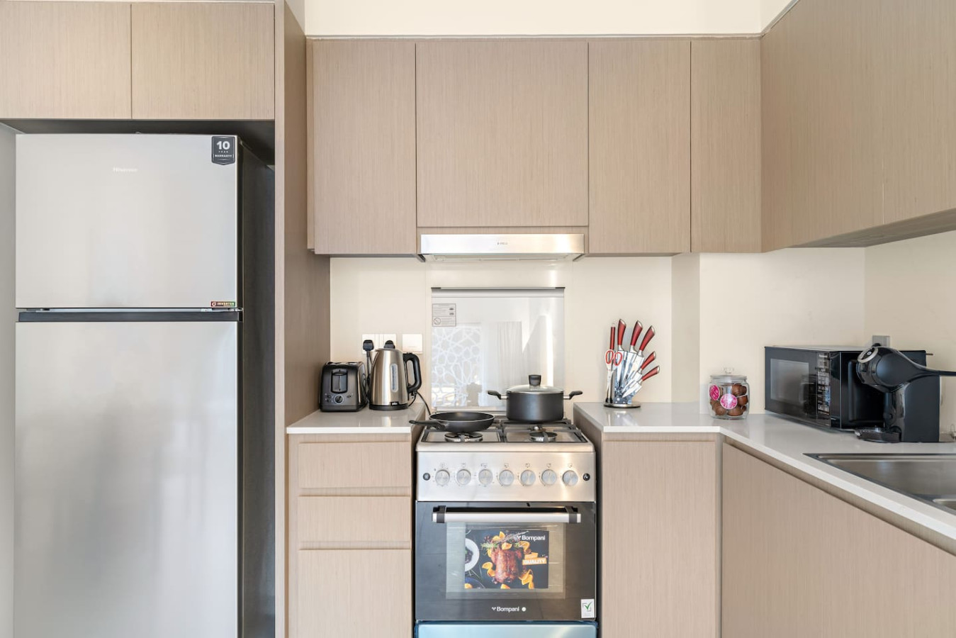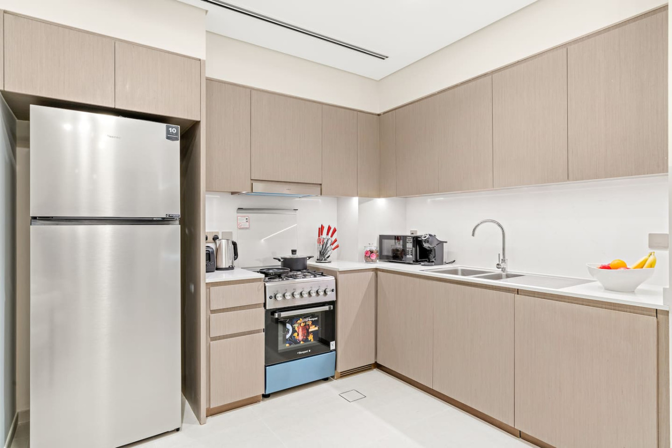 It is fully equipped with stainless-steel cooking appliances that make it suitable for preparing any meal, whether a simple breakfast, quick snack or a three-course gourmet dinner. Spacious quartz countertops and a central kitchen island provide plenty of room to work your MasterChef magic.
