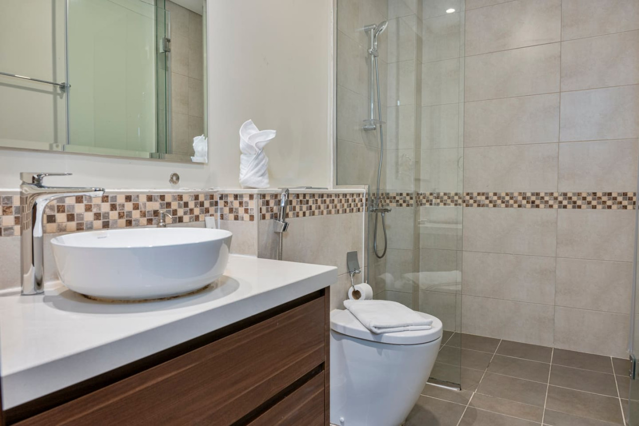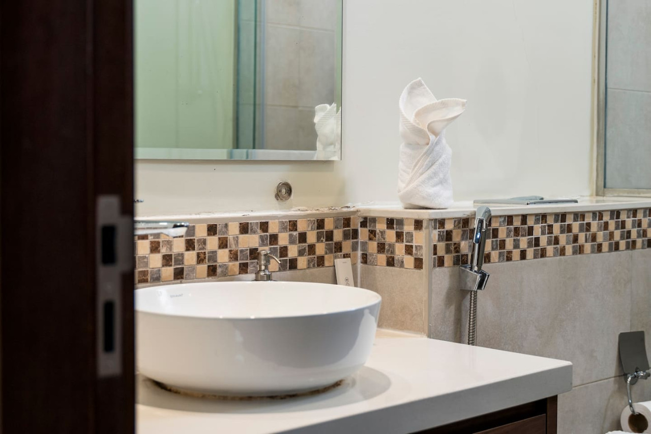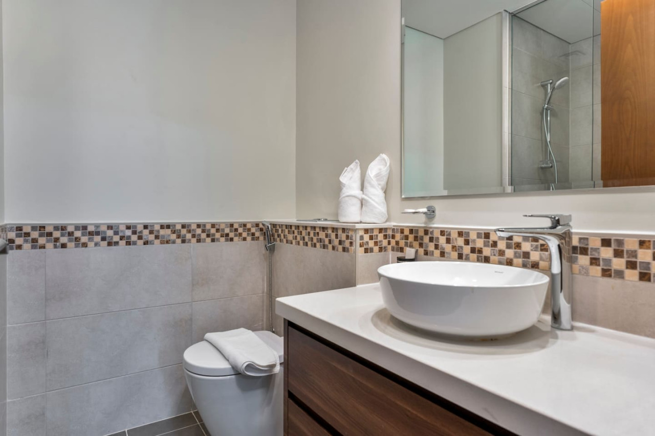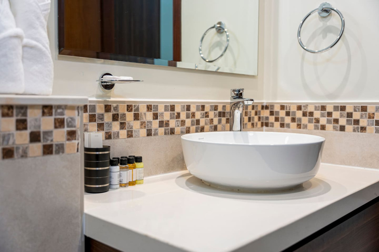 The bathroom is stocked with fresh towels and essential toiletries, so you don’t have to worry about bringing your own.
