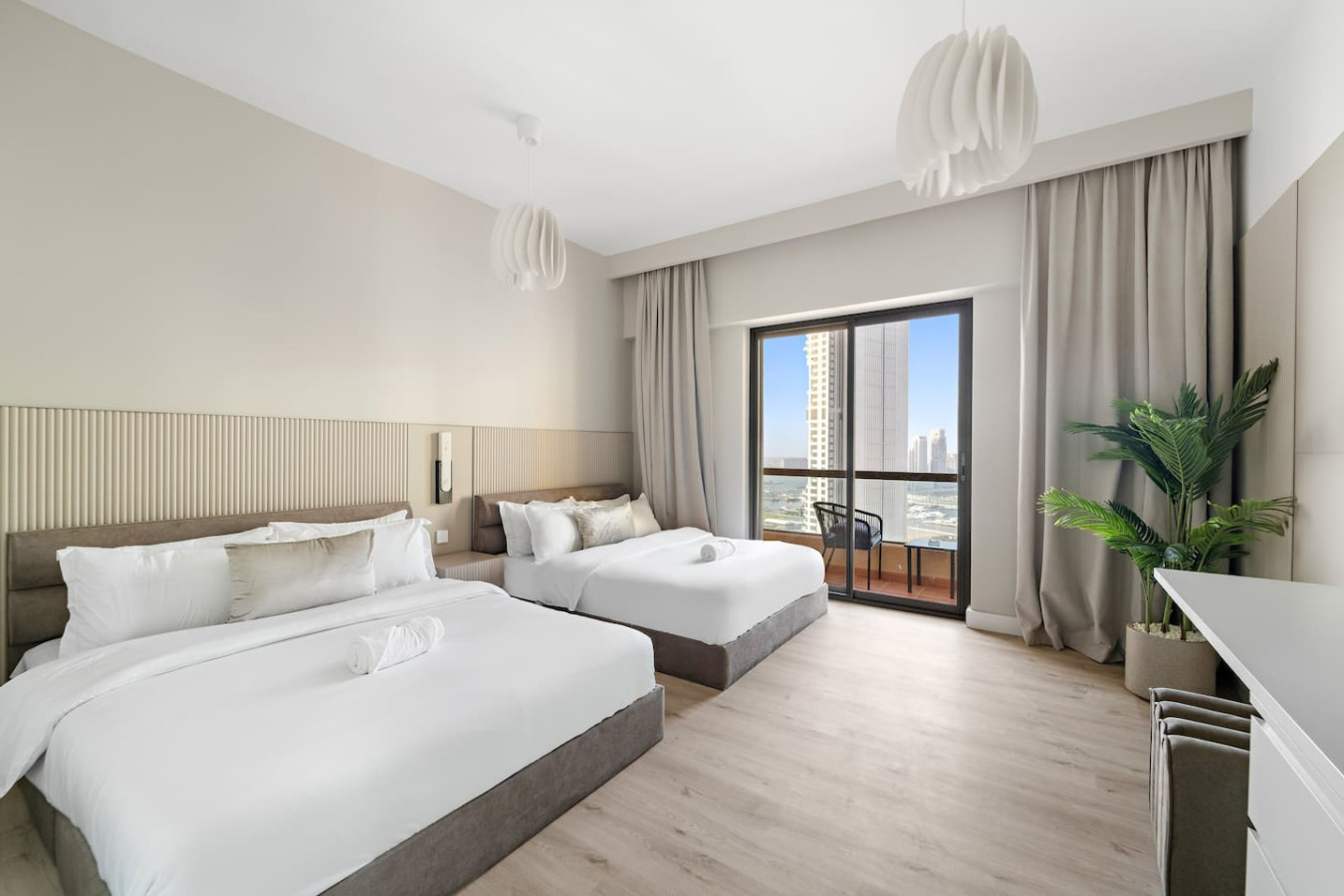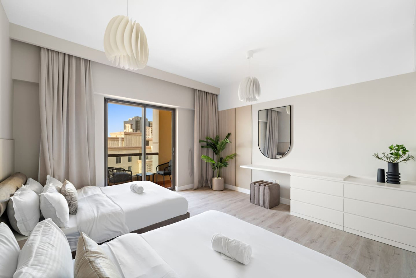 The beds and bedroom & living room are all equipped with similar amenities.