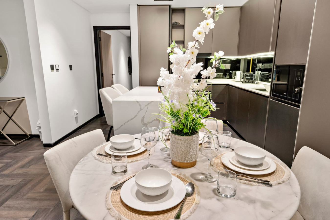 Have a few drinks in the living room while the food is getting ready. Once it’s done, serve it at the inviting dining table and enjoy a tasty meal with your loved ones.