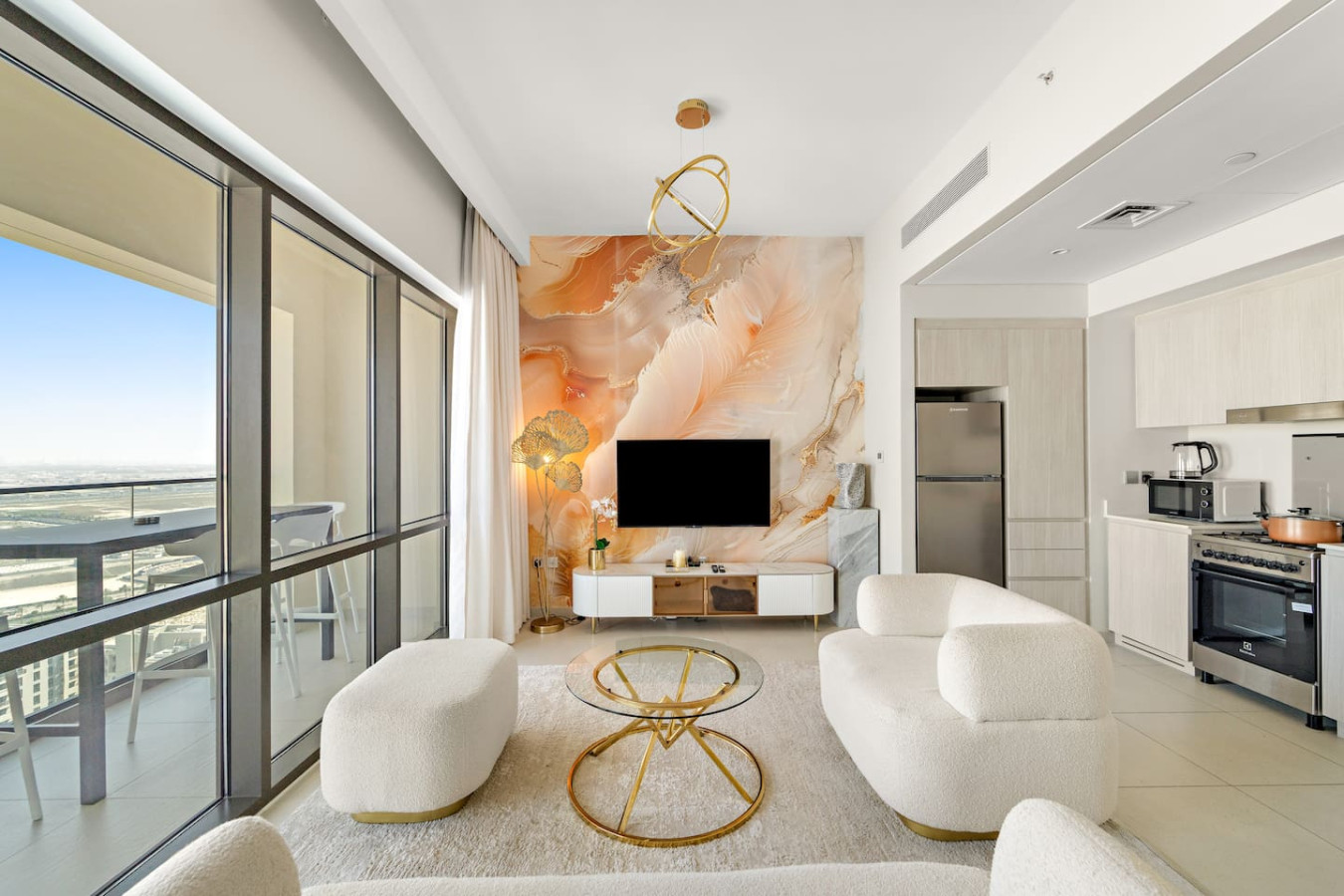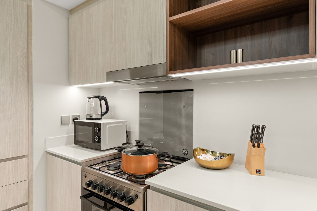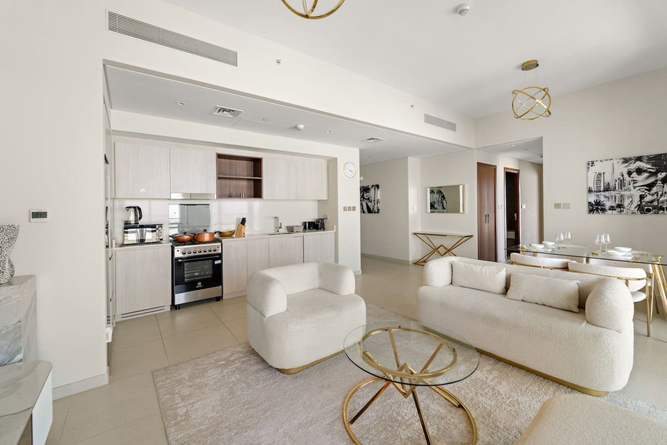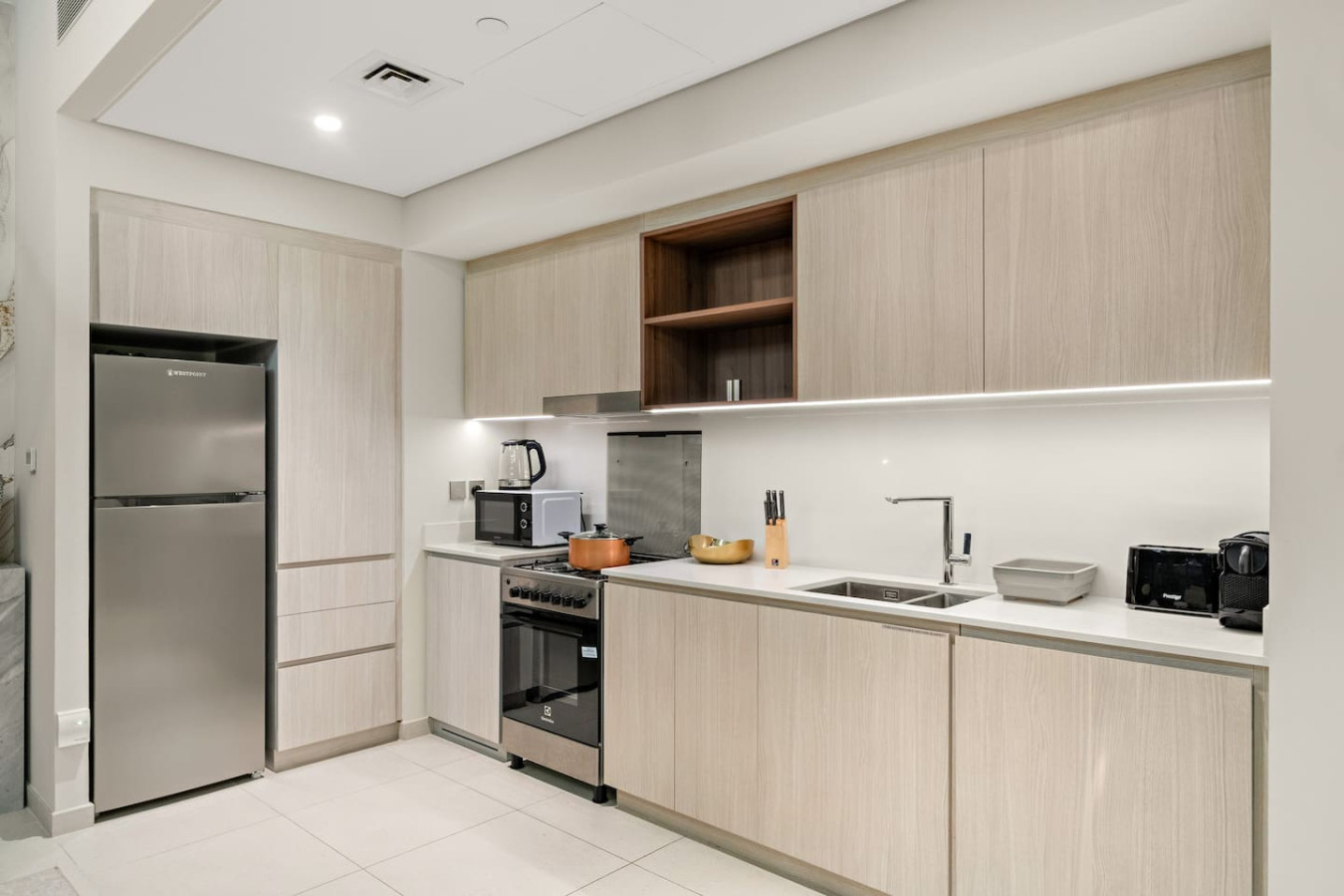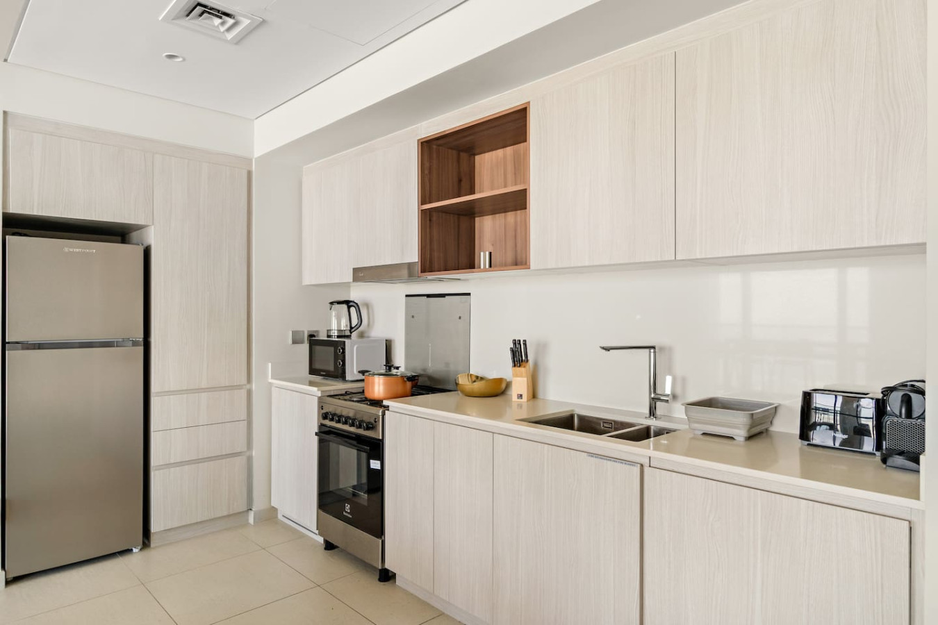 It is fully equipped with stainless-steel cooking appliances that make it suitable for preparing any meal, whether a simple breakfast, quick snack or a three-course gourmet dinner. Spacious quartz countertops and a central kitchen island provide plenty of room to work your MasterChef magic.