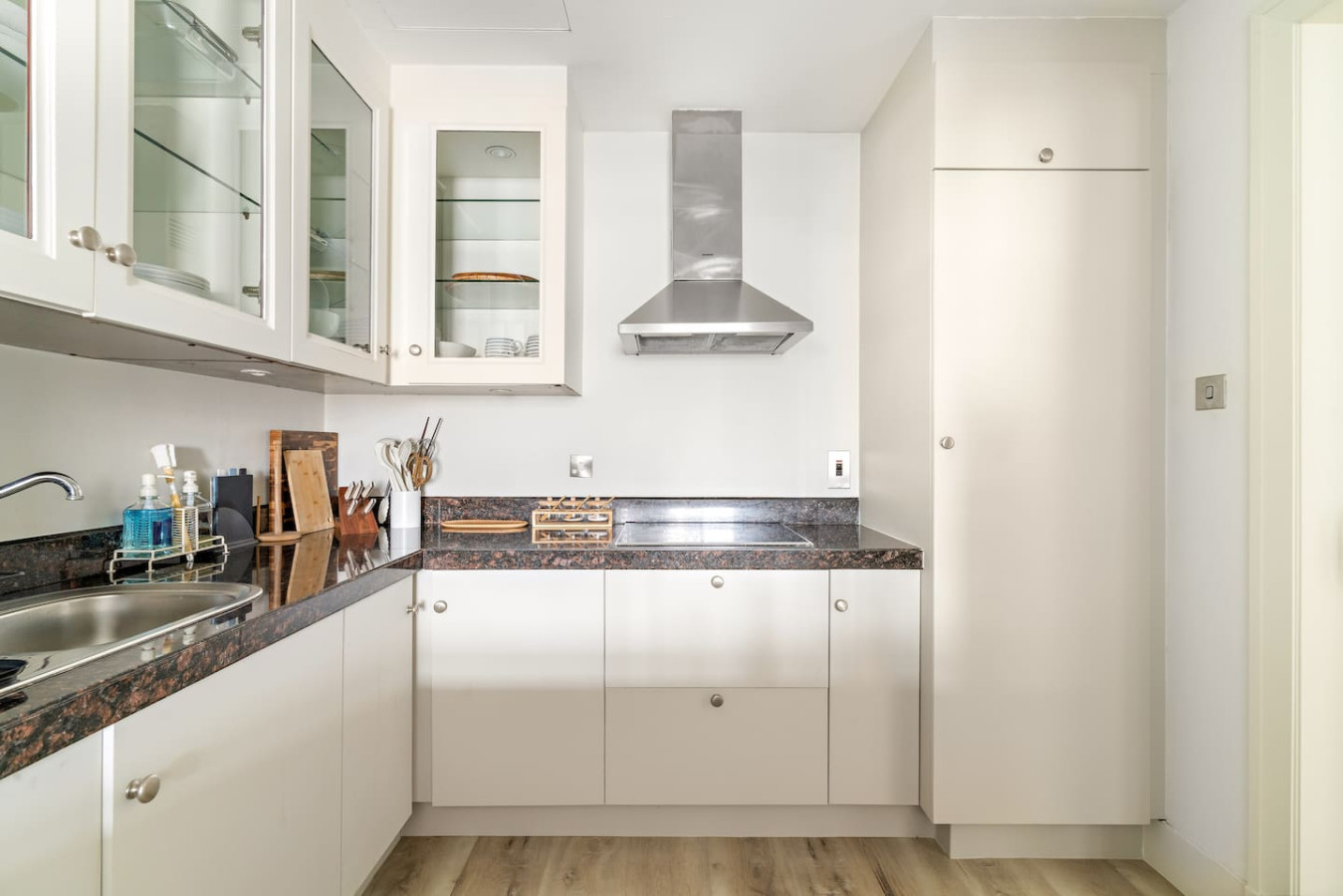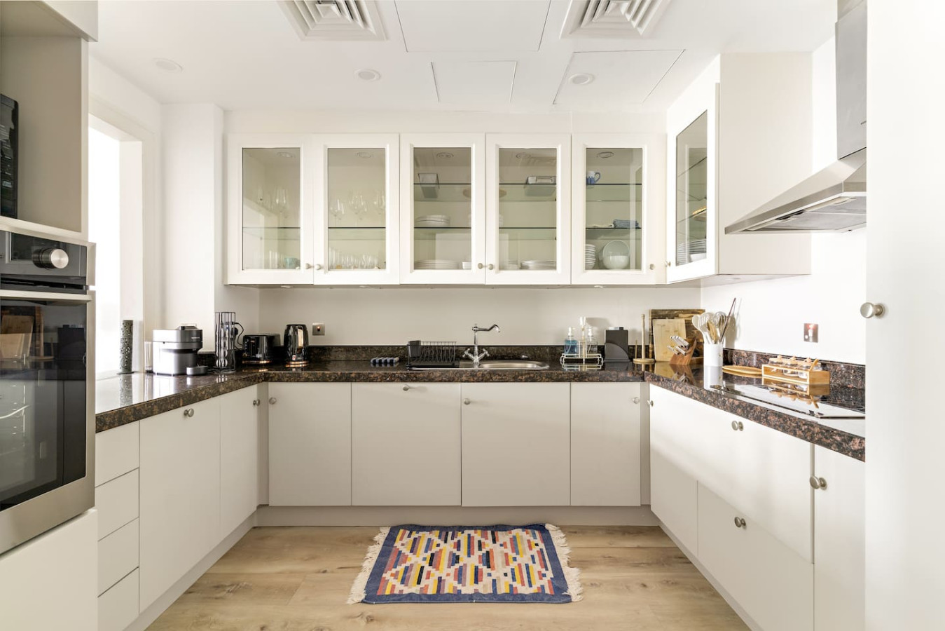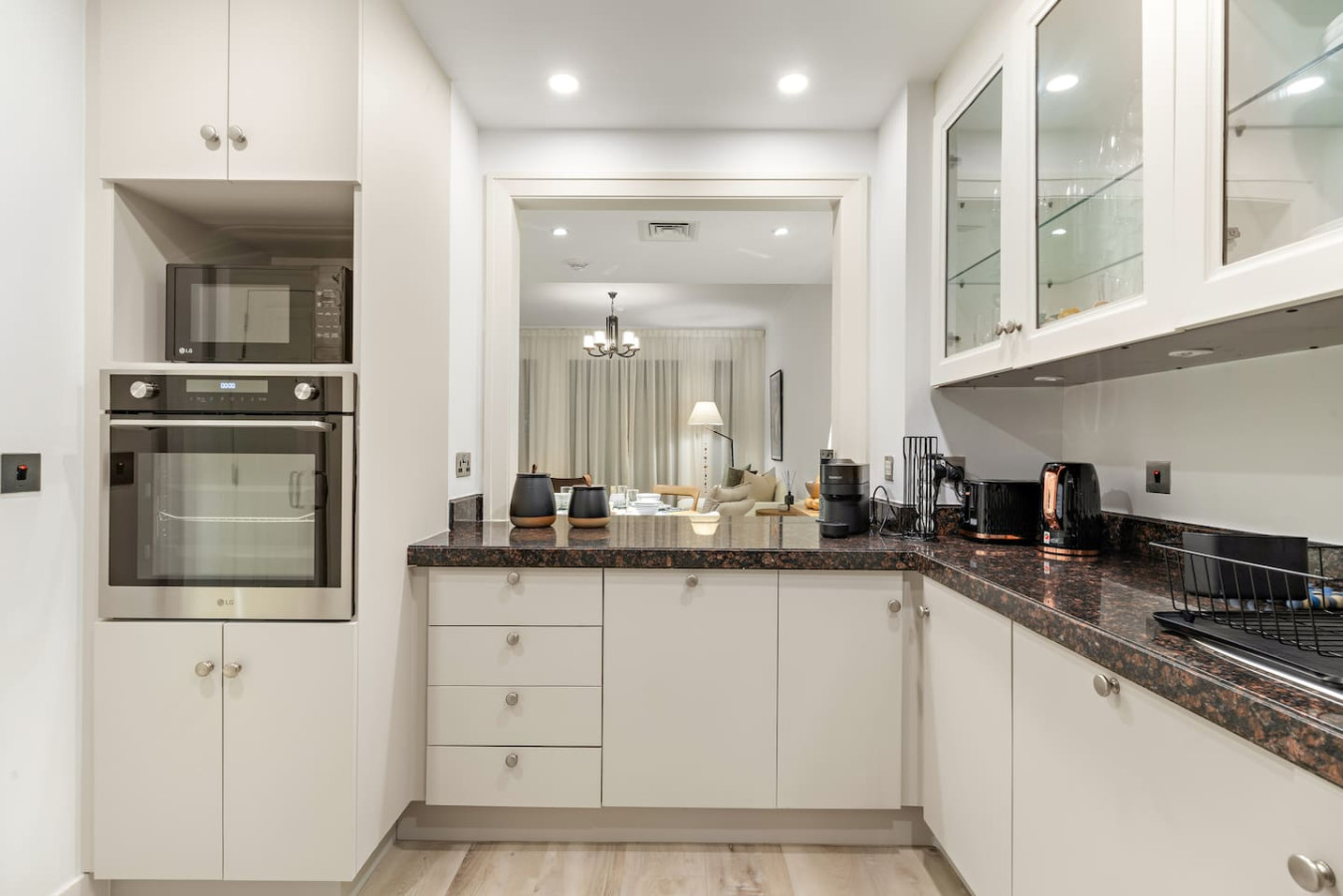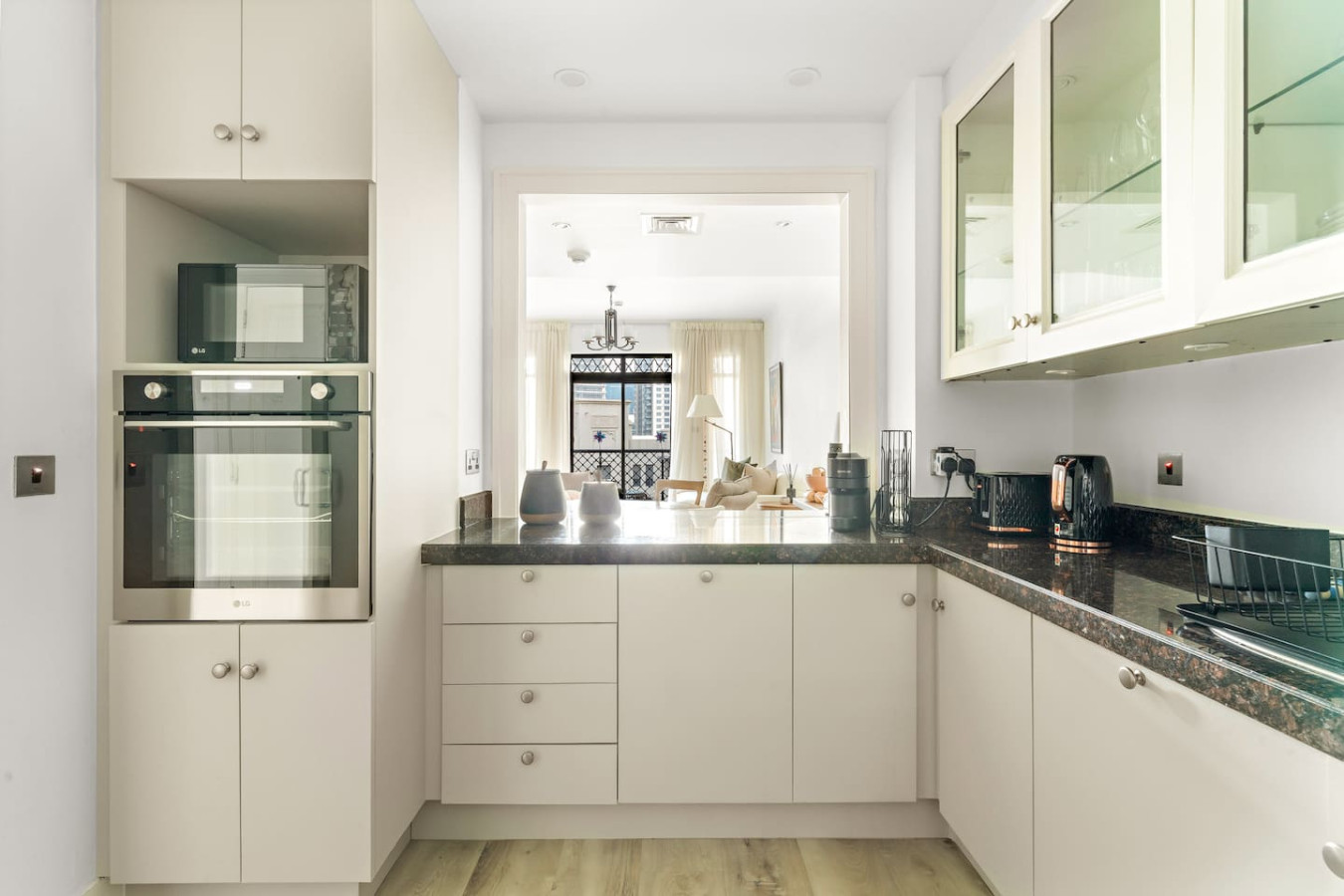 It is fully equipped with stainless-steel cooking appliances that make it suitable for preparing any meal, whether a simple breakfast, quick snack or a three-course gourmet dinner. Spacious quartz countertops and a central kitchen island provide plenty of room to work your MasterChef magic.