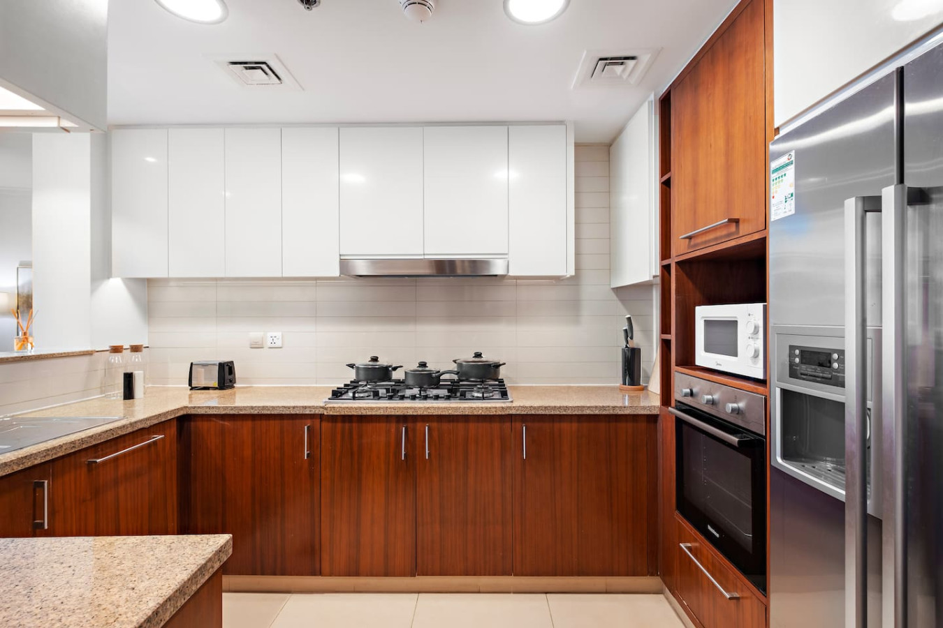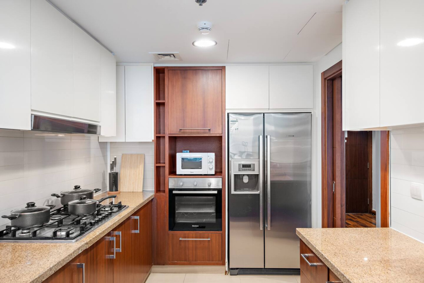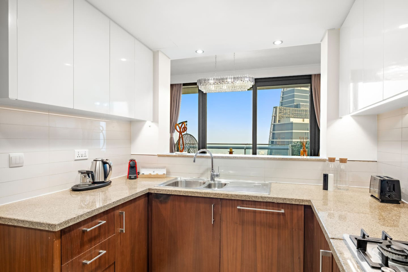It is fully equipped with stainless-steel cooking appliances that make it suitable for preparing any meal, whether a simple breakfast, quick snack or a three-course gourmet dinner. Spacious quartz countertops and a central kitchen island provide plenty of room to work your MasterChef magic.