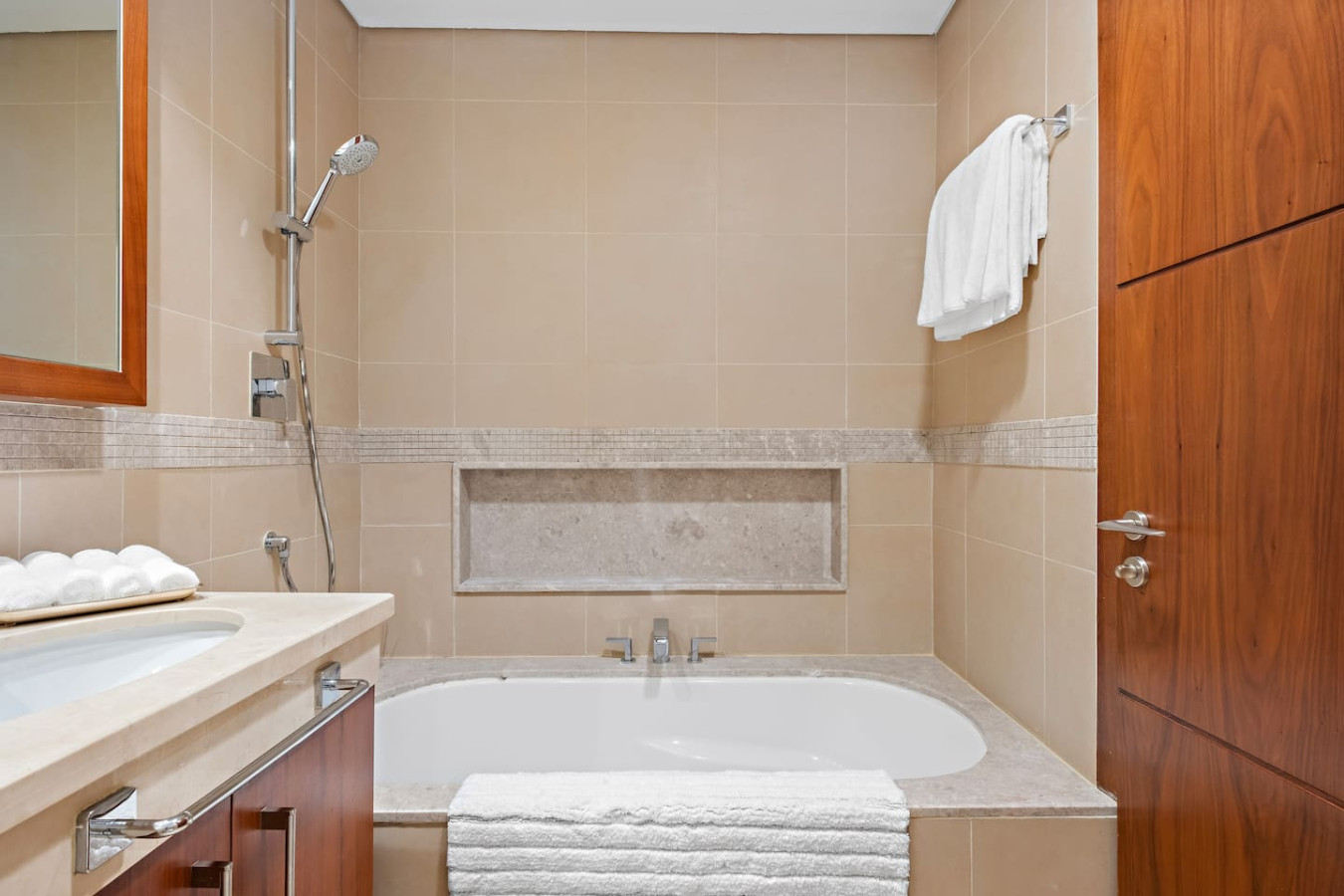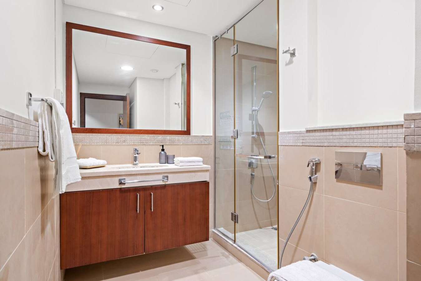 The bathroom is stocked with fresh towels and essential toiletries, so you don’t have to worry about bringing your own.