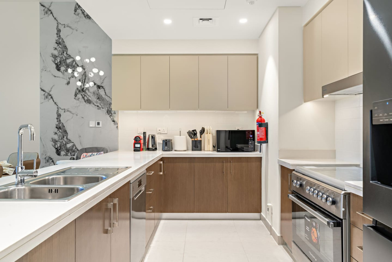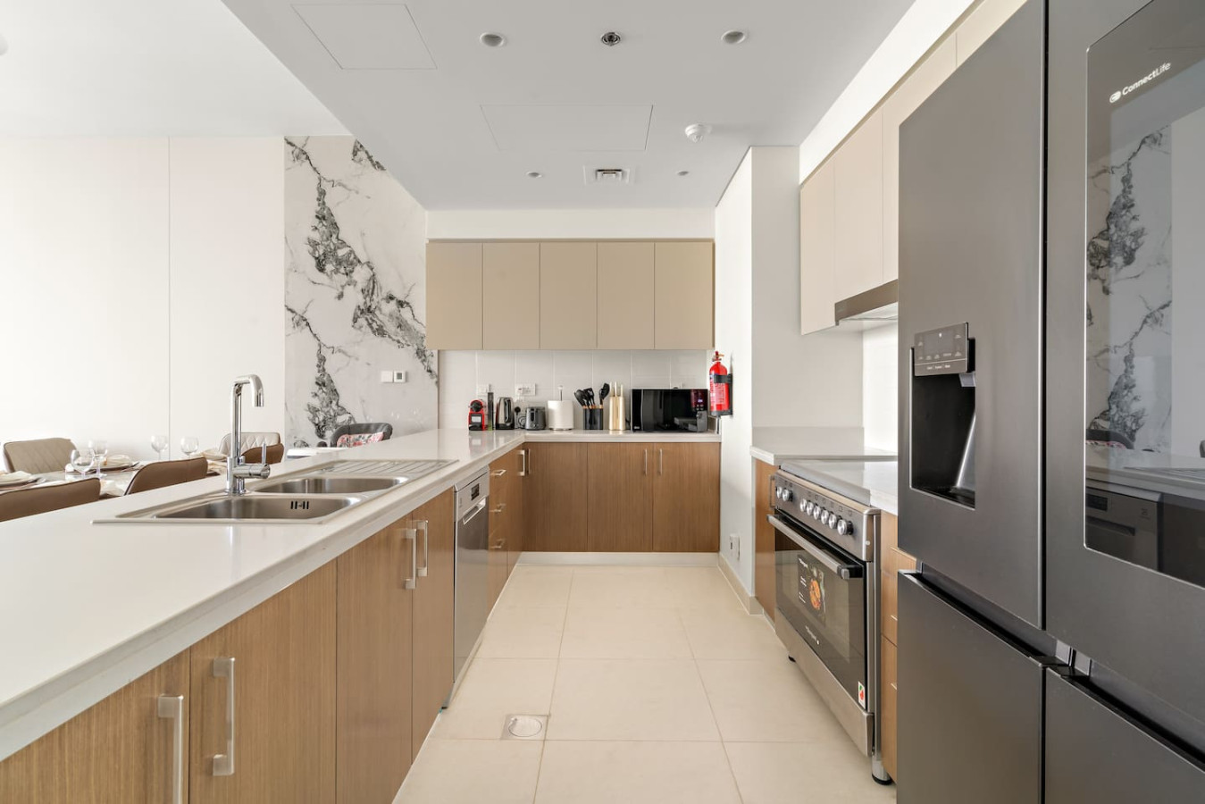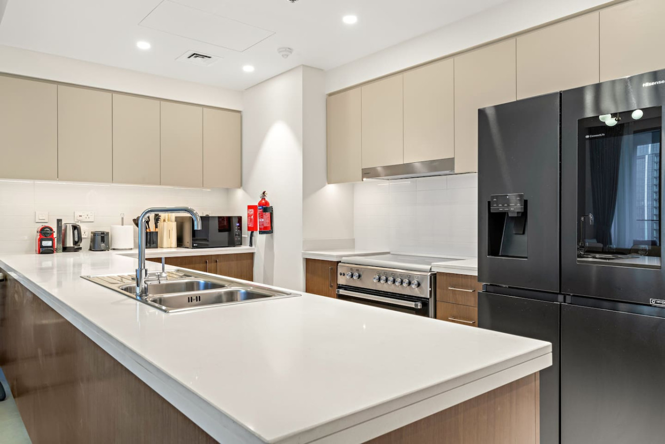 It is fully equipped with stainless-steel cooking appliances that make it suitable for preparing any meal, whether a simple breakfast, quick snack or a three-course gourmet dinner. Spacious quartz countertops and a central kitchen island provide plenty of room to work your MasterChef magic.