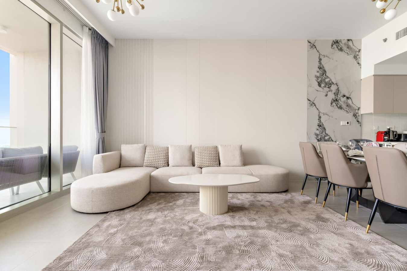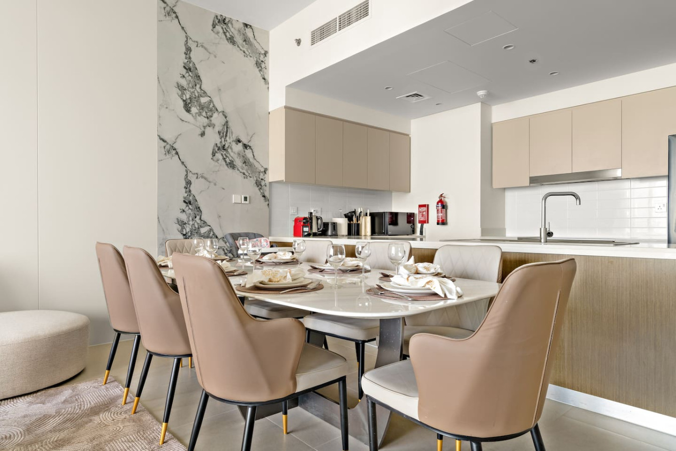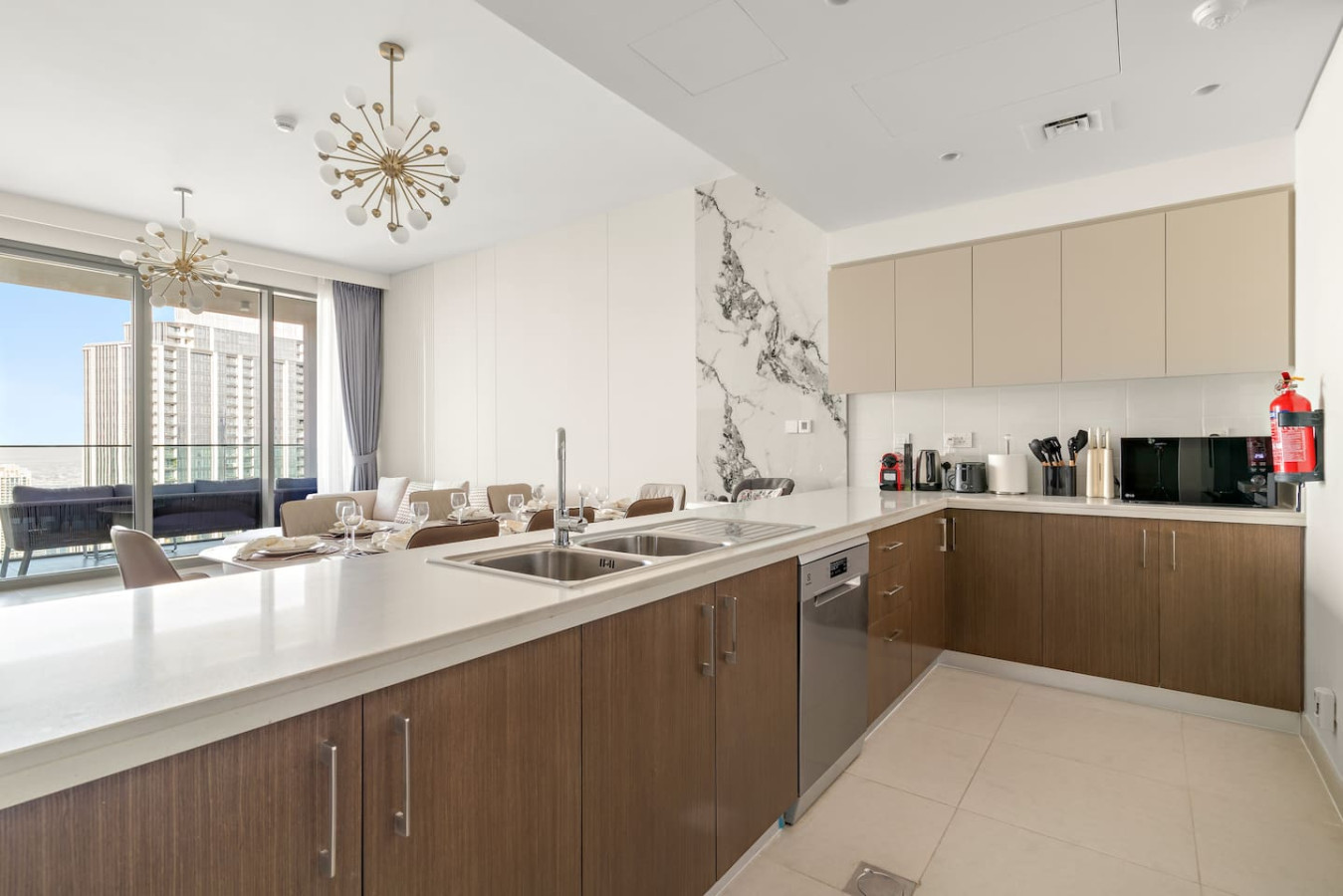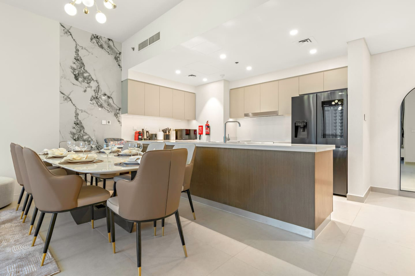 It is fully equipped with stainless-steel cooking appliances that make it suitable for preparing any meal, whether a simple breakfast, quick snack or a three-course gourmet dinner. Spacious quartz countertops and a central kitchen island provide plenty of room to work your MasterChef magic.