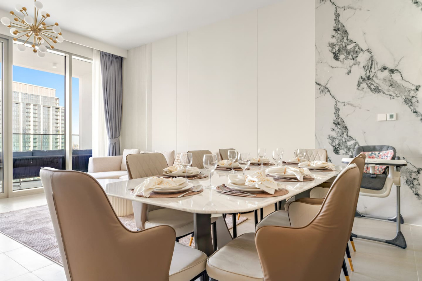 Have a few drinks in the living room while the food is getting ready. Once it’s done, serve it at the inviting dining table and enjoy a tasty meal with your loved ones.