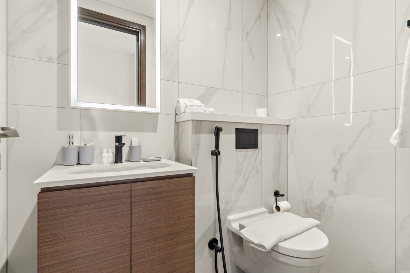 The bathroom is stocked with fresh towels and essential toiletries, so you don’t have to worry about bringing your own.