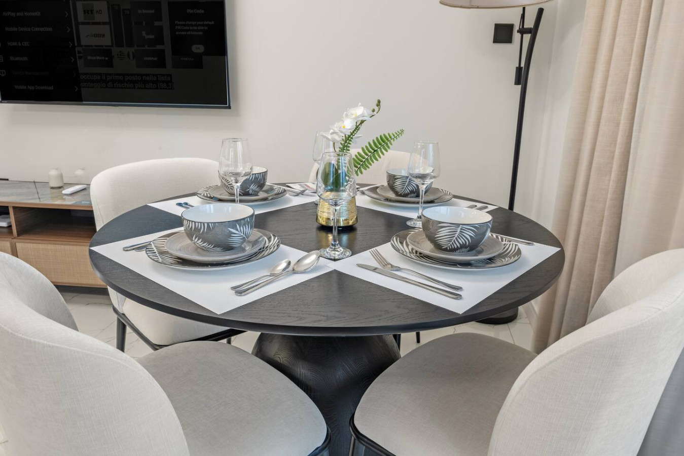 Have a few drinks in the living room while the food is getting ready. Once it’s done, serve it at the inviting dining table and enjoy a tasty meal with your loved ones.