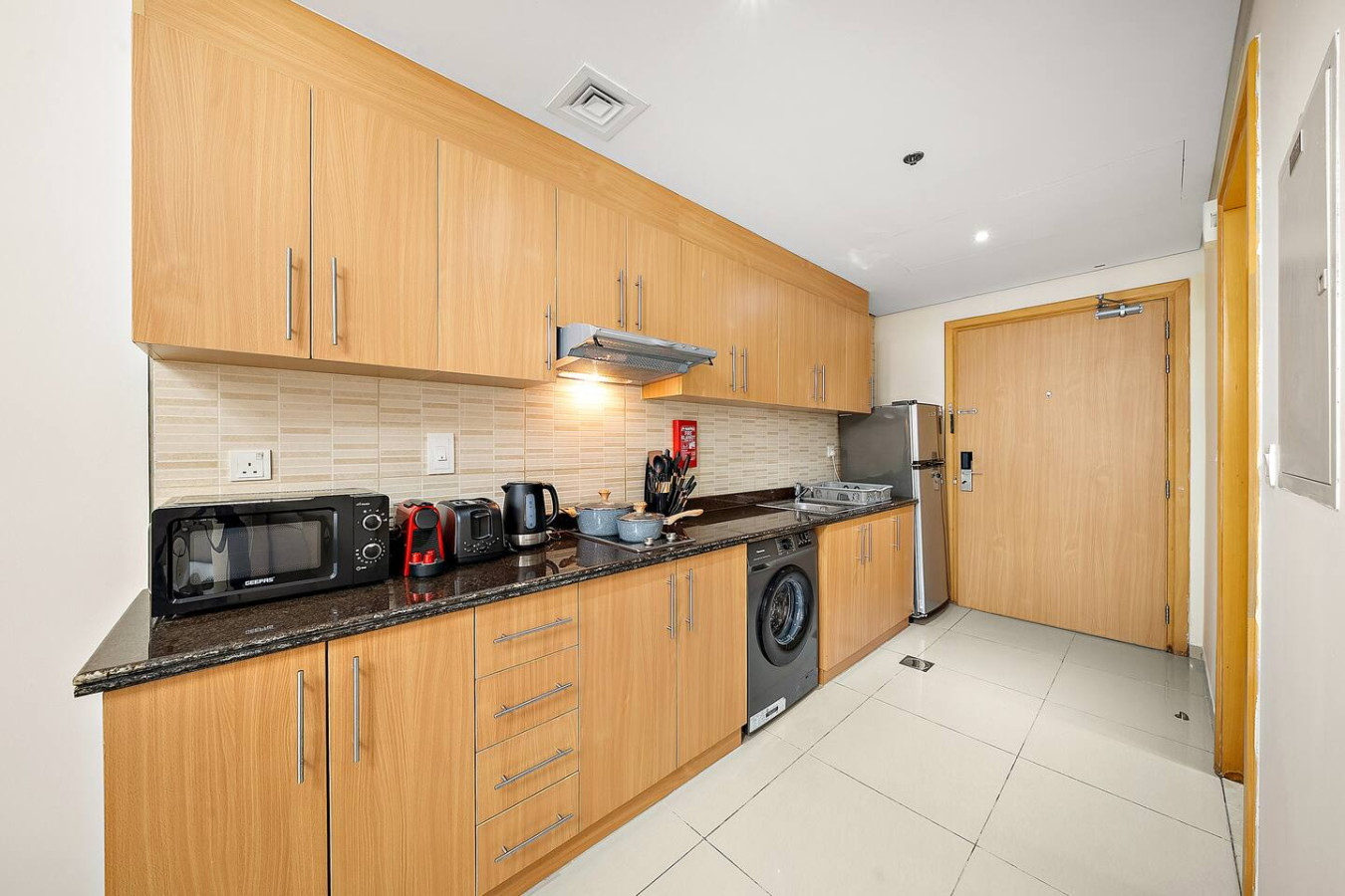 It is fully equipped with stainless-steel cooking appliances that make it suitable for preparing any meal, whether a simple breakfast, quick snack or a three-course gourmet dinner. Spacious quartz countertops and a central kitchen island provide plenty of room to work your MasterChef magic.