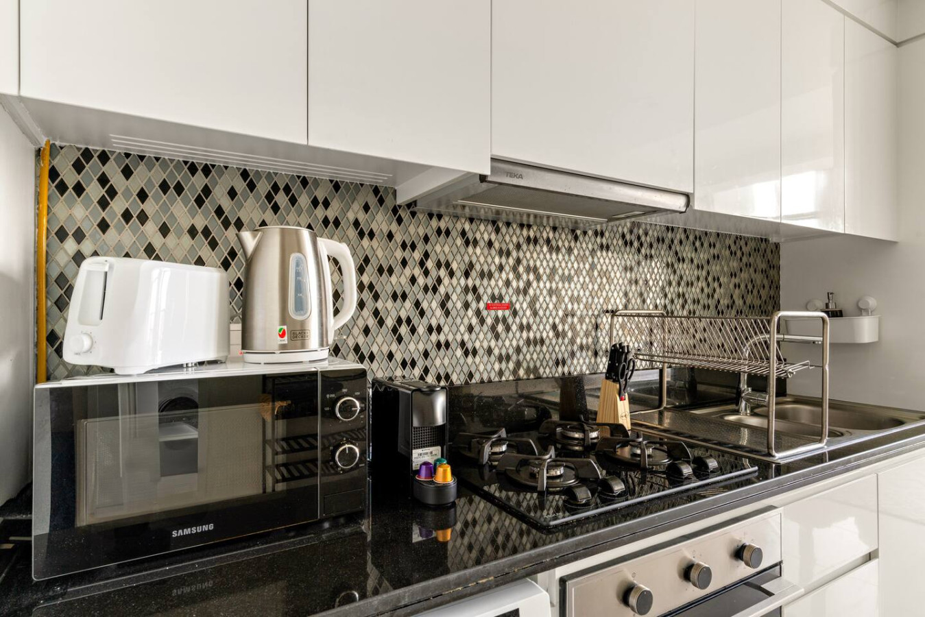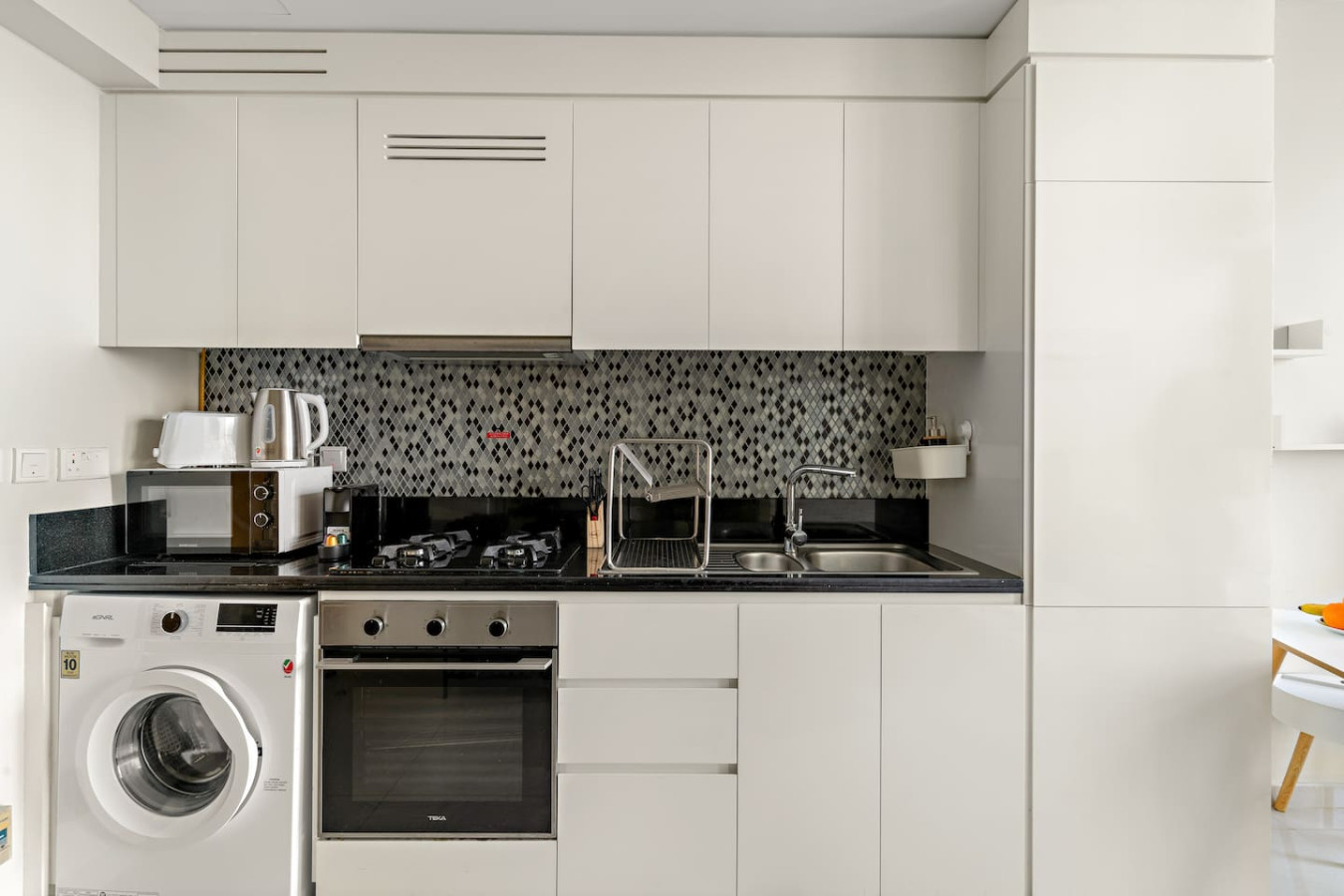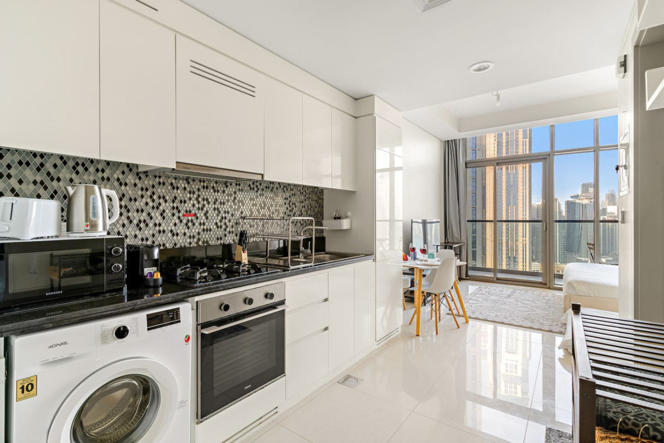 It is fully equipped with stainless-steel cooking appliances that make it suitable for preparing any meal, whether a simple breakfast, quick snack or a three-course gourmet dinner. Spacious quartz countertops and a central kitchen island provide plenty of room to work your MasterChef magic.