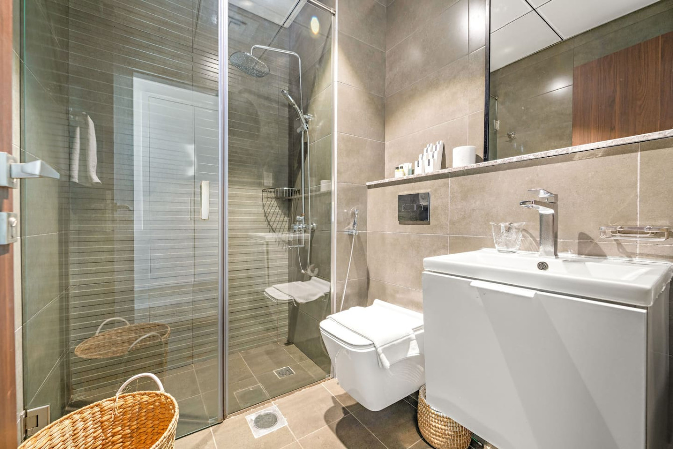 The bathroom is stocked with fresh towels and essential toiletries, so you don’t have to worry about bringing your own.
