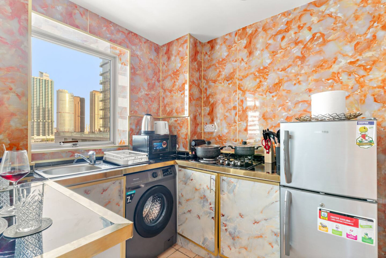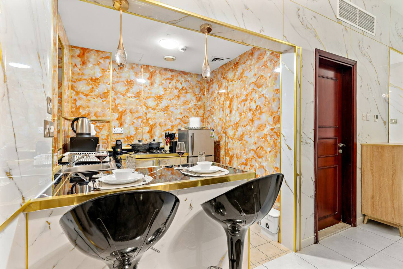 Fully equipped kitchen with marble finishes & high-quality appliances, ideal for preparing anything from a quick breakfast to a gourmet dinner.