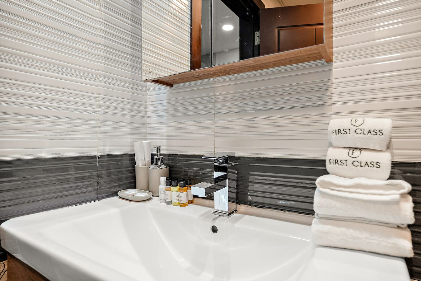 The bathroom is stocked with fresh towels and essential toiletries, so you don’t have to worry about bringing your own.