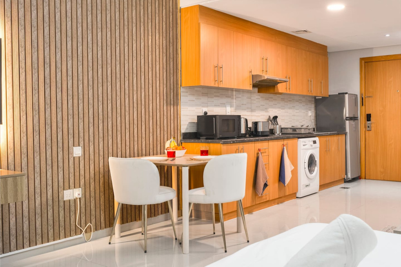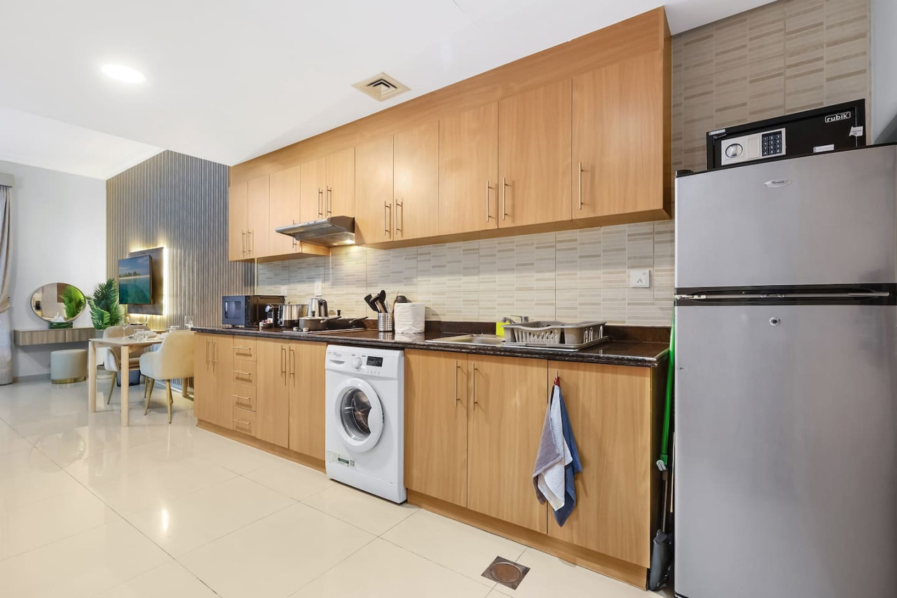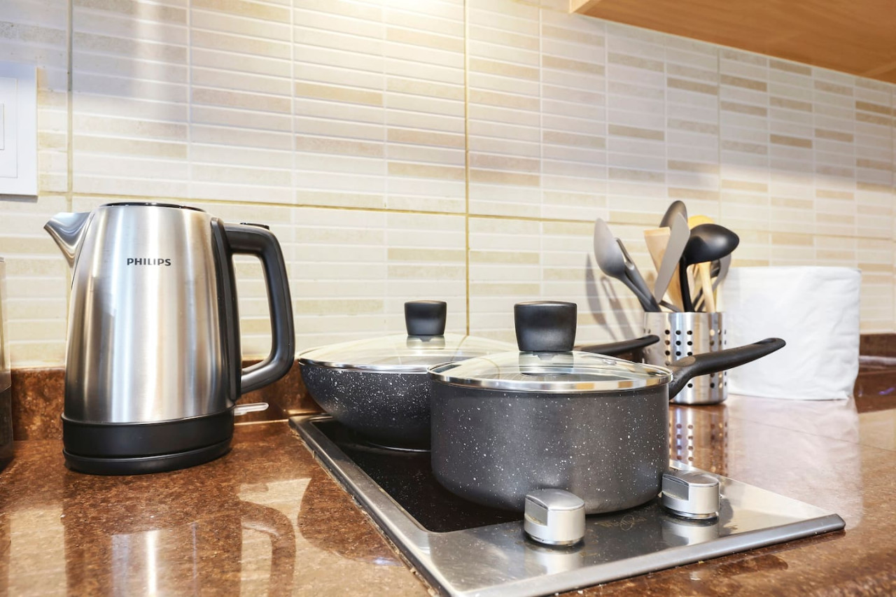 It is fully equipped with stainless-steel cooking appliances that make it suitable for preparing any meal, whether a simple breakfast, quick snack or a three-course gourmet dinner. Spacious quartz countertops and a central kitchen island provide plenty of room to work your MasterChef magic.