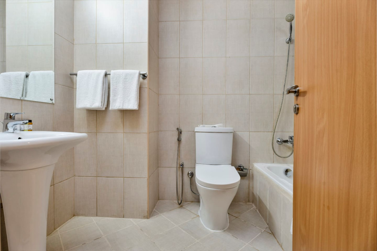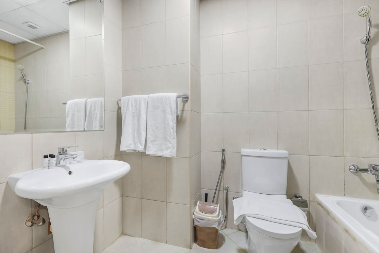 The bathroom is stocked with fresh towels and essential toiletries, so you don’t have to worry about bringing your own.