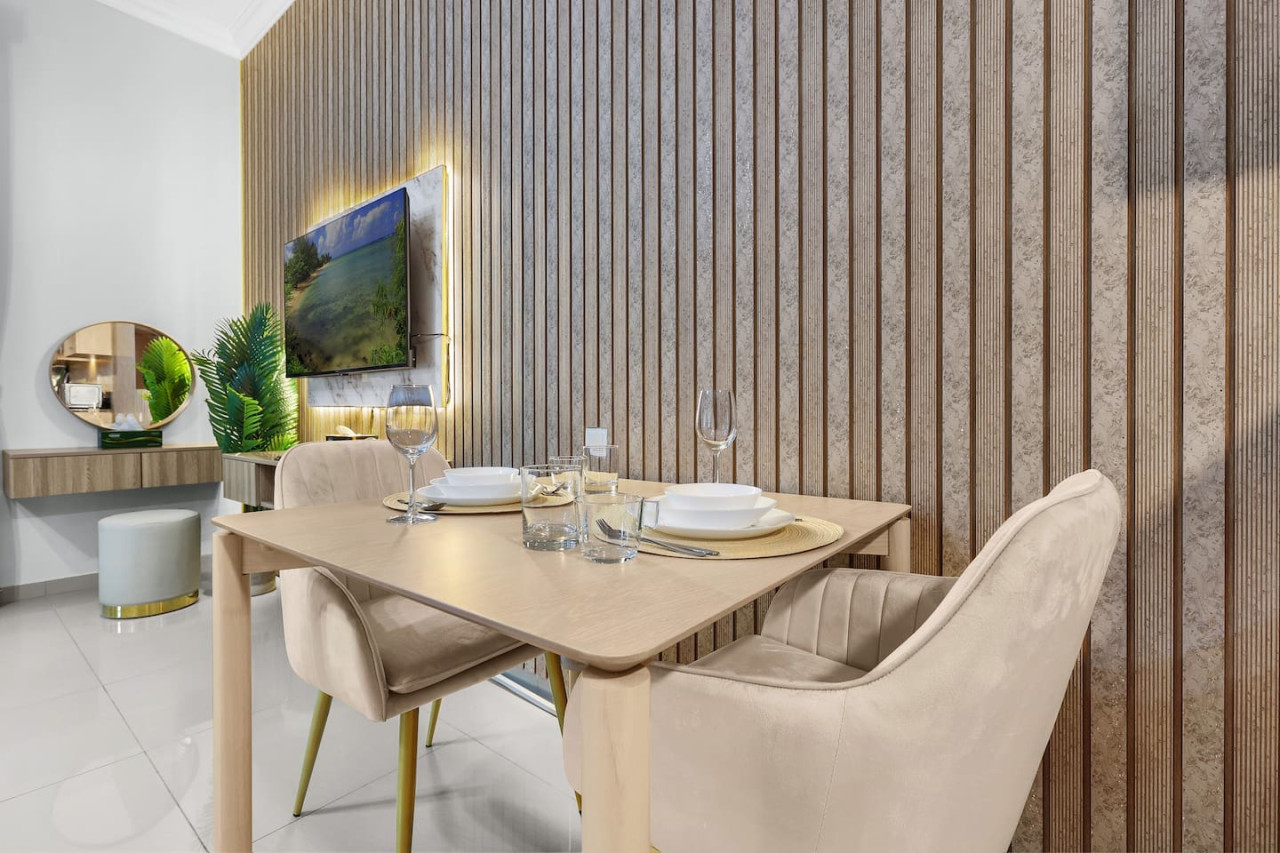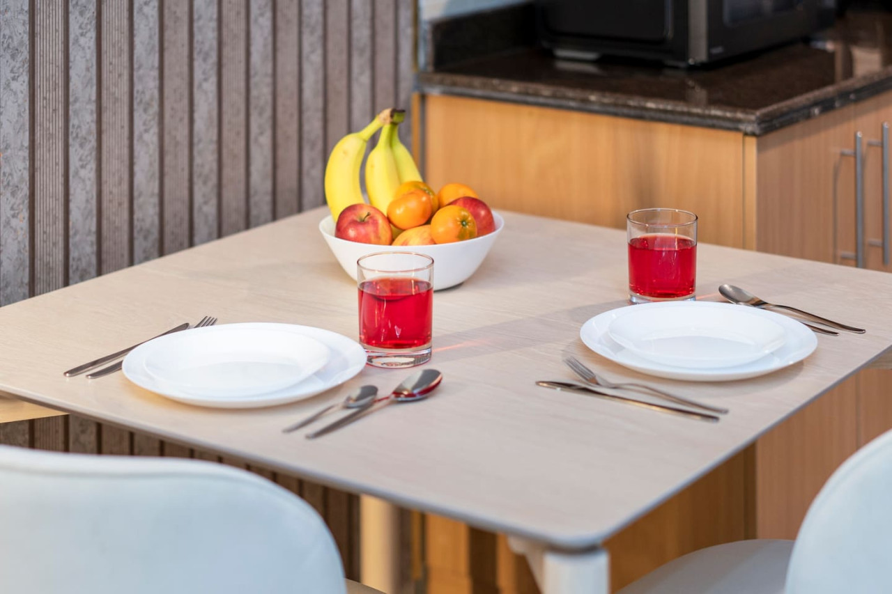 Have a few drinks in the living room while the food is getting ready. Once it’s done, serve it at the inviting dining table and enjoy a tasty meal with your loved ones.