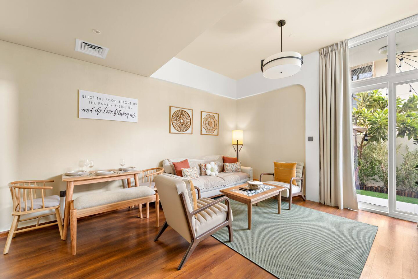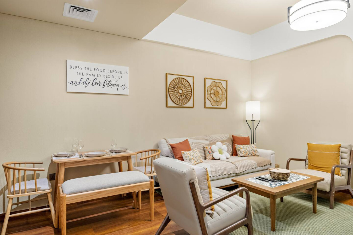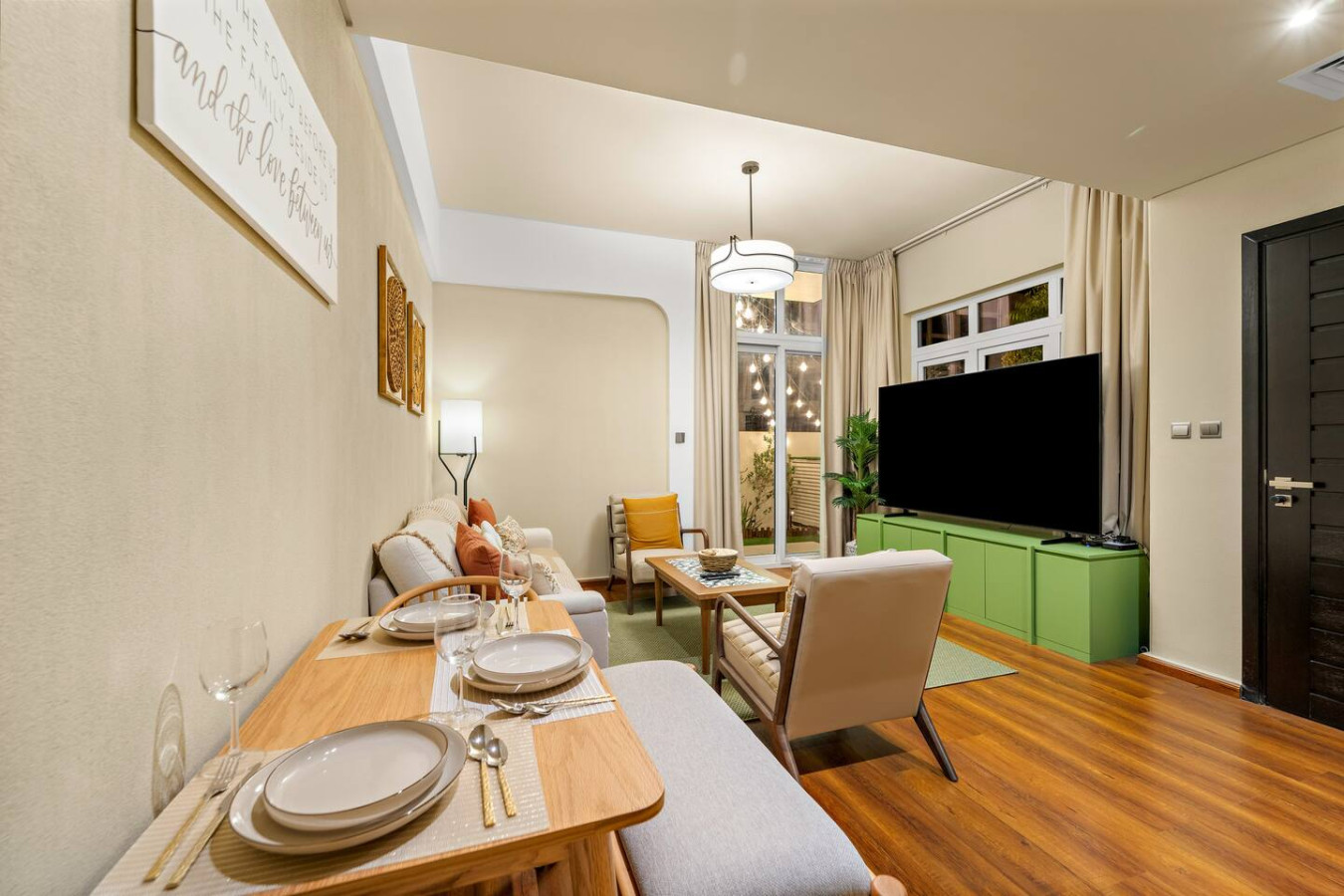 Have a few drinks in the living room while the food is getting ready. Once it’s done, serve it at the inviting dining table and enjoy a tasty meal with your loved ones.