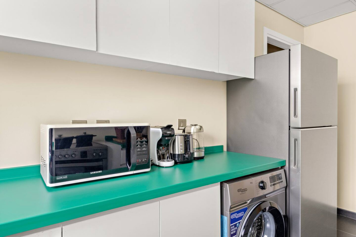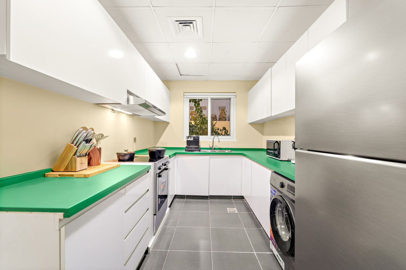 It is fully equipped with stainless-steel cooking appliances that make it suitable for preparing any meal, whether a simple breakfast, quick snack or a three-course gourmet dinner. Spacious quartz countertops and a central kitchen island provide plenty of room to work your MasterChef magic.