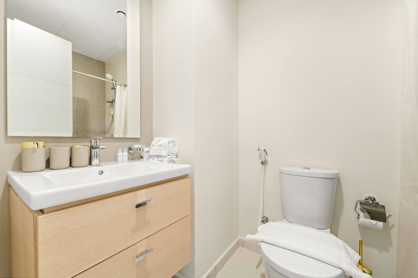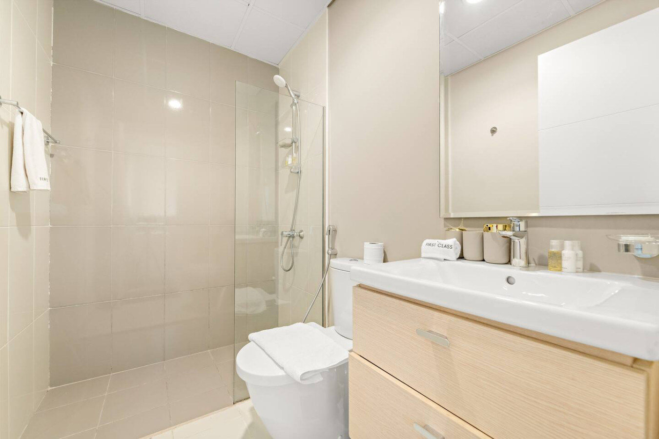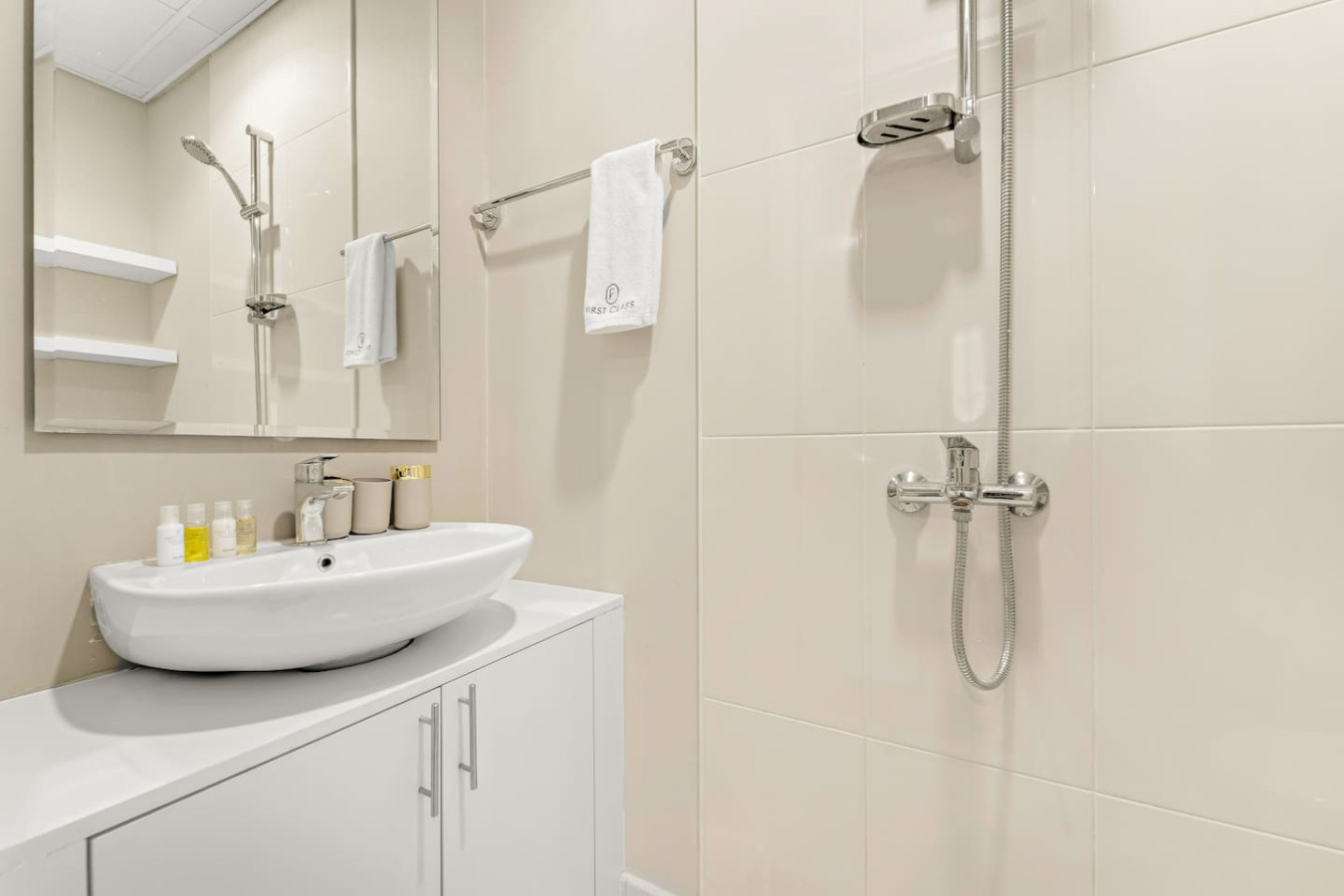 The bathroom is stocked with fresh towels and essential toiletries, so you don’t have to worry about bringing your own.