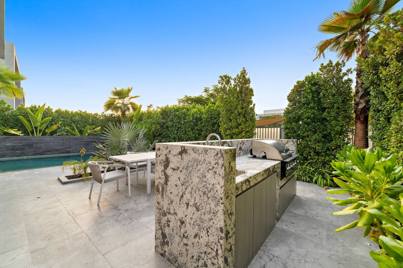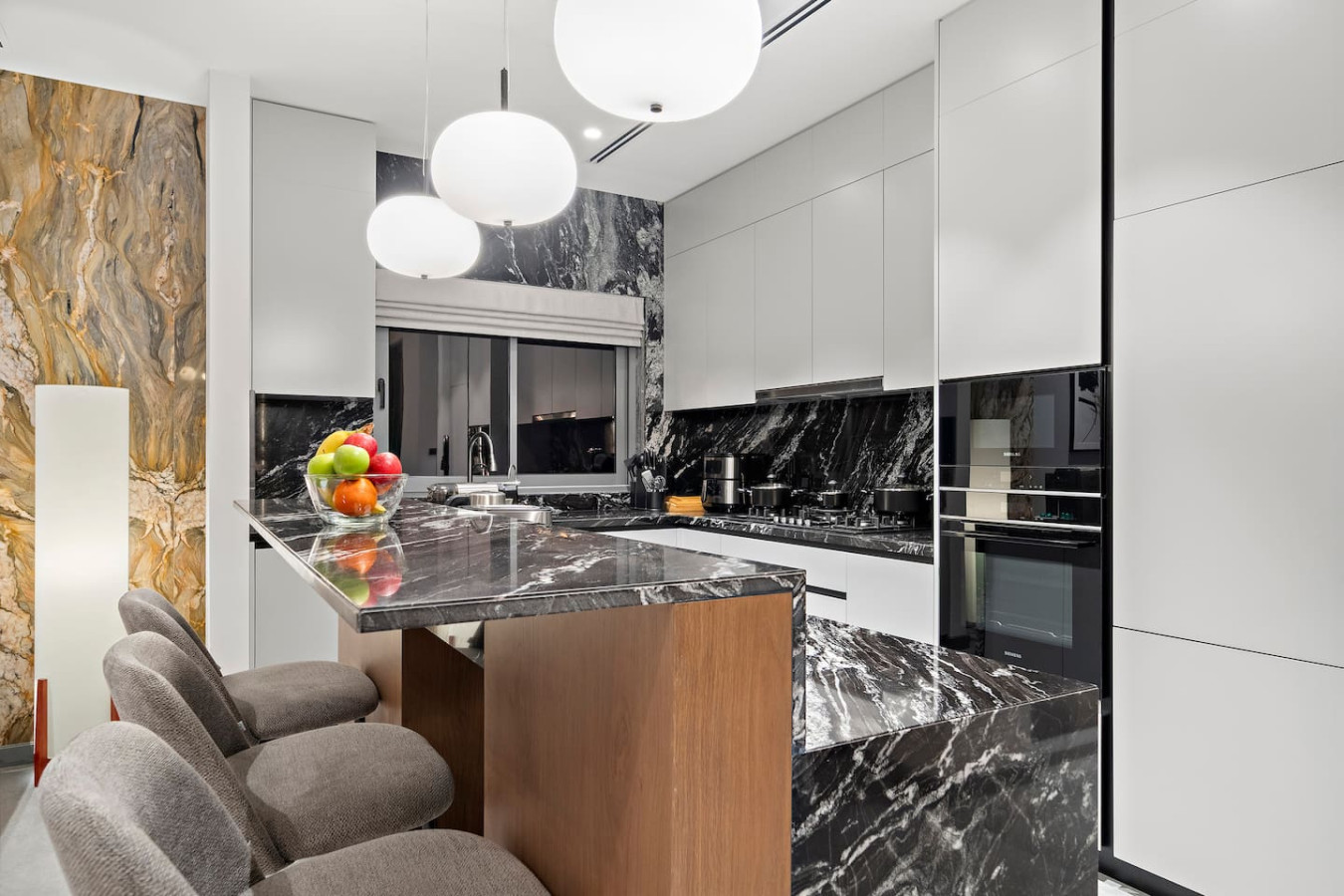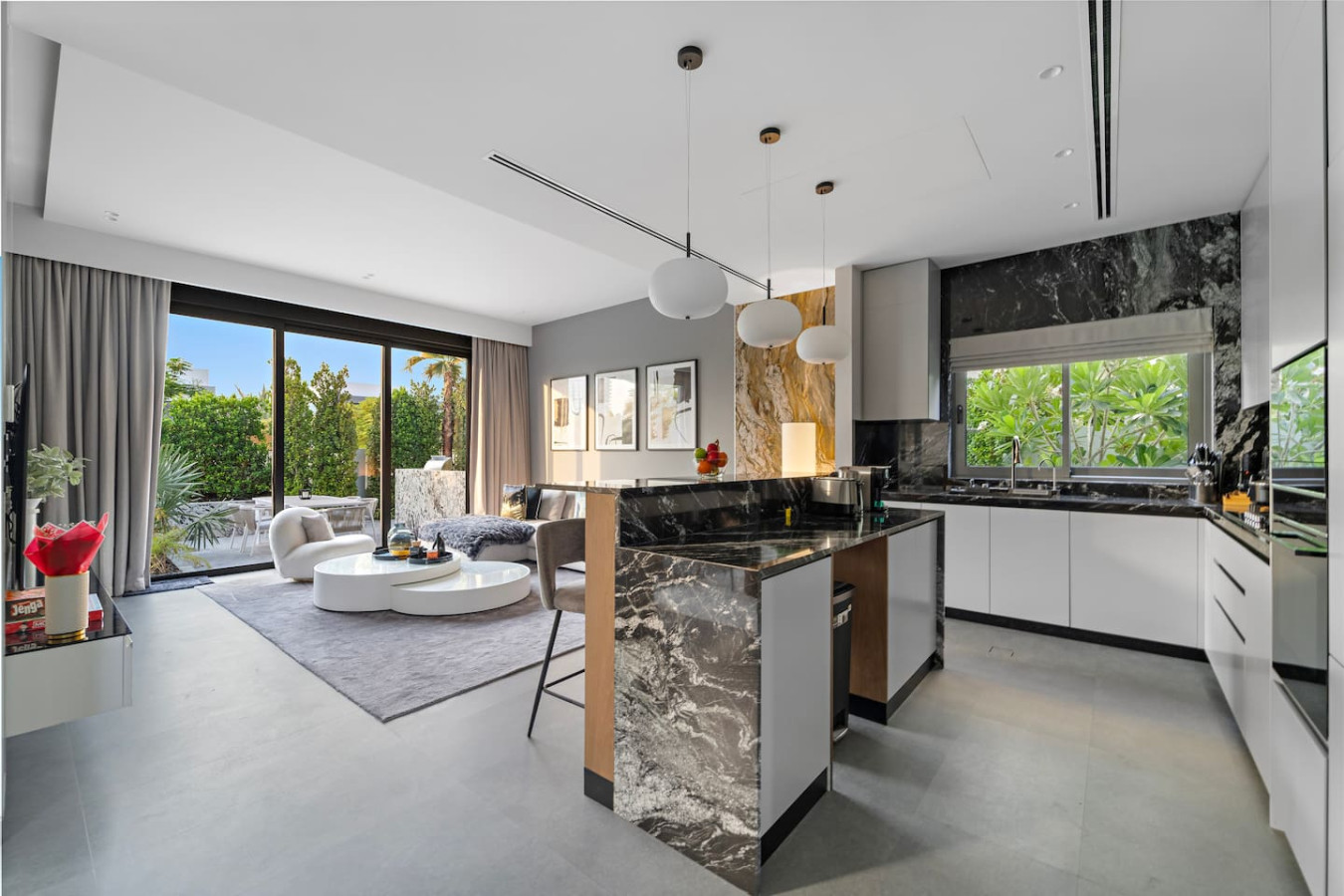 It is fully equipped with stainless-steel cooking appliances that make it suitable for preparing any meal, whether a simple breakfast, quick snack or a three-course gourmet dinner. Spacious quartz countertops and a central kitchen island provide plenty of room to work your MasterChef magic.