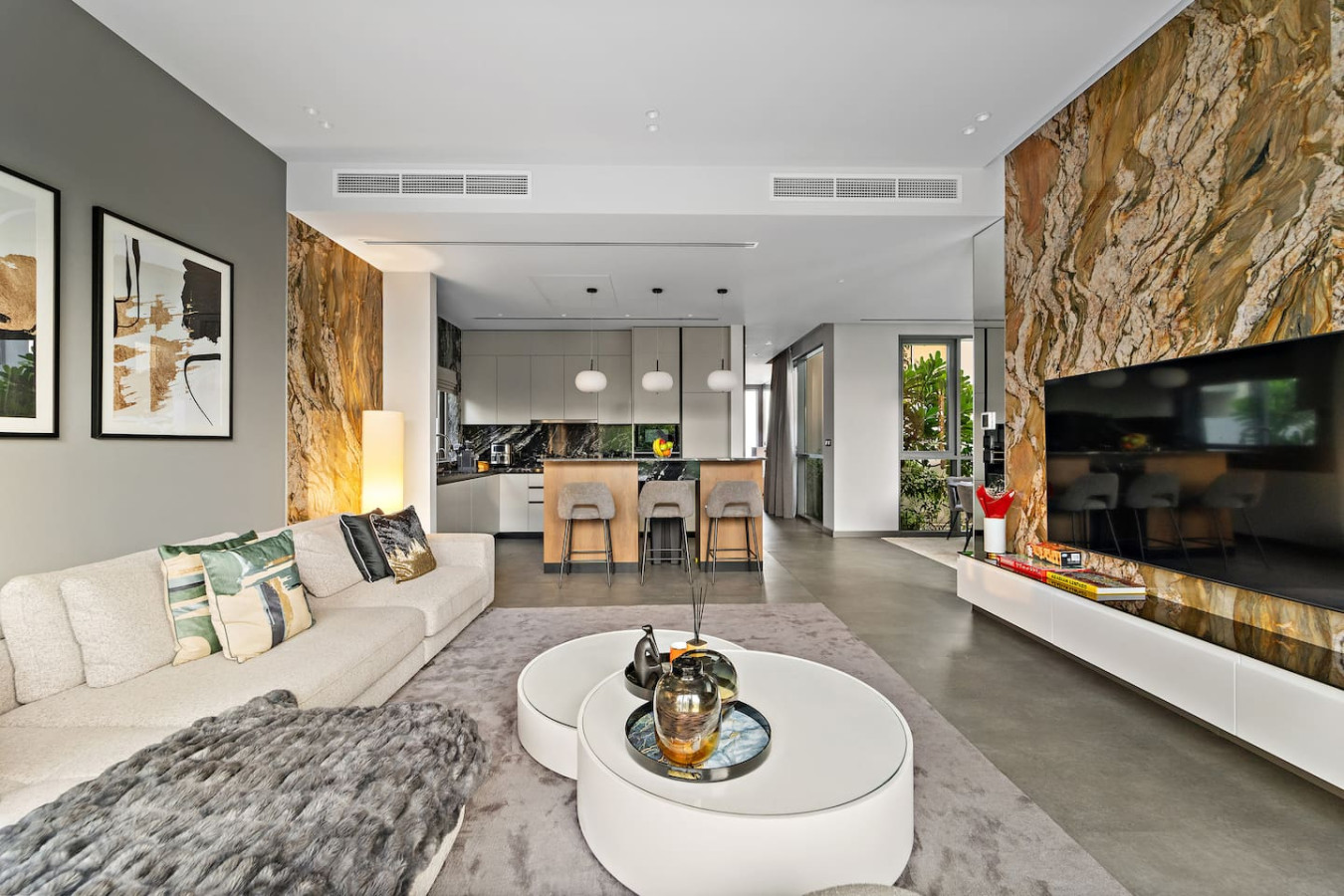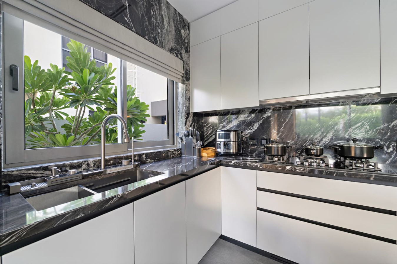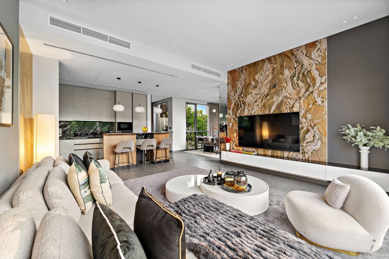 It is fully equipped with stainless-steel cooking appliances that make it suitable for preparing any meal, whether a simple breakfast, quick snack or a three-course gourmet dinner. Spacious quartz countertops and a central kitchen island provide plenty of room to work your MasterChef magic.