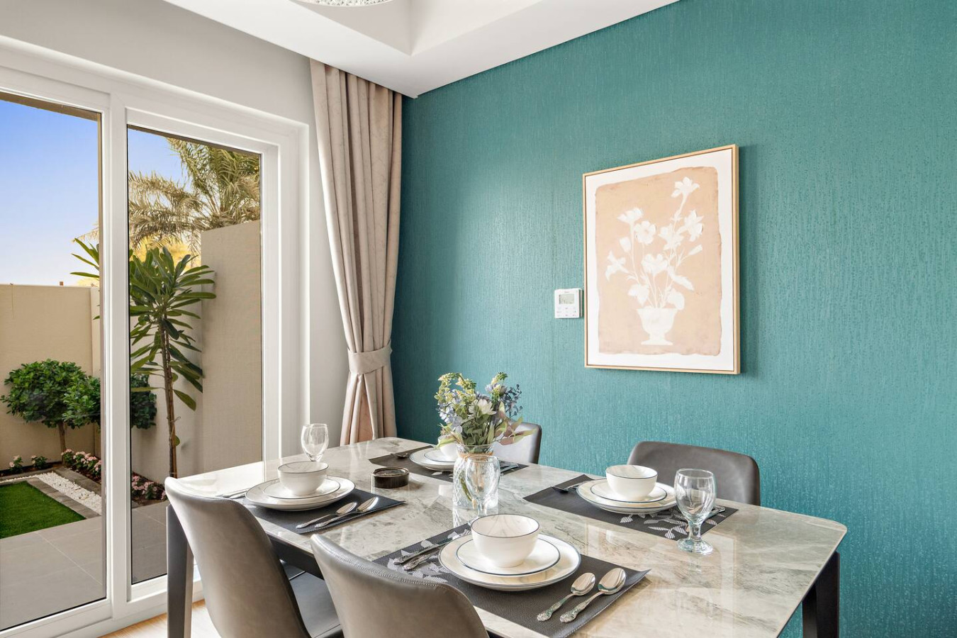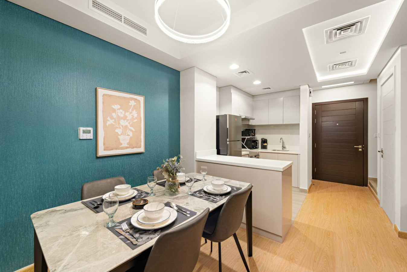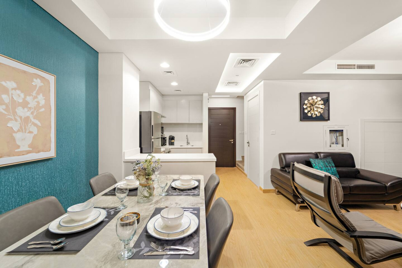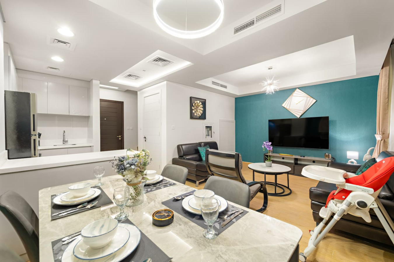 Have a few drinks in the living room while the food is getting ready. Once it’s done, serve it at the inviting dining table and enjoy a tasty meal with your loved ones.