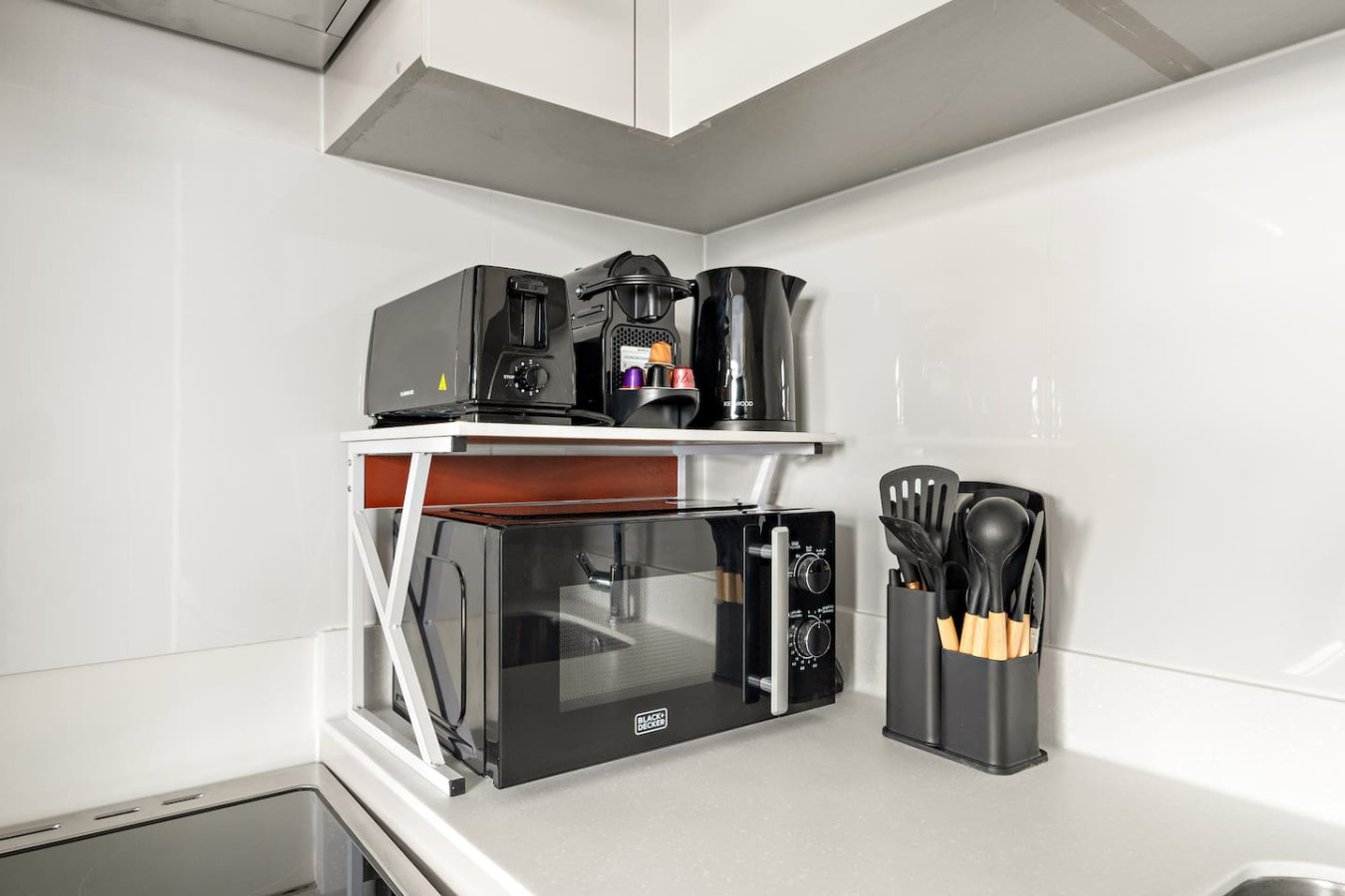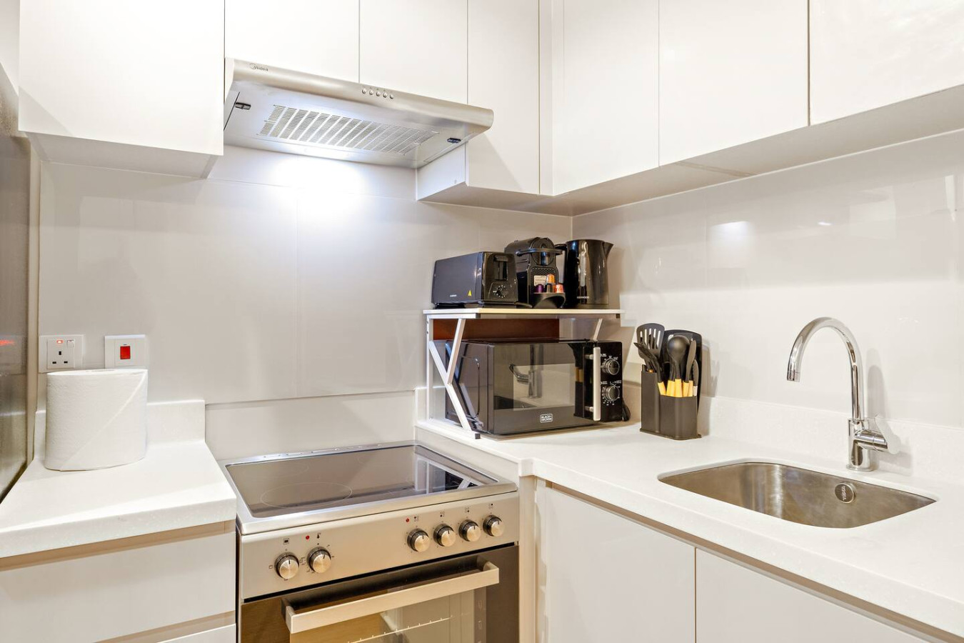 It is fully equipped with stainless-steel cooking appliances that make it suitable for preparing any meal, whether a simple breakfast, quick snack or a three-course gourmet dinner. Spacious quartz countertops and a central kitchen island provide plenty of room to work your MasterChef magic.