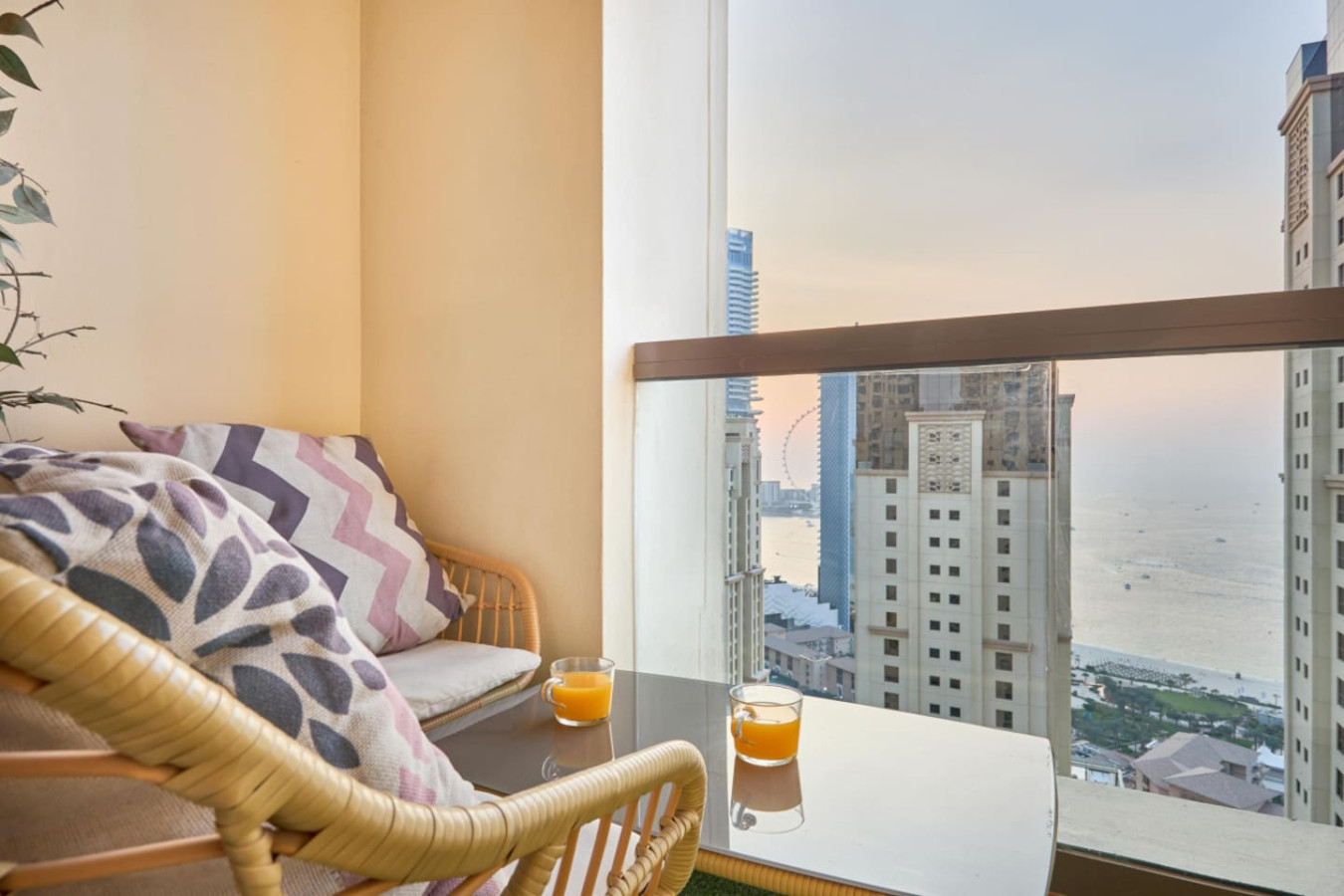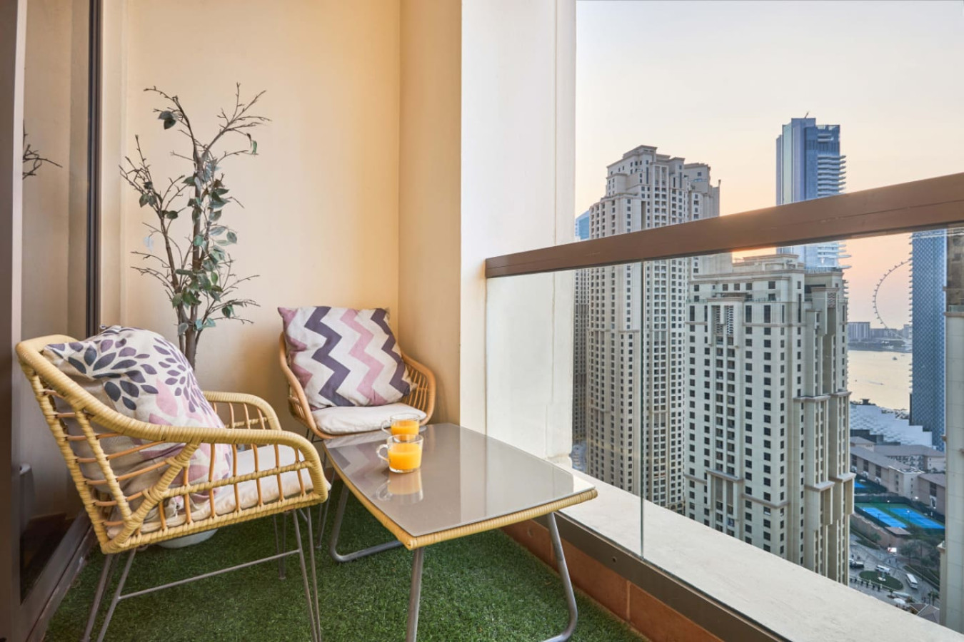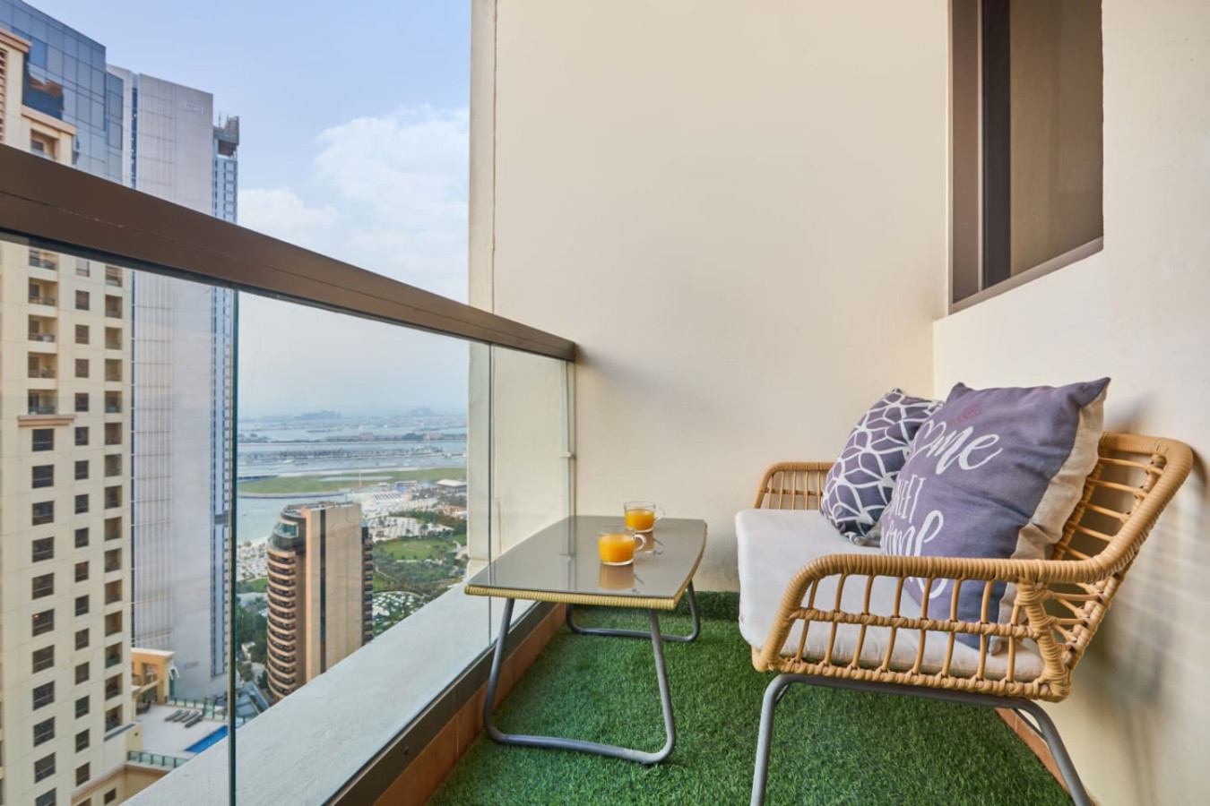 Balcony: Outdoor seating area ideal for morning coffee or evening relaxation with Dubai Eye, The Palm, and sea views.