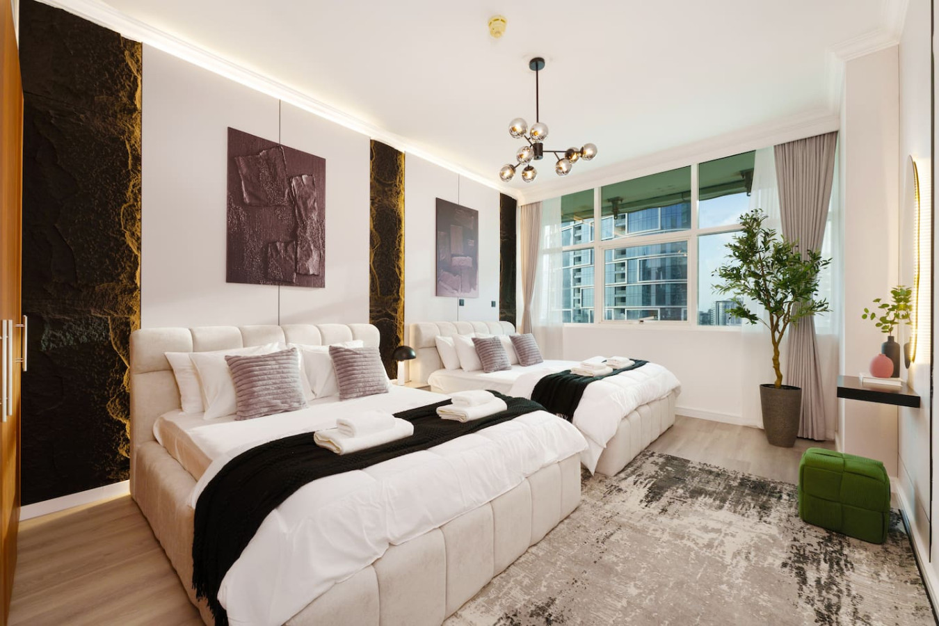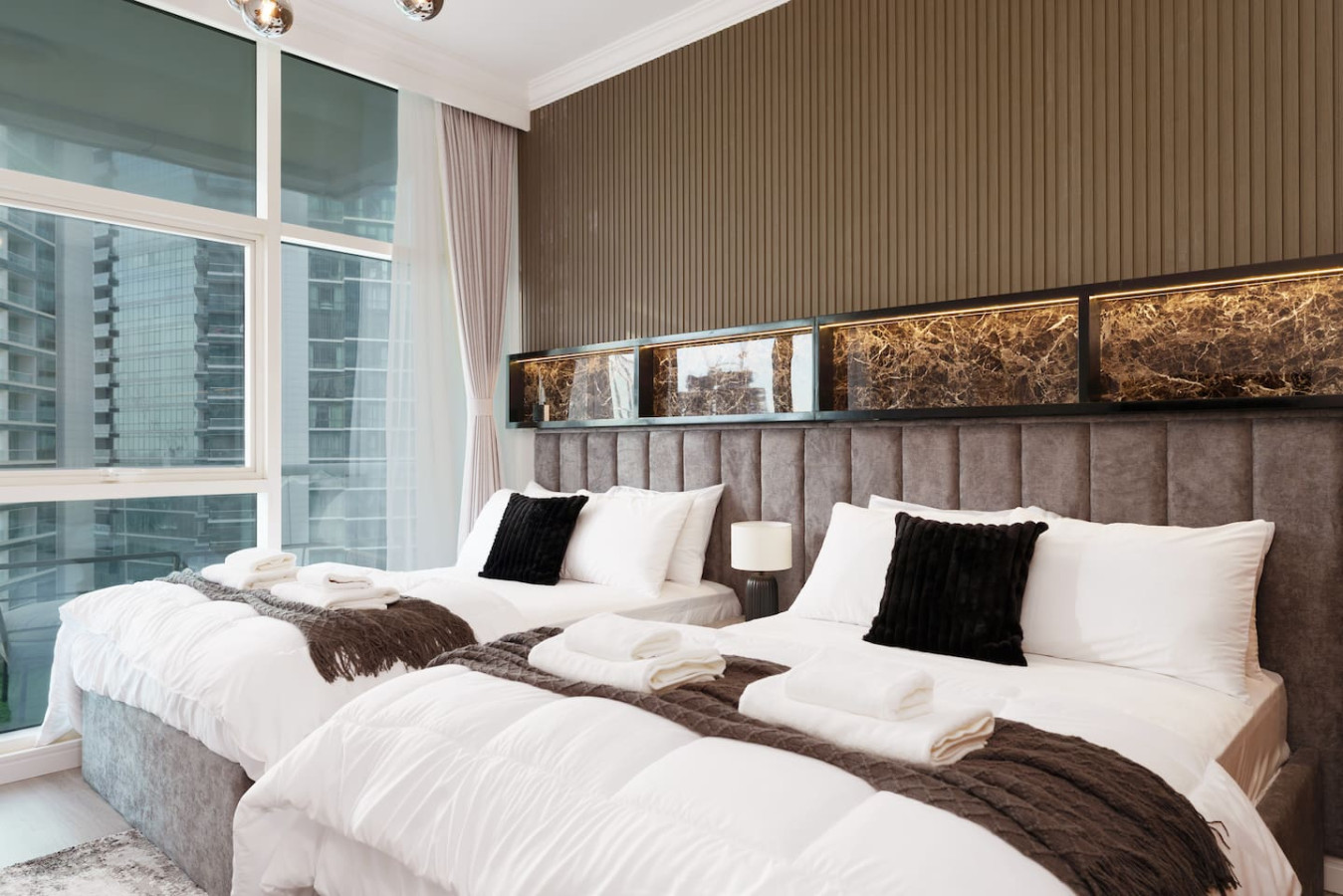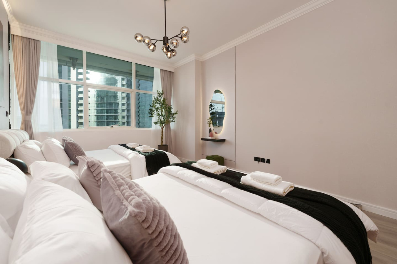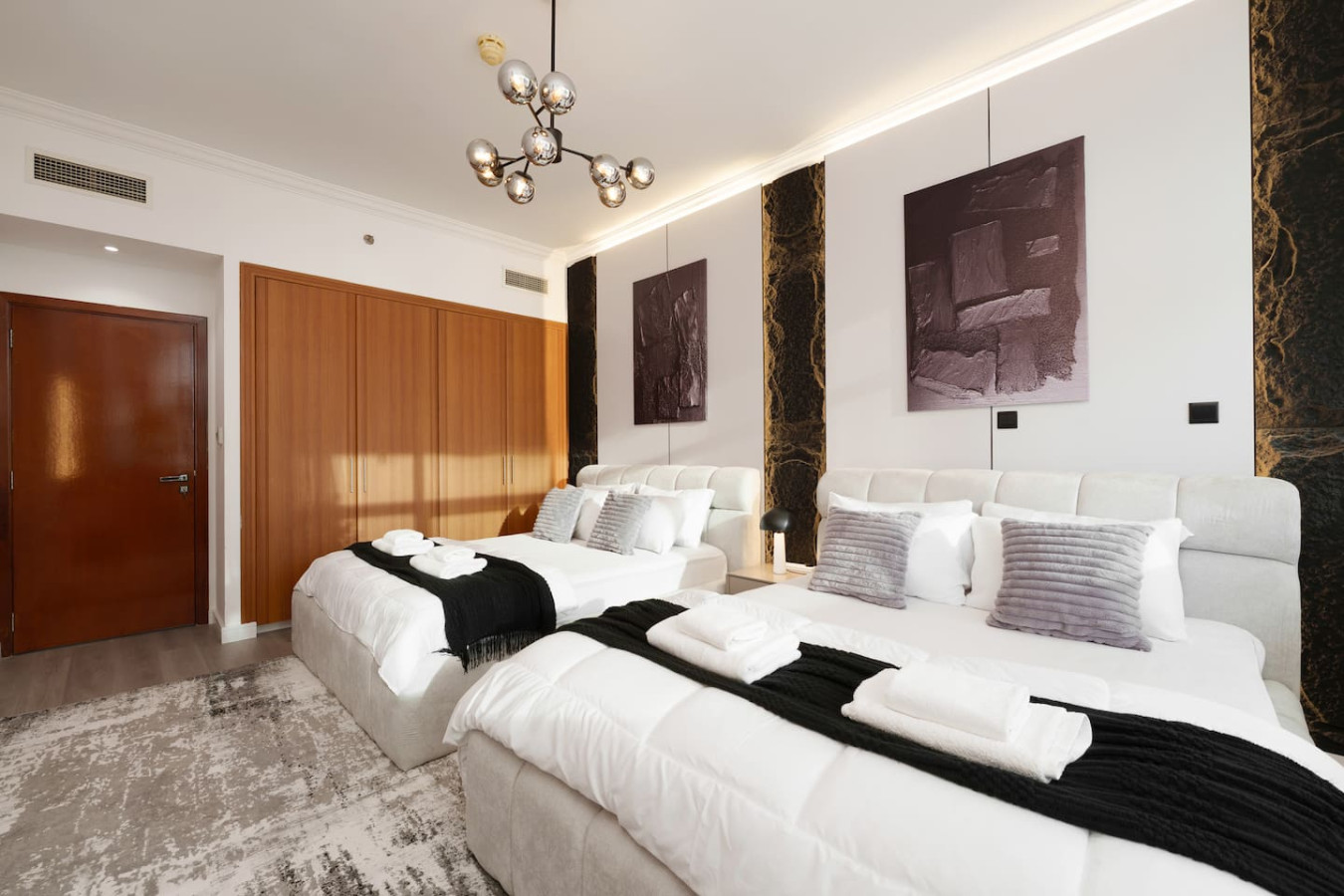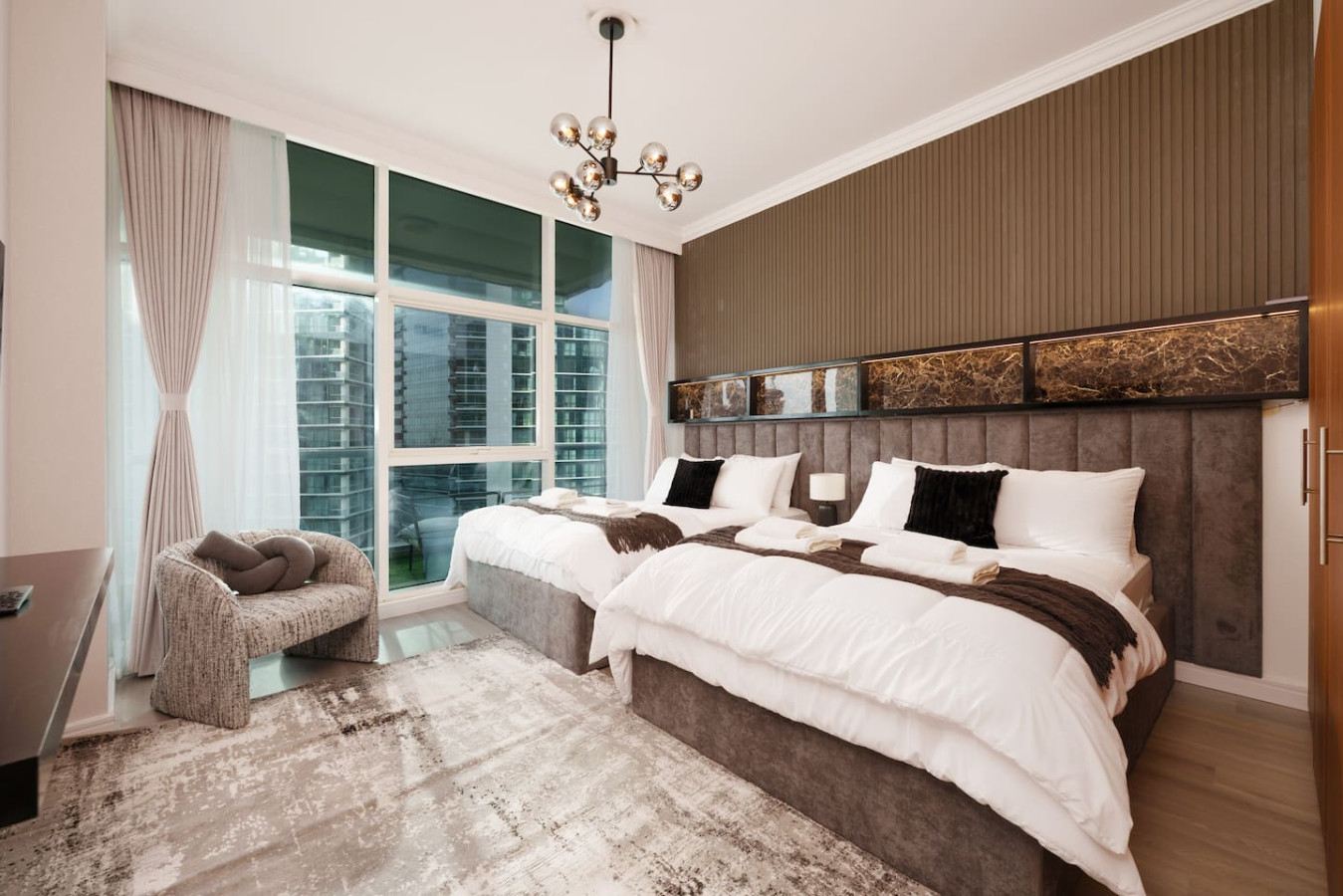 Step into a sophisticated and welcoming environment, where every detail has been thought out for your comfort. This stunning apartment is located in the prestigious Dorra Bay building, right in the heart of JBR. Designed with meticulous attention to detail and tailored for your comfort, this spacious home seamlessly combines luxury, functionality, and an unbeatable location—perfect for families or large groups of up to 14 guests.