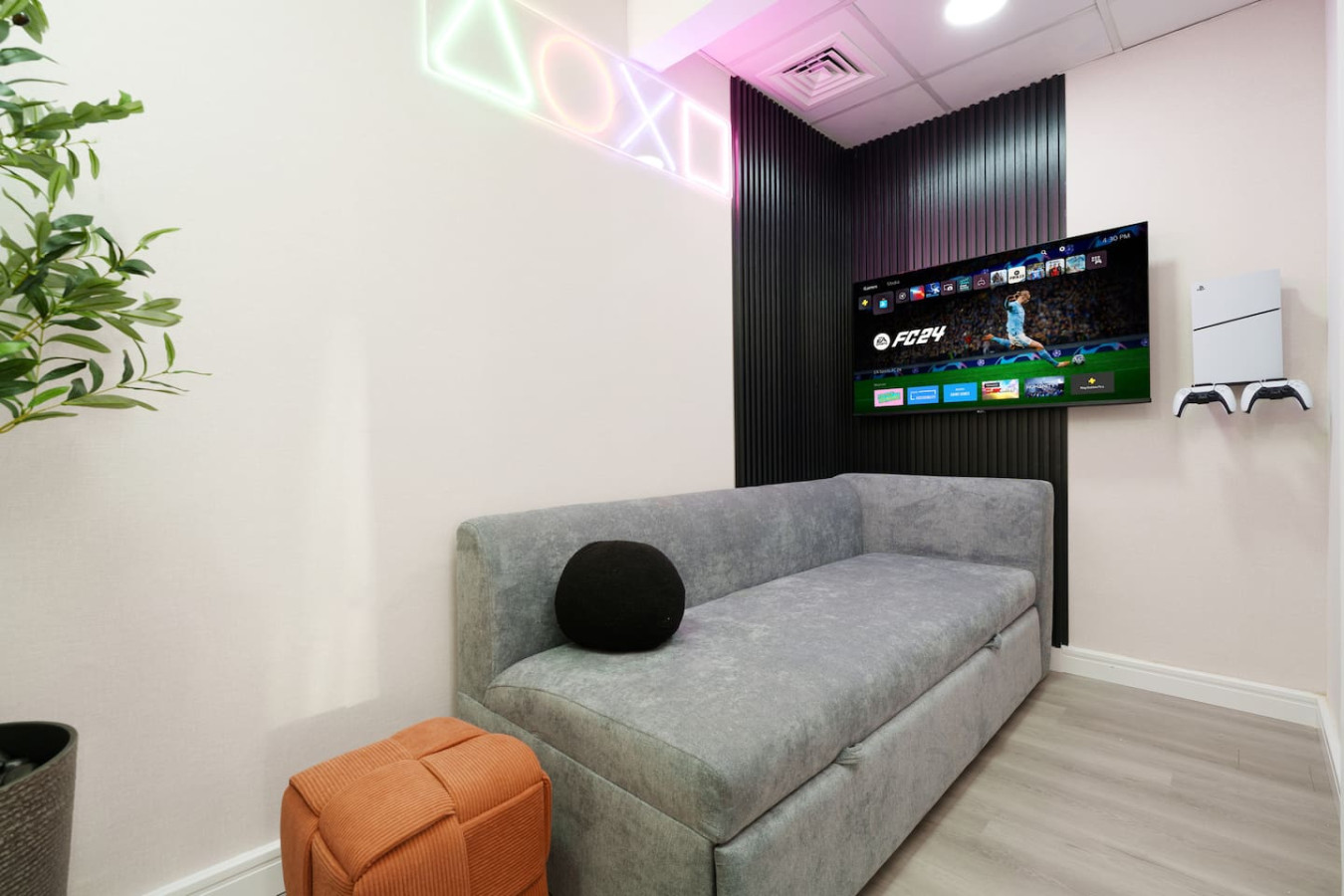 Relax in a spacious living room designed for comfort. The sofa bed offers space for additional guests, while Smart TVs and high-speed WiFi provide endless entertainment throughout your stay.