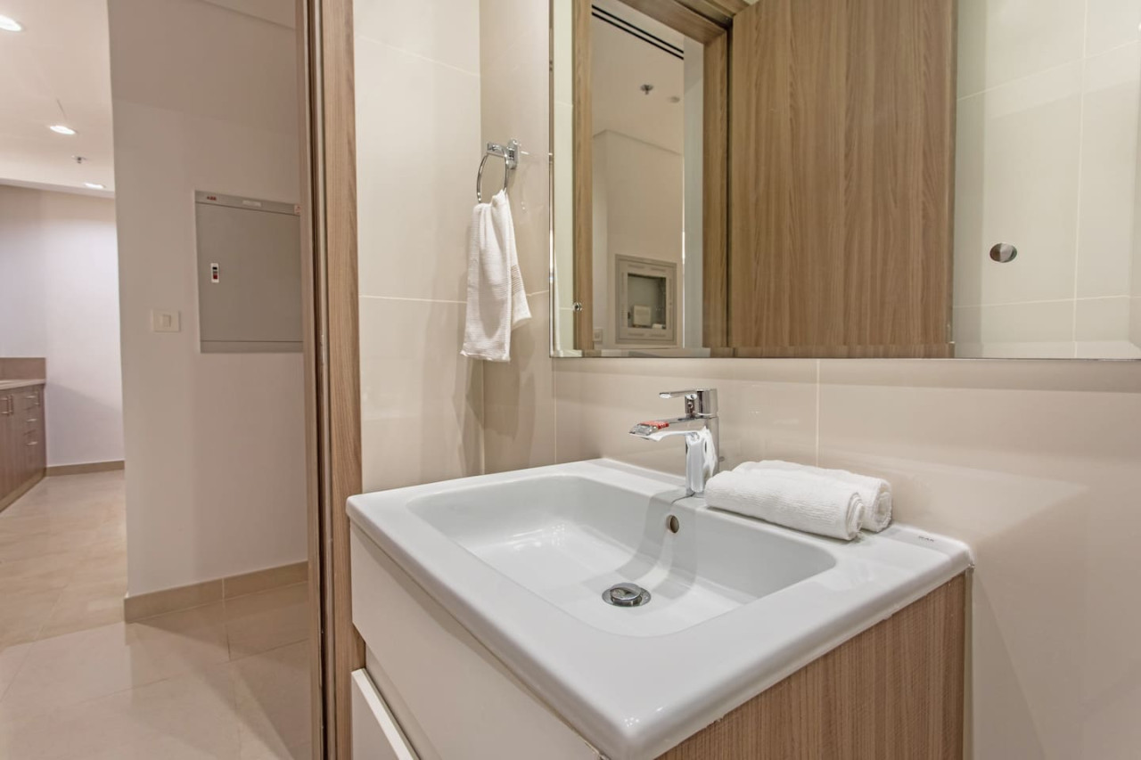 • Modern bathroom with fresh towels and essentials