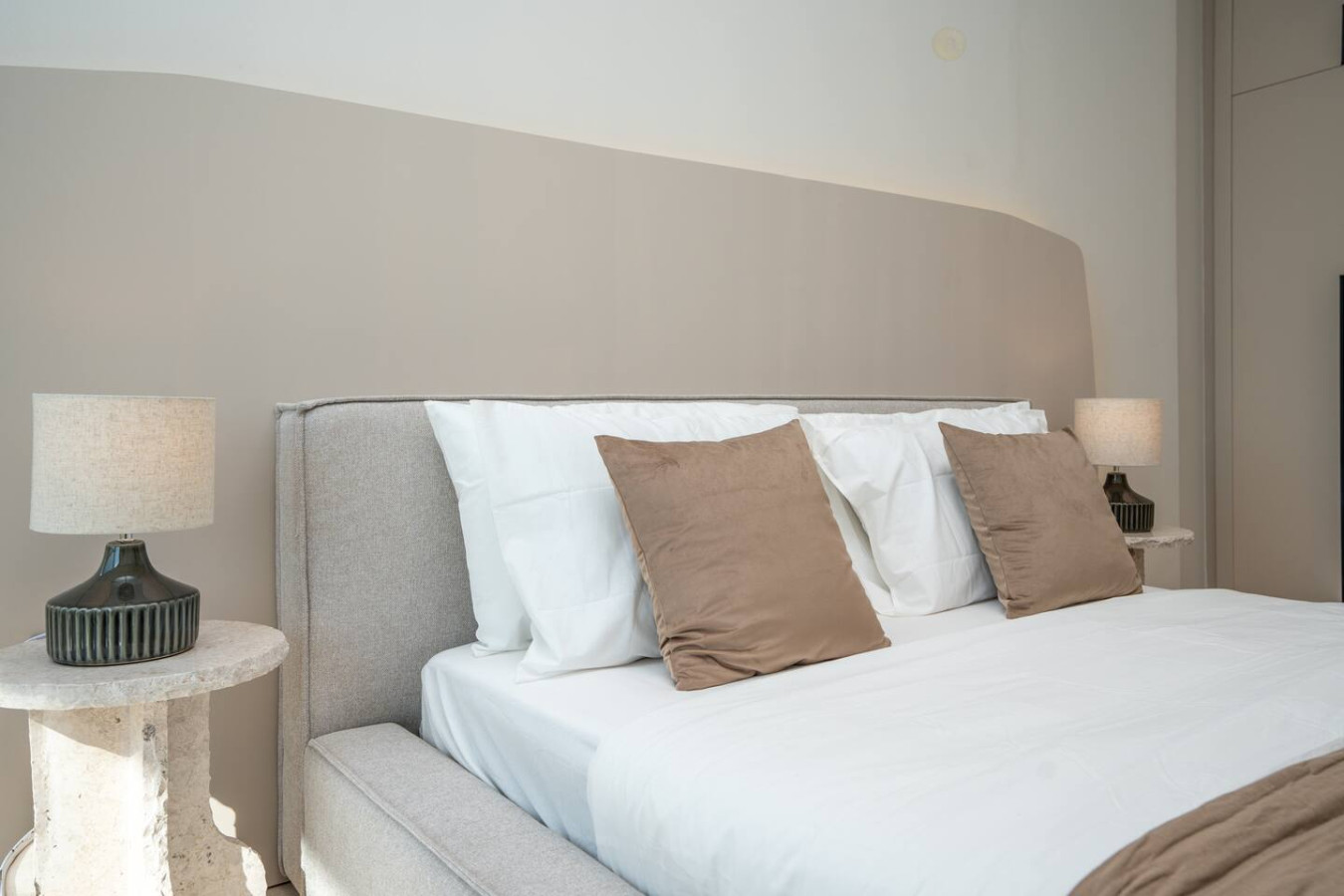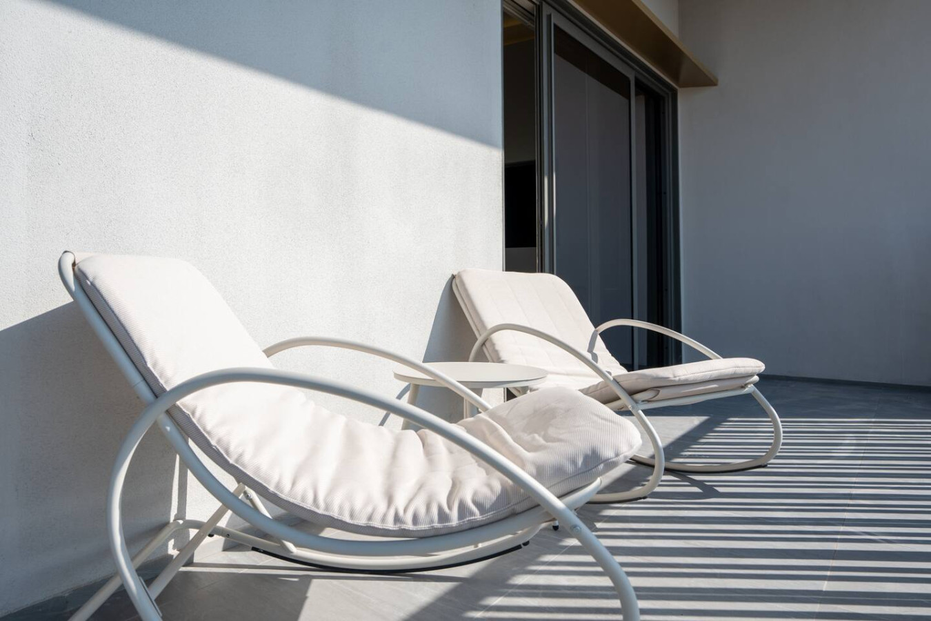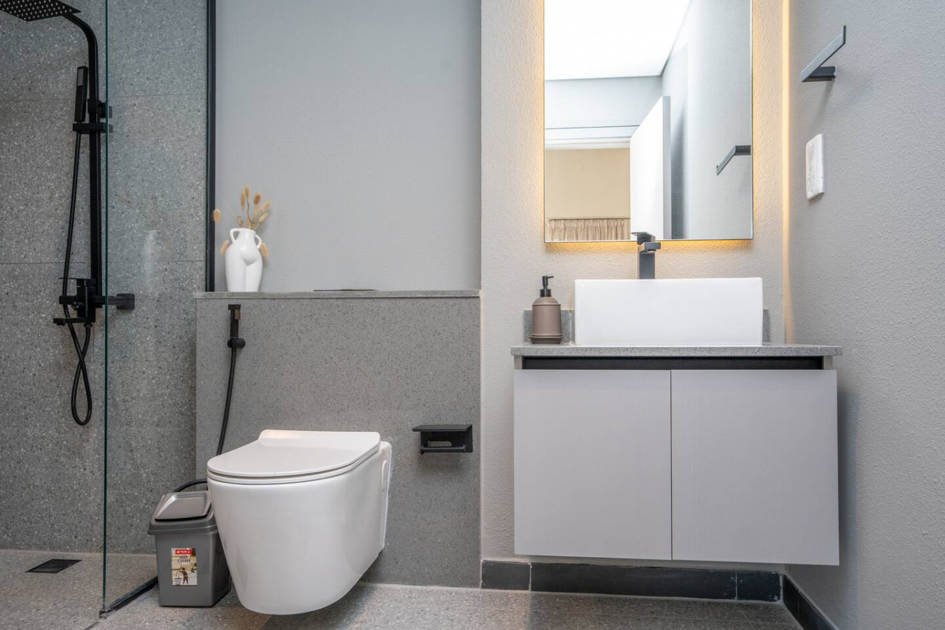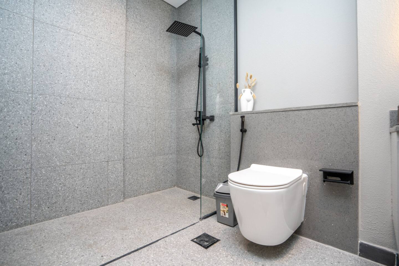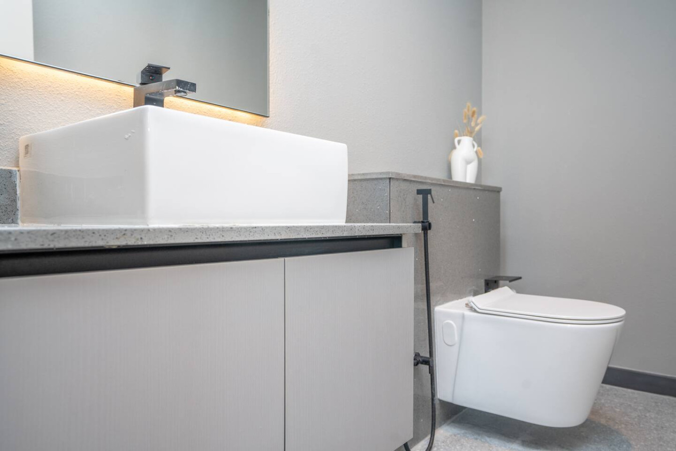 A sleek bathroom with premium fittings and fresh towels adds to the apartment’s charm. Step out onto the private balcony to enjoy serene neighborhood views, perfect for a quiet morning coffee or evening relaxation.