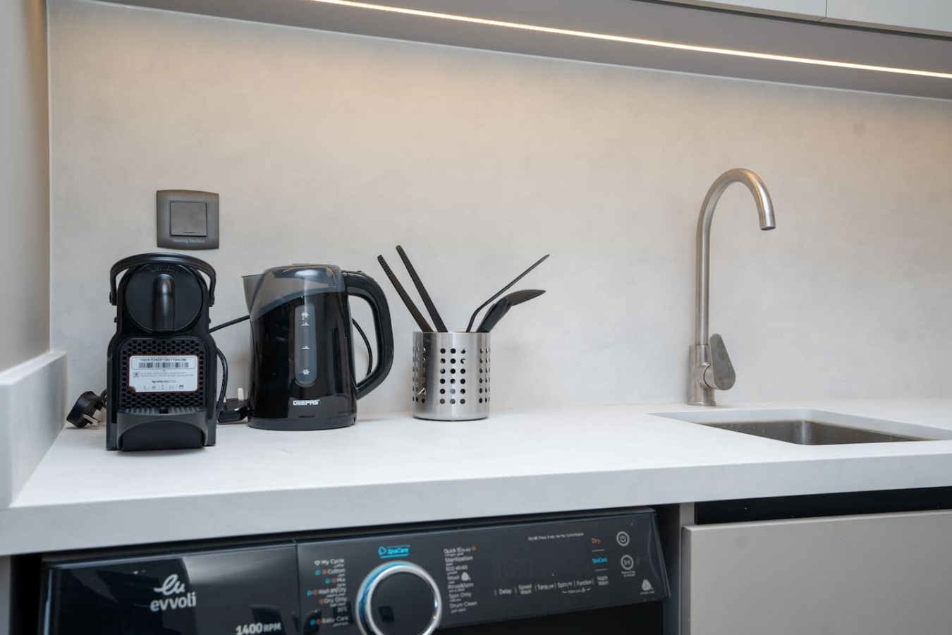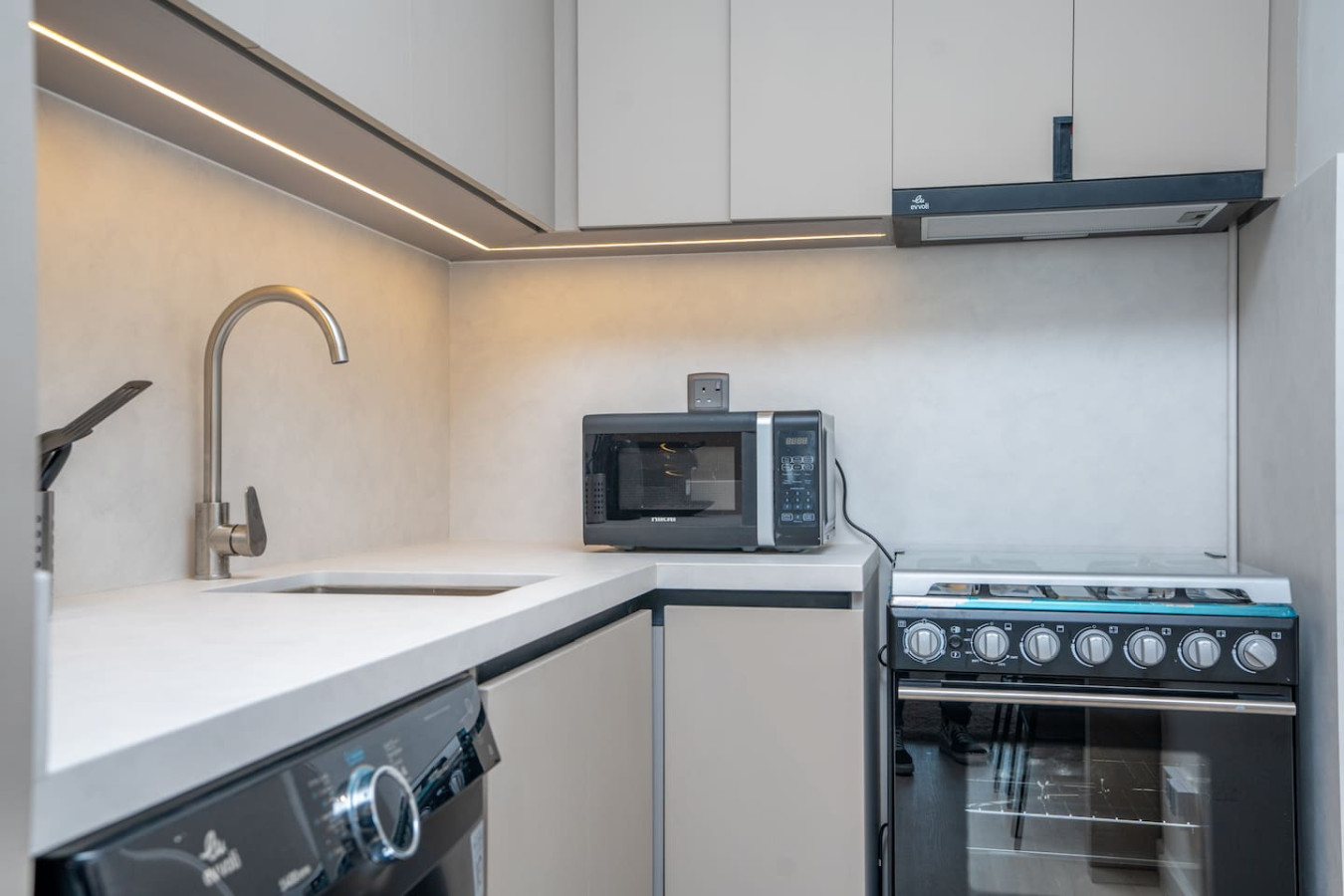 The bedroom offers a plush queen-sized bed and built-in wardrobes, ensuring a relaxing and clutter-free environment. The open-plan living and dining area is ideal for unwinding or entertaining, complete with comfortable seating and a smart TV. The fully equipped kitchen includes all the essentials, such as a refrigerator, microwave, and stove, making it easy to prepare your favorite meals.