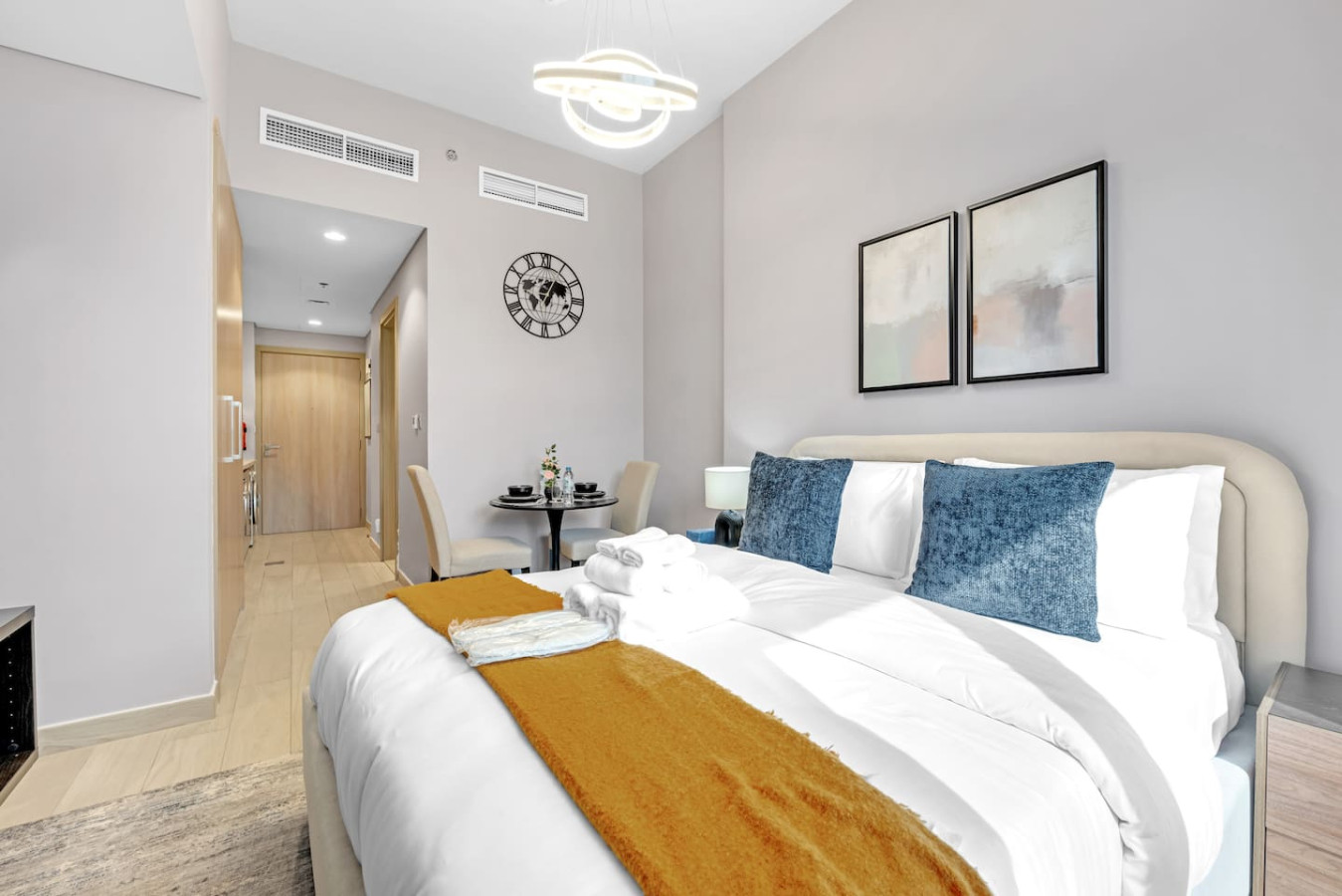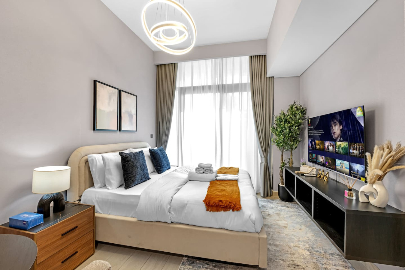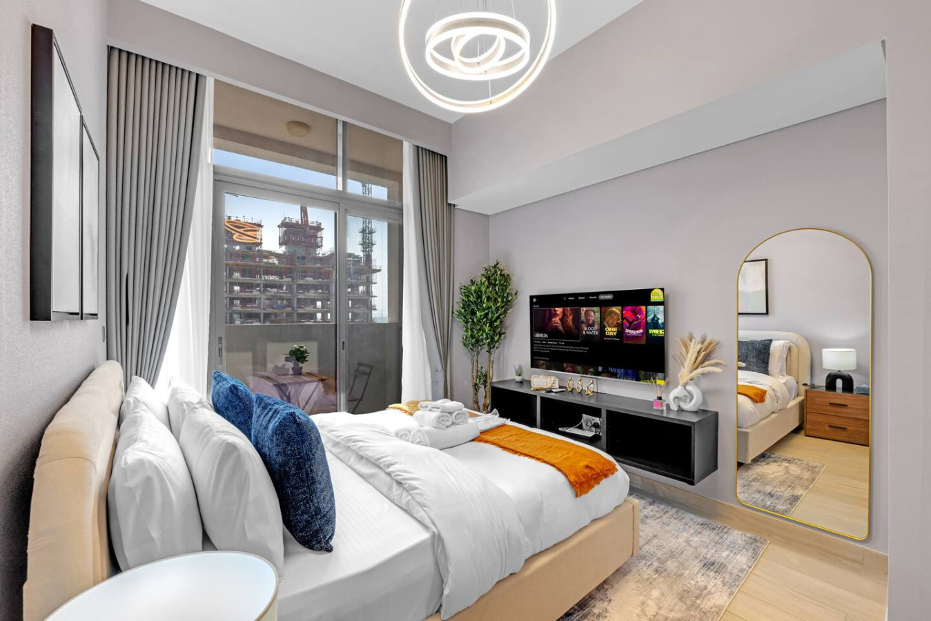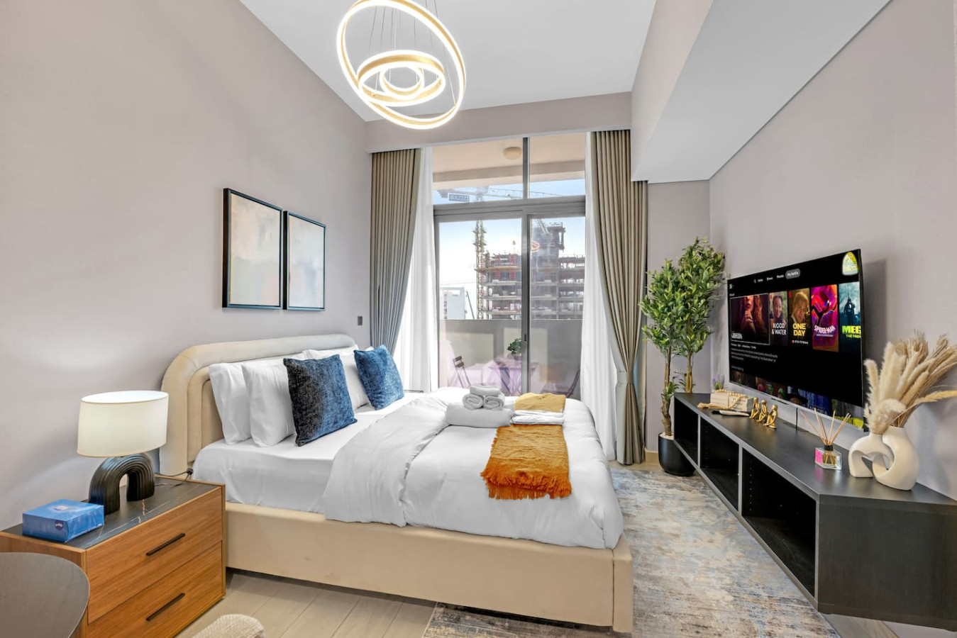 located in the vibrant Meydan community. The space features a plush bed, a
