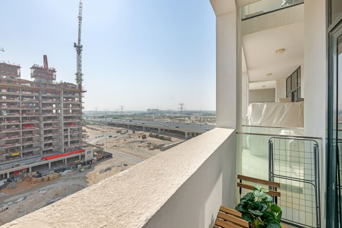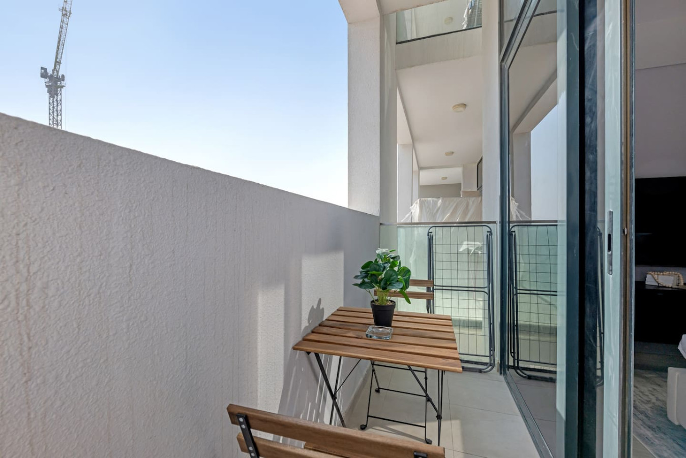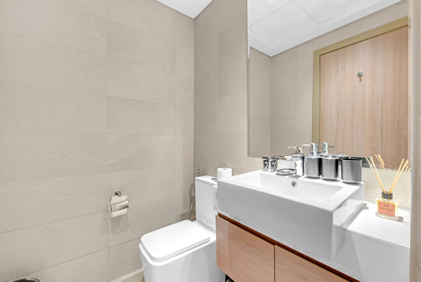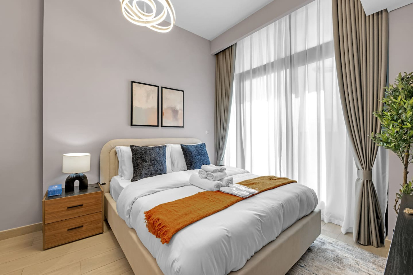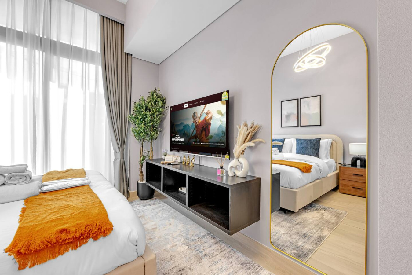 located in the vibrant Meydan community. The space features a plush bed, a