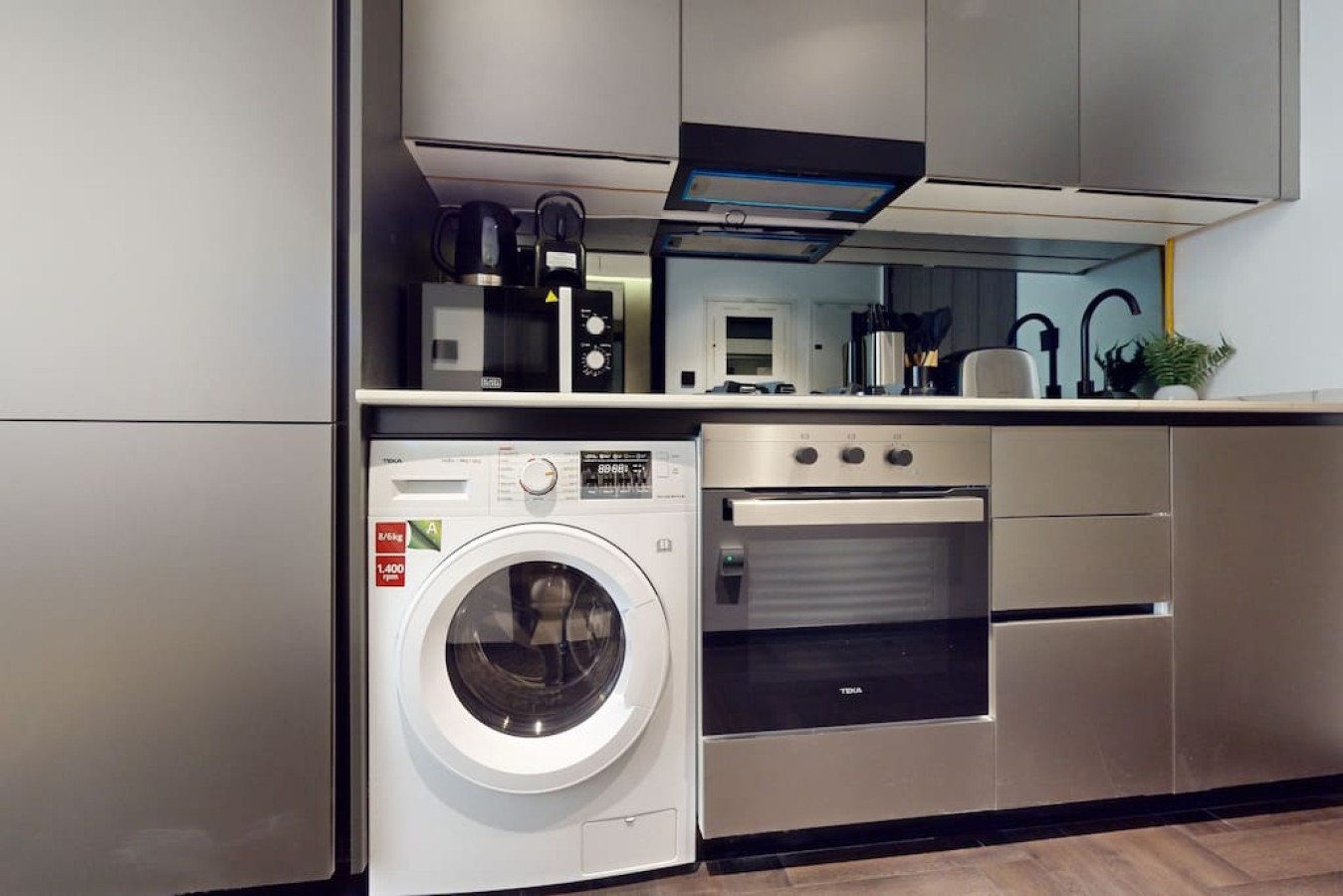The studio apartment has an open plan living and dining area, a queen-sized bed, a smart TV, dining table to seat two and a comfortable sofa that can open into a sofa bed to accommodate two if needed. There is also an equipped kitchen with a fridge, oven, stove and a washing machine. Hotel grade towels and bed linen are also available in the apartment.