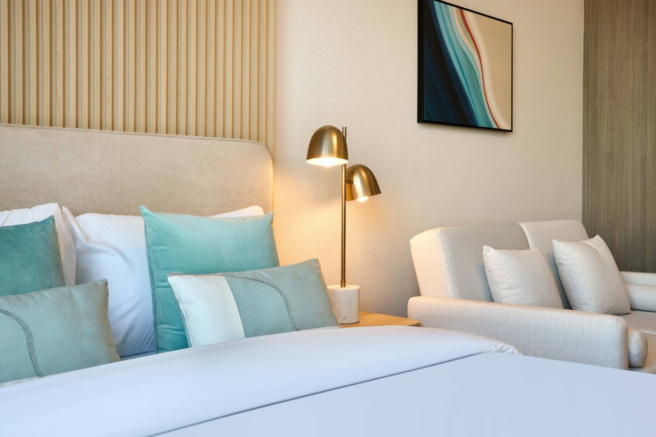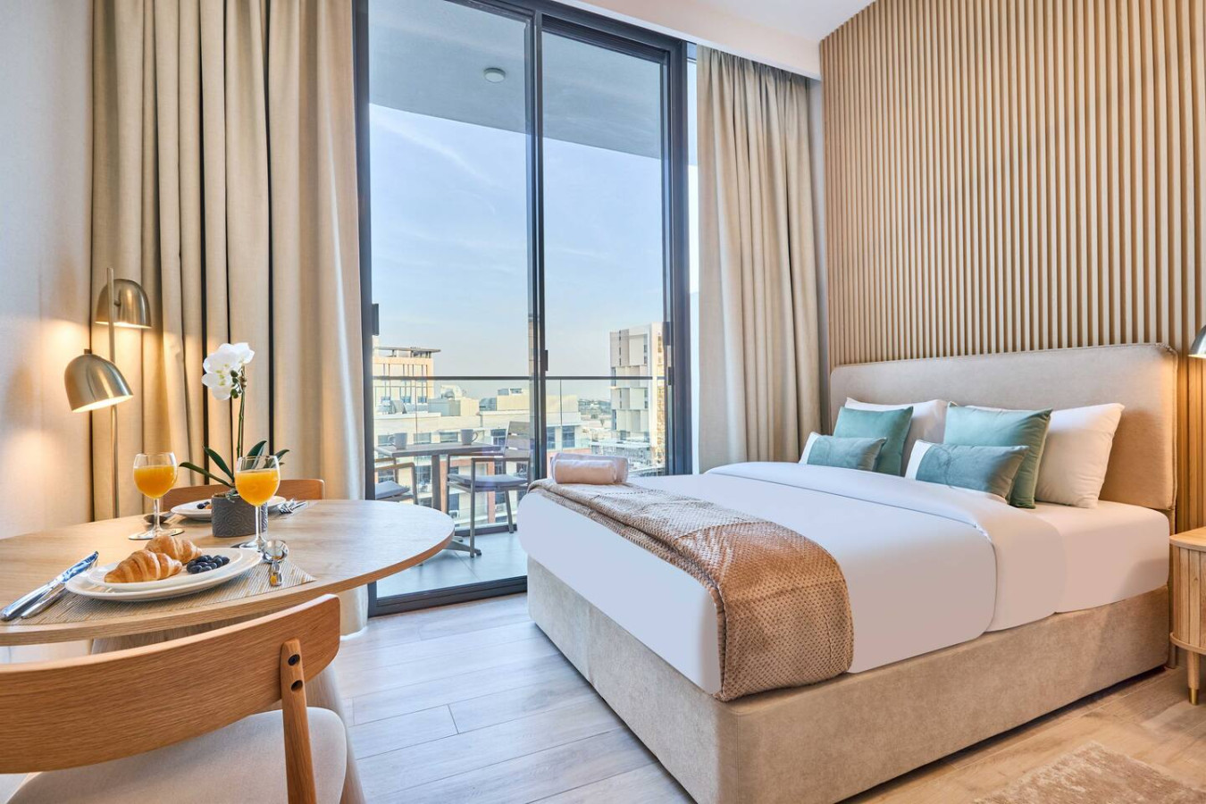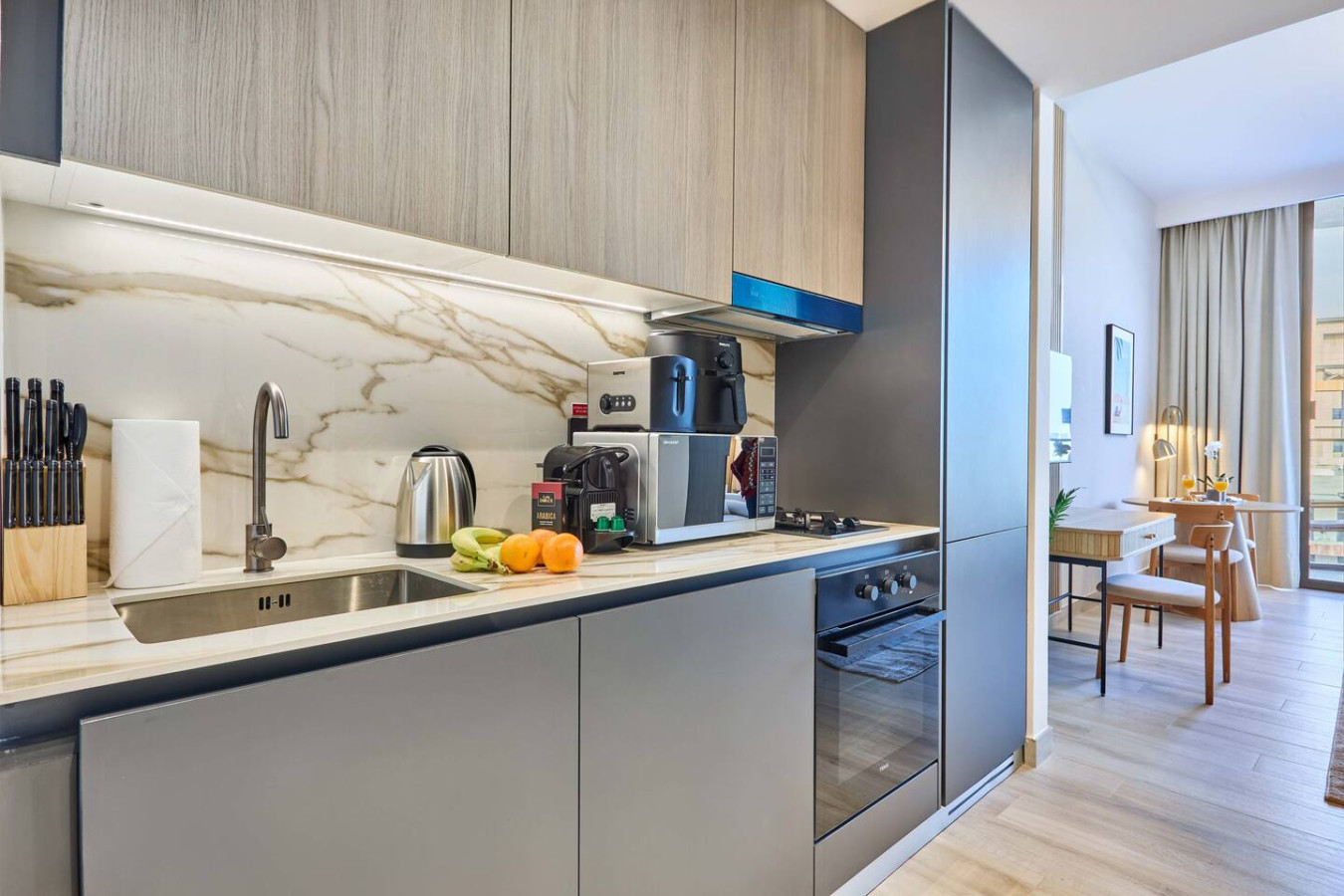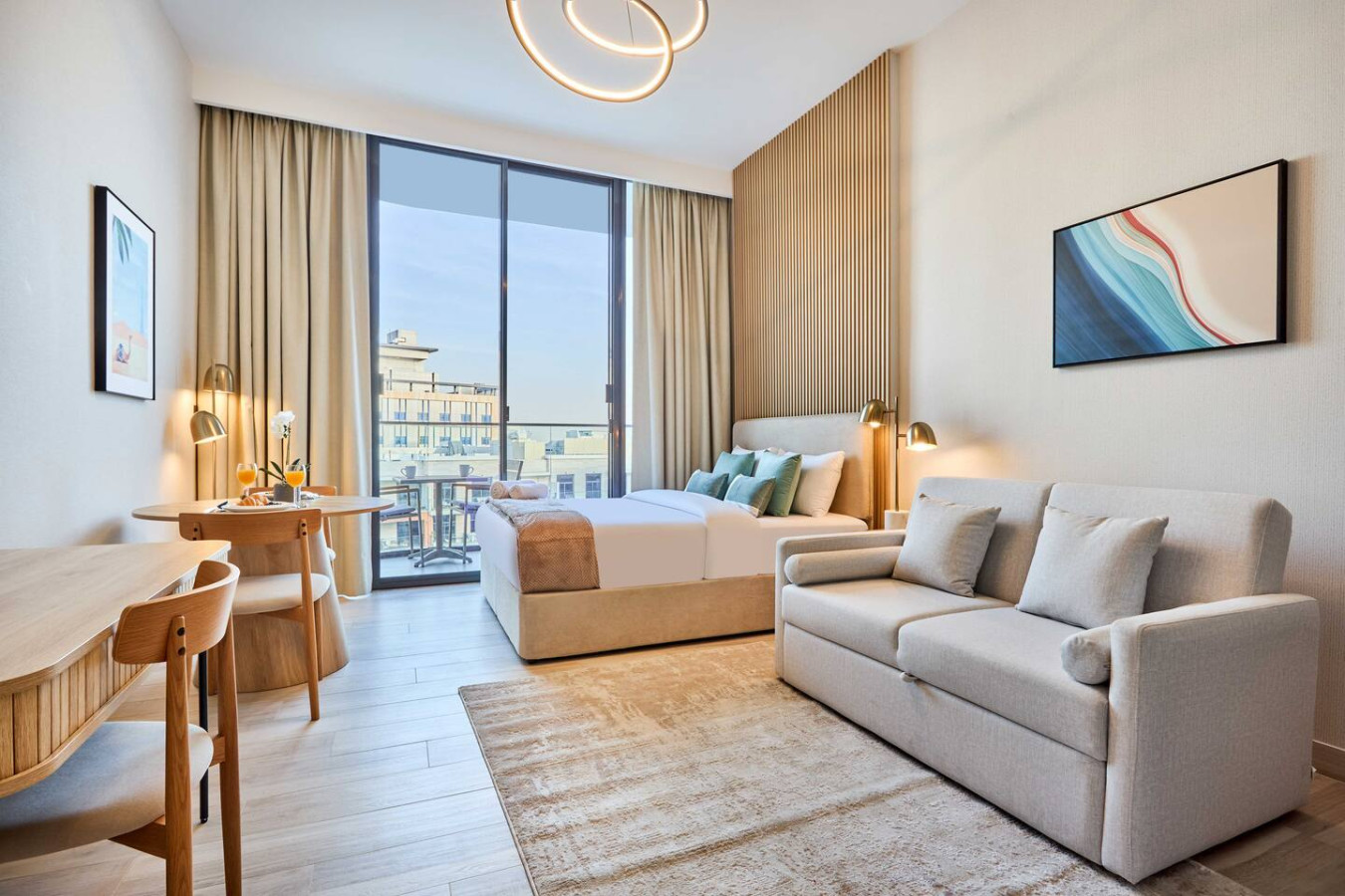The studio features a bright open-plan layout with a comfortable bed and sofa bed, a fully equipped kitchen, and a modern bathroom. Guests can enjoy building amenities including a swimming pool, gym, and 24/7 security.