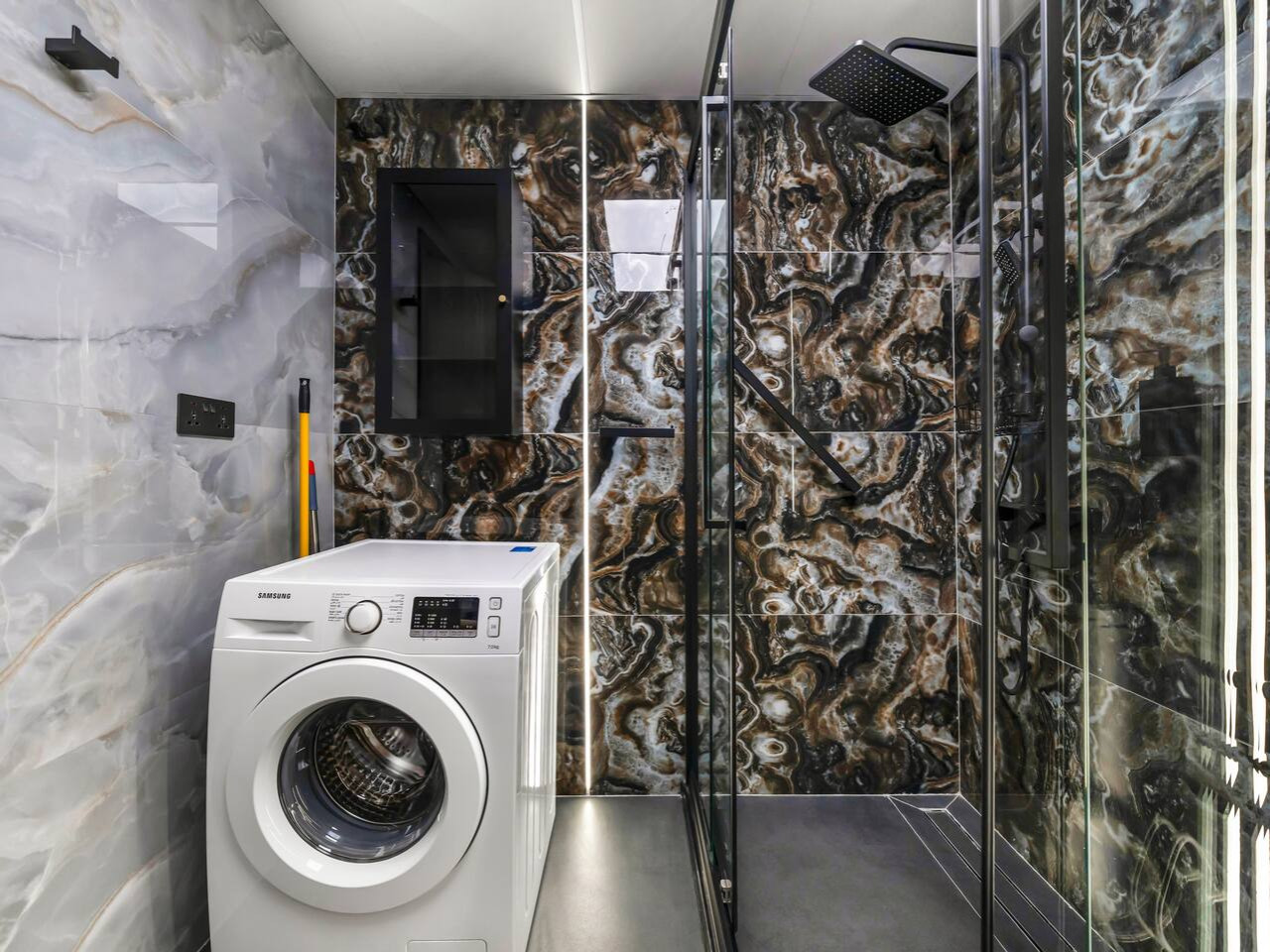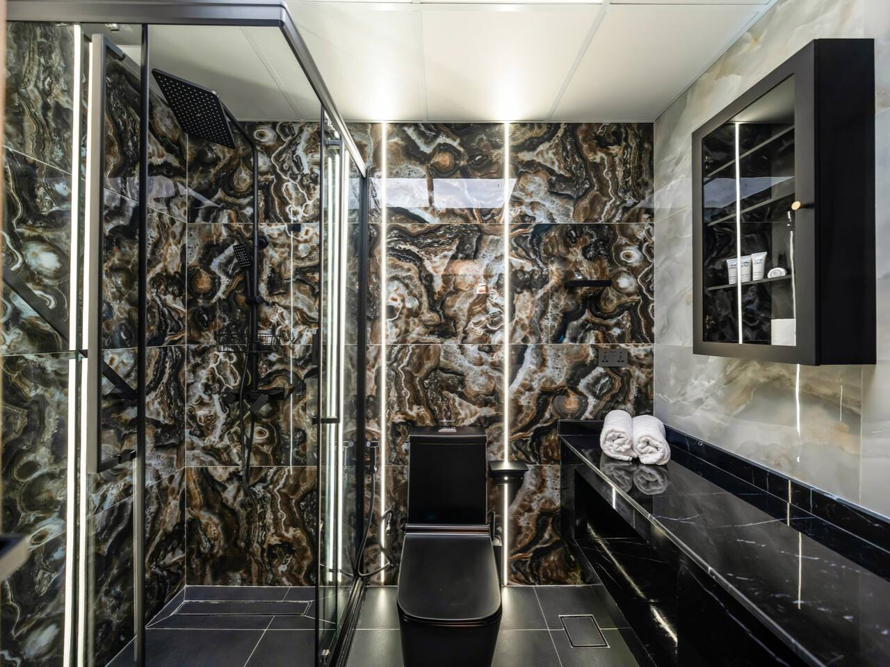 The ultra-modern bathroom features a spacious, glass-enclosed walk-in shower with contemporary design details, plus fresh towels and essential toiletries for your comfort.