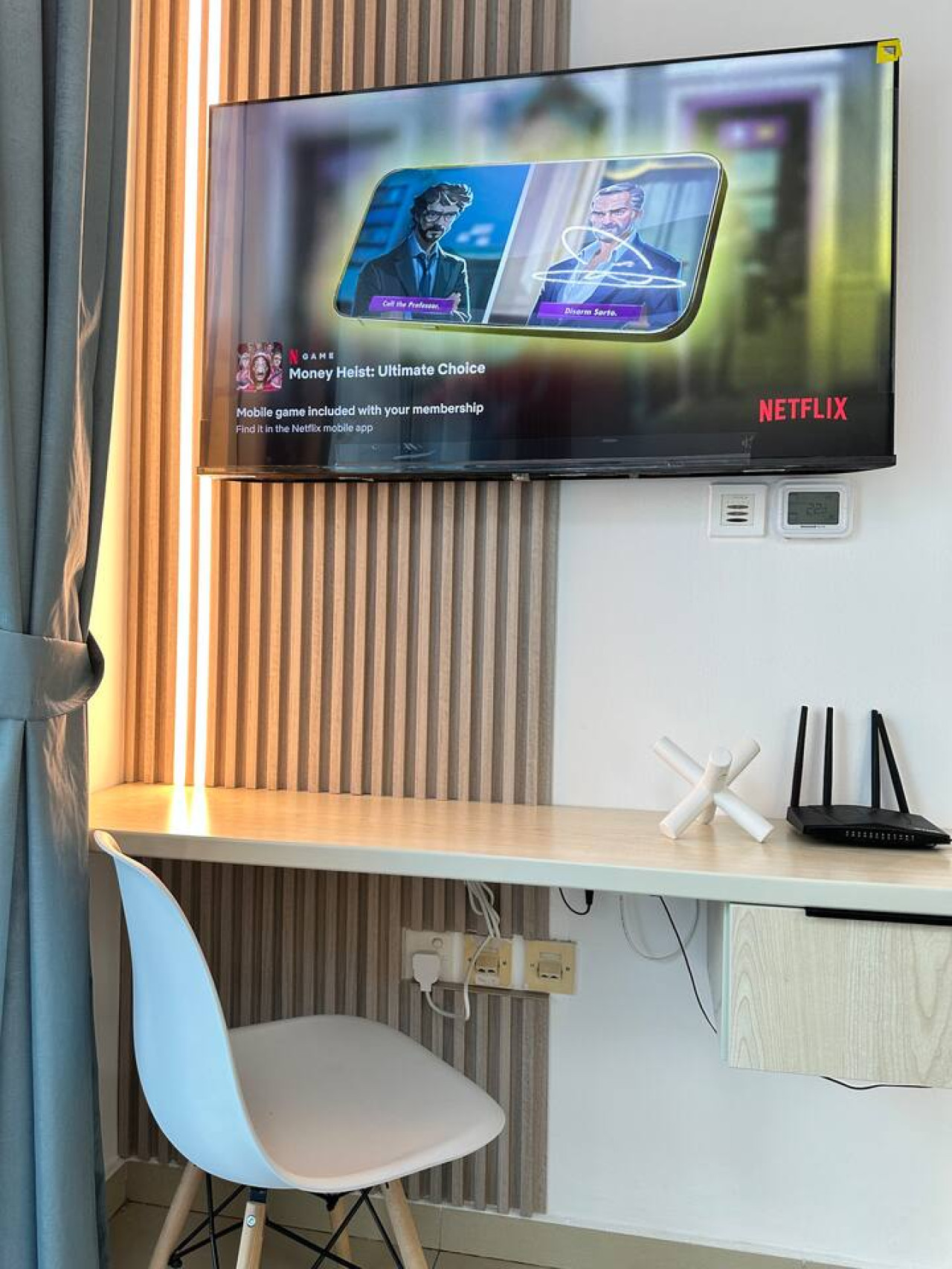 > Dedicated workstation with a desk for added productivity