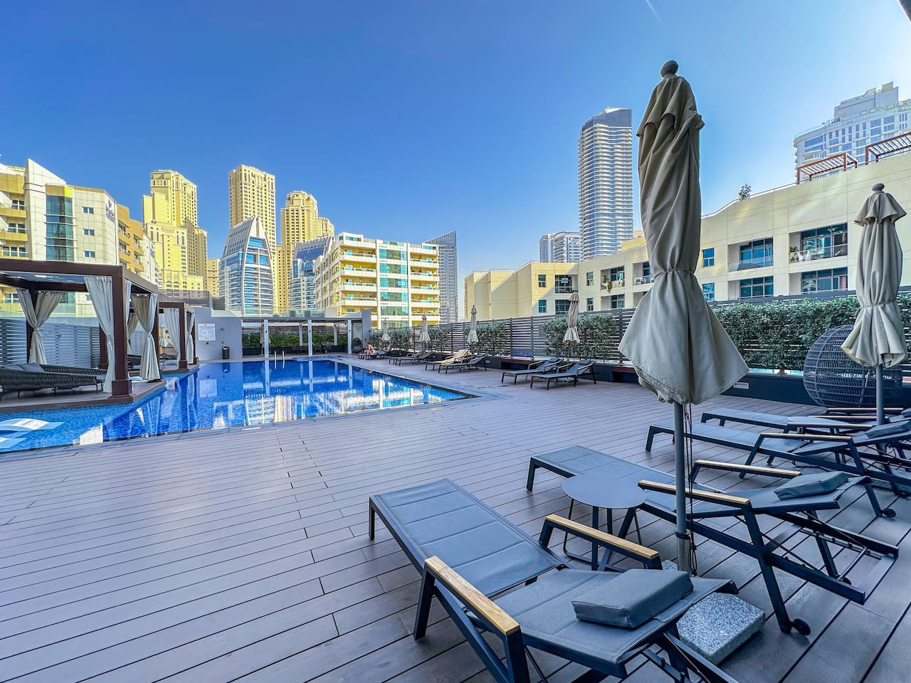 Relájate en la piscina del edificio, el lugar perfecto para refrescarte y disfrutar de momentos tranquilos bajo el cálido sol de Dubai.