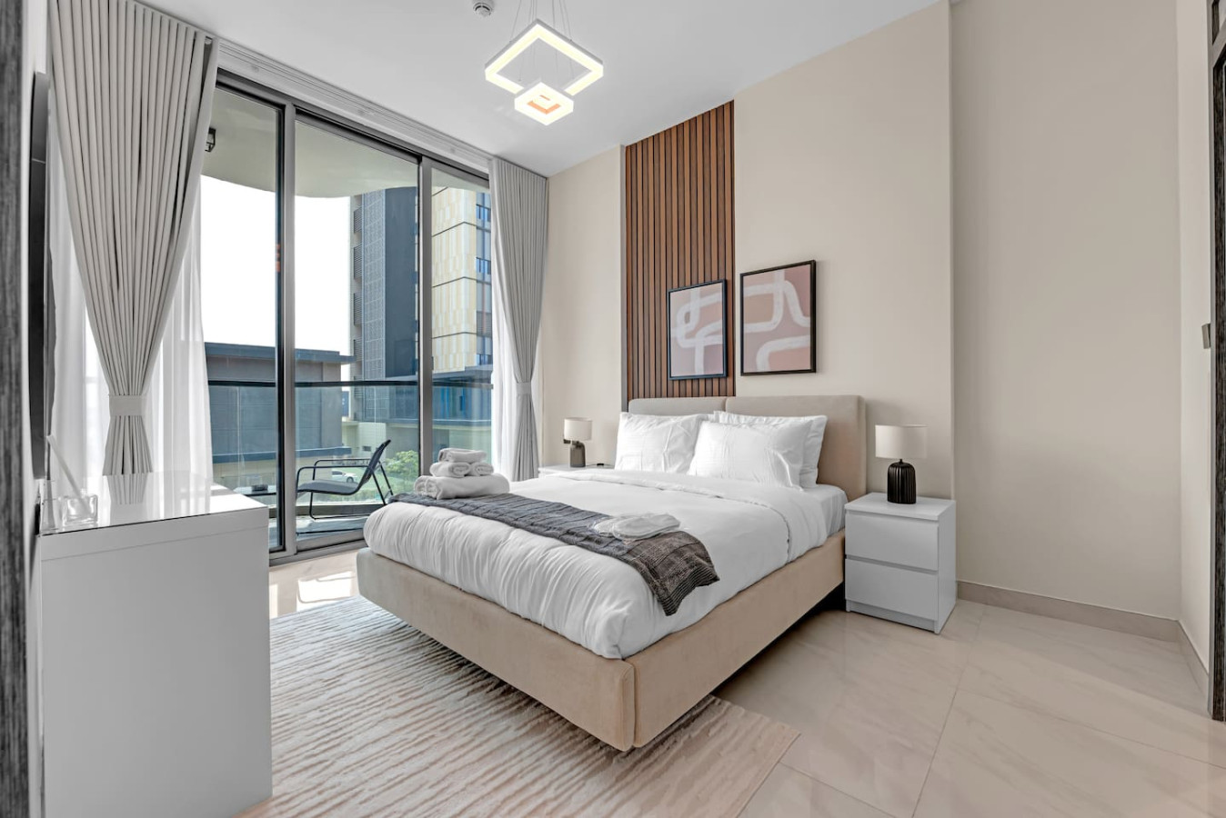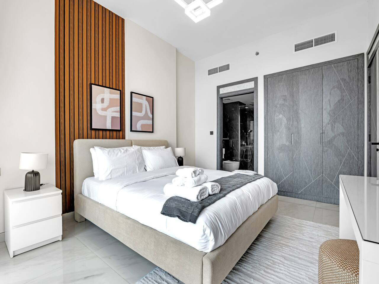 • Elegant Sleeping Area – Sink into our luxurious queen-size bed adorned with premium linens and soft pillows that guarantee restorative sleep after your Dubai adventures.