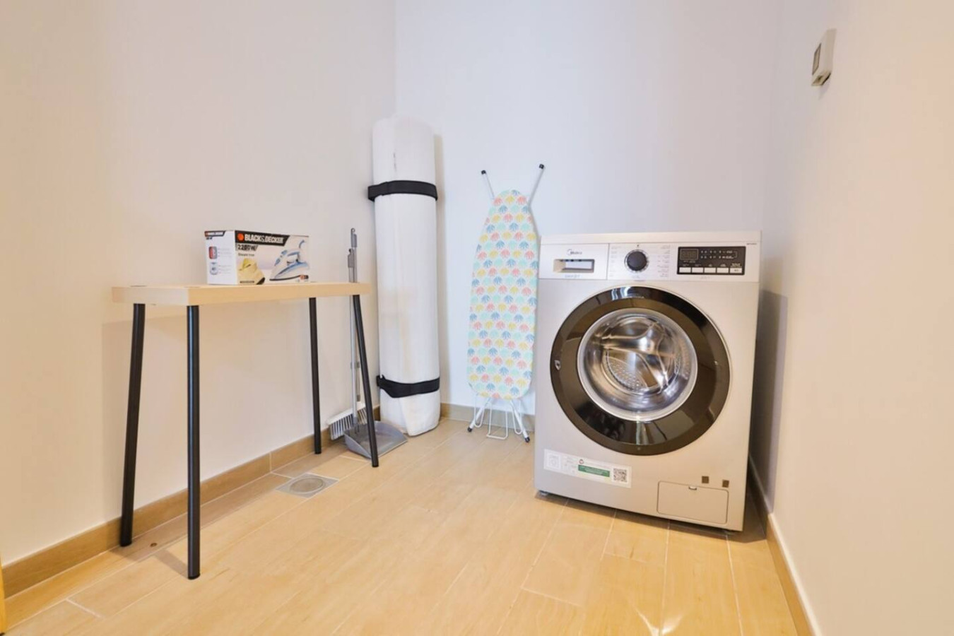 – Laundry room with washing machine, drying rack, Iron, Ironing board.