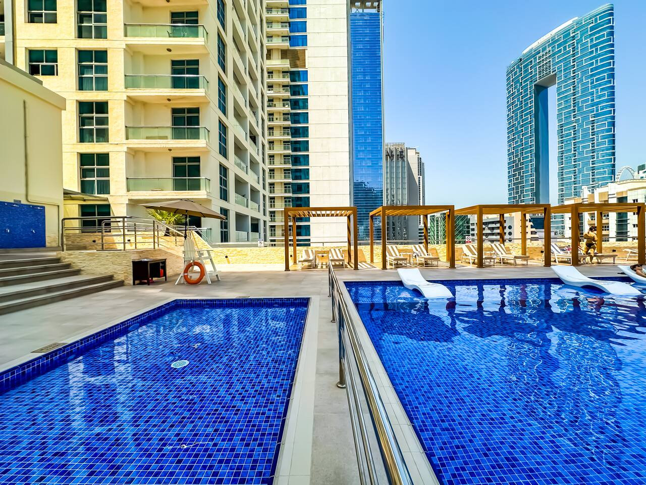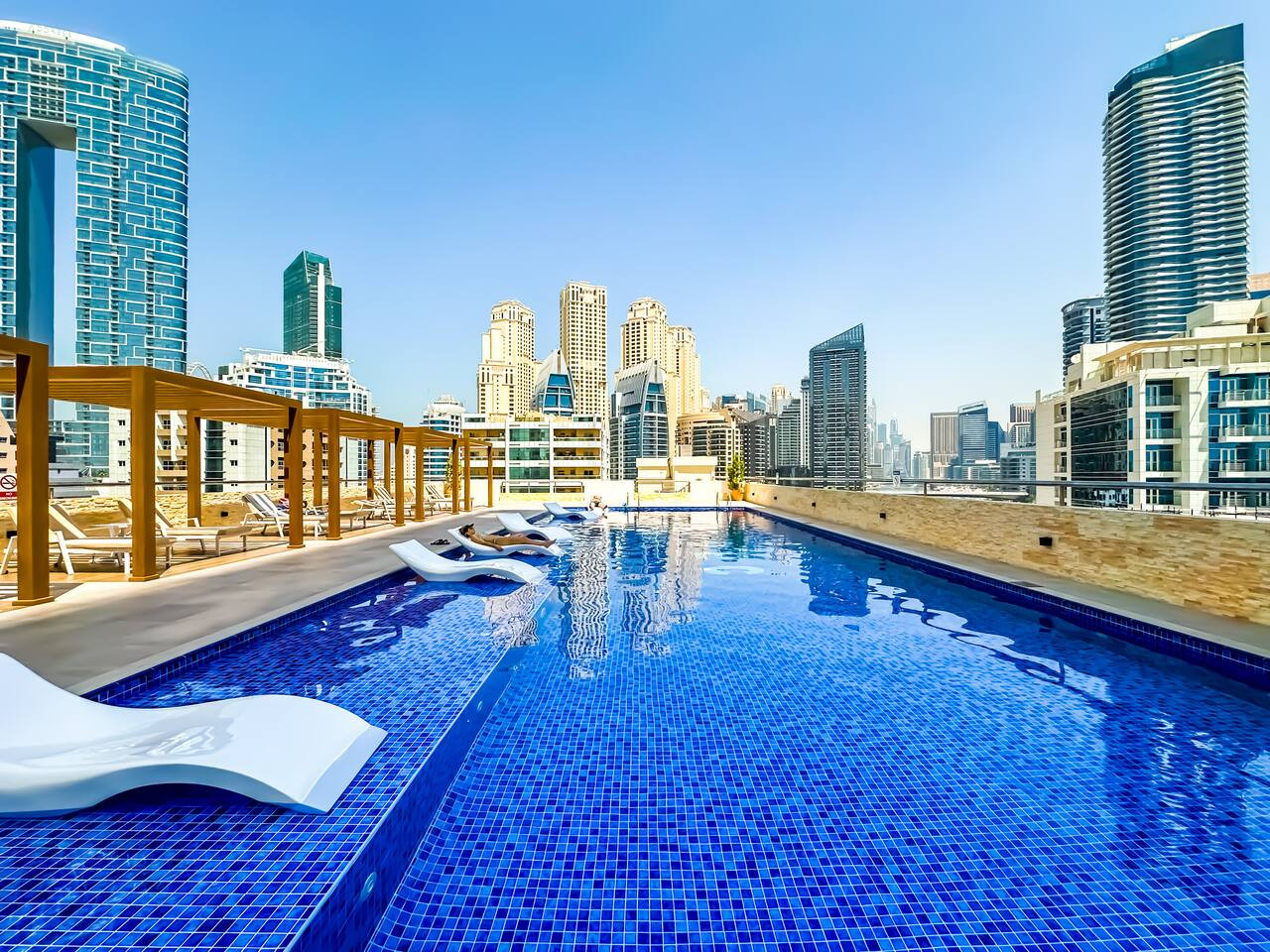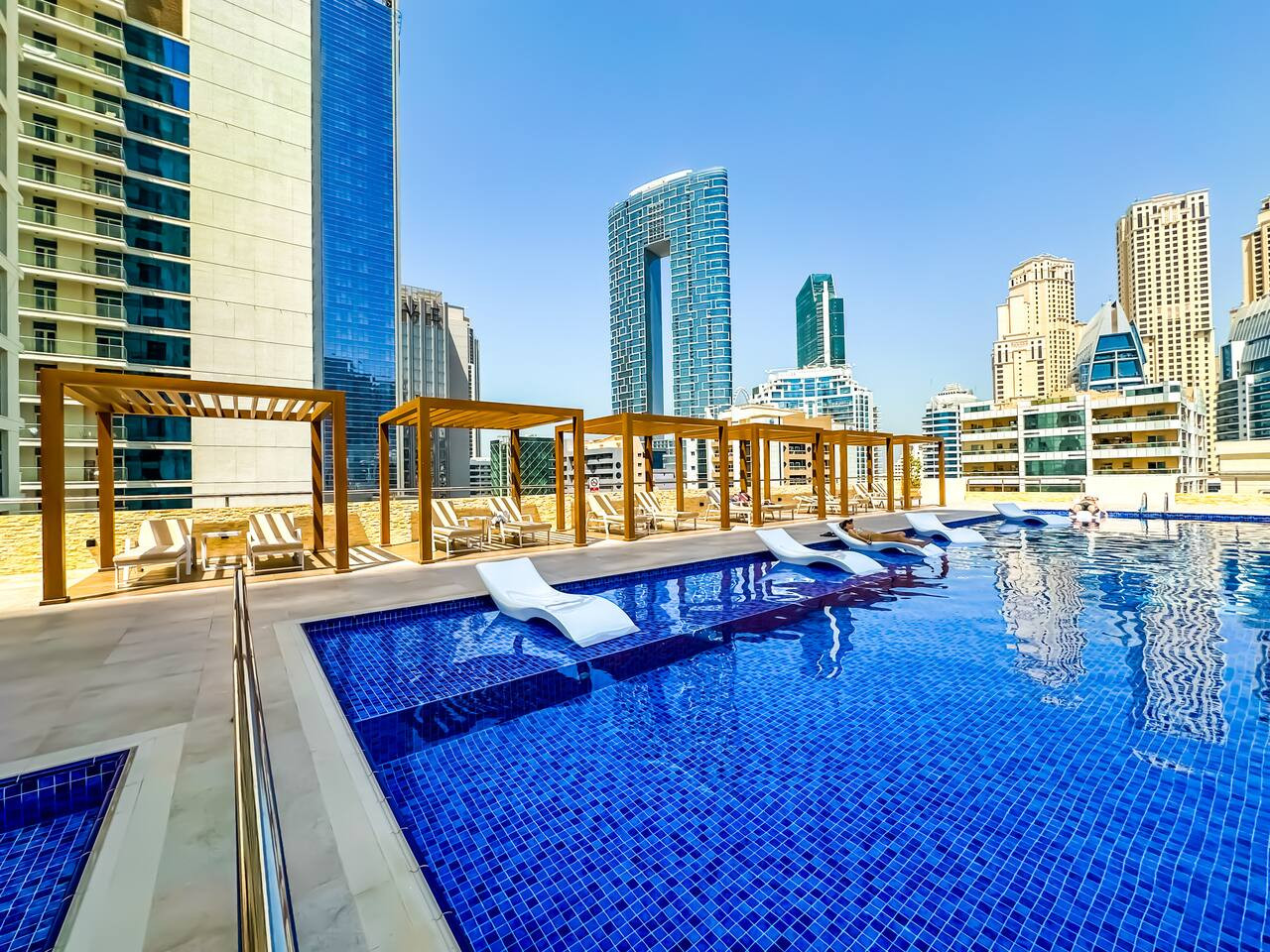 Date un chapuzón en la nueva piscina, un oasis de tranquilidad en el corazón de Dubai Marina. Relájate en una tumbona con un refresco y disfruta del cálido sol y la brisa del mar.