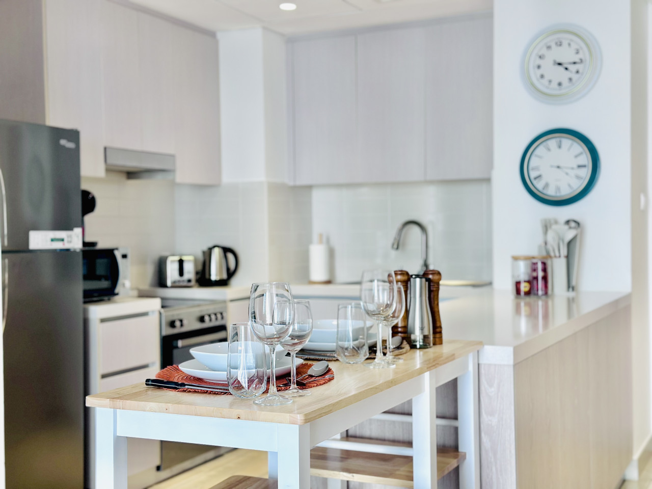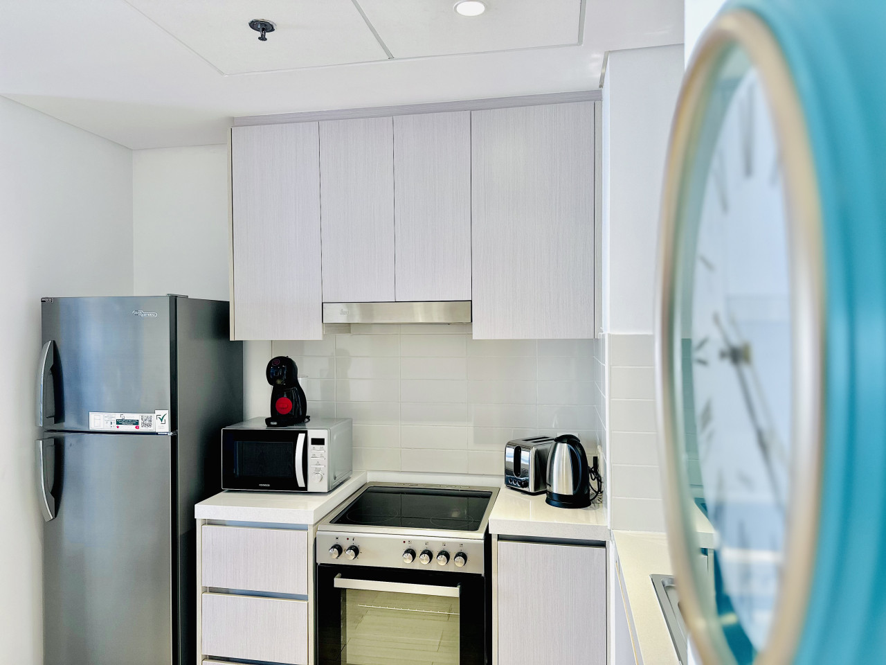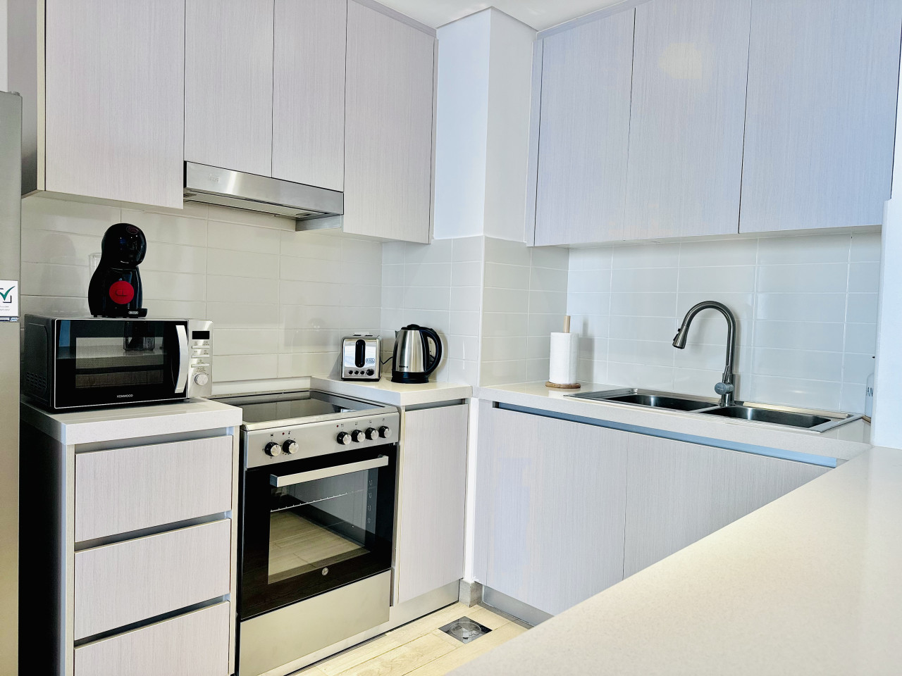 The kitchen is fully equipped with everything you need for your stay, including a refrigerator, stove, oven, microwave, kettle, and all essential cookware and utensils.