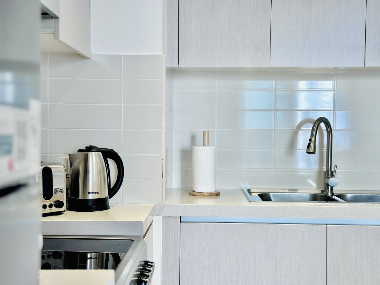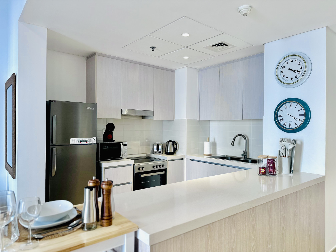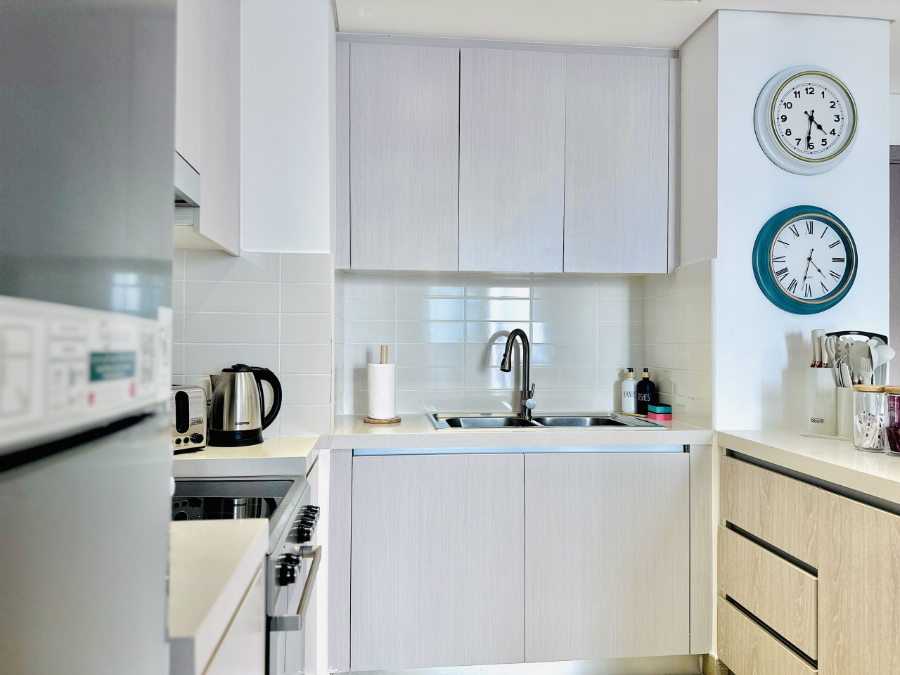 The kitchen is fully equipped with everything you need for your stay, including a refrigerator, stove, oven, microwave, kettle, and all essential cookware and utensils.