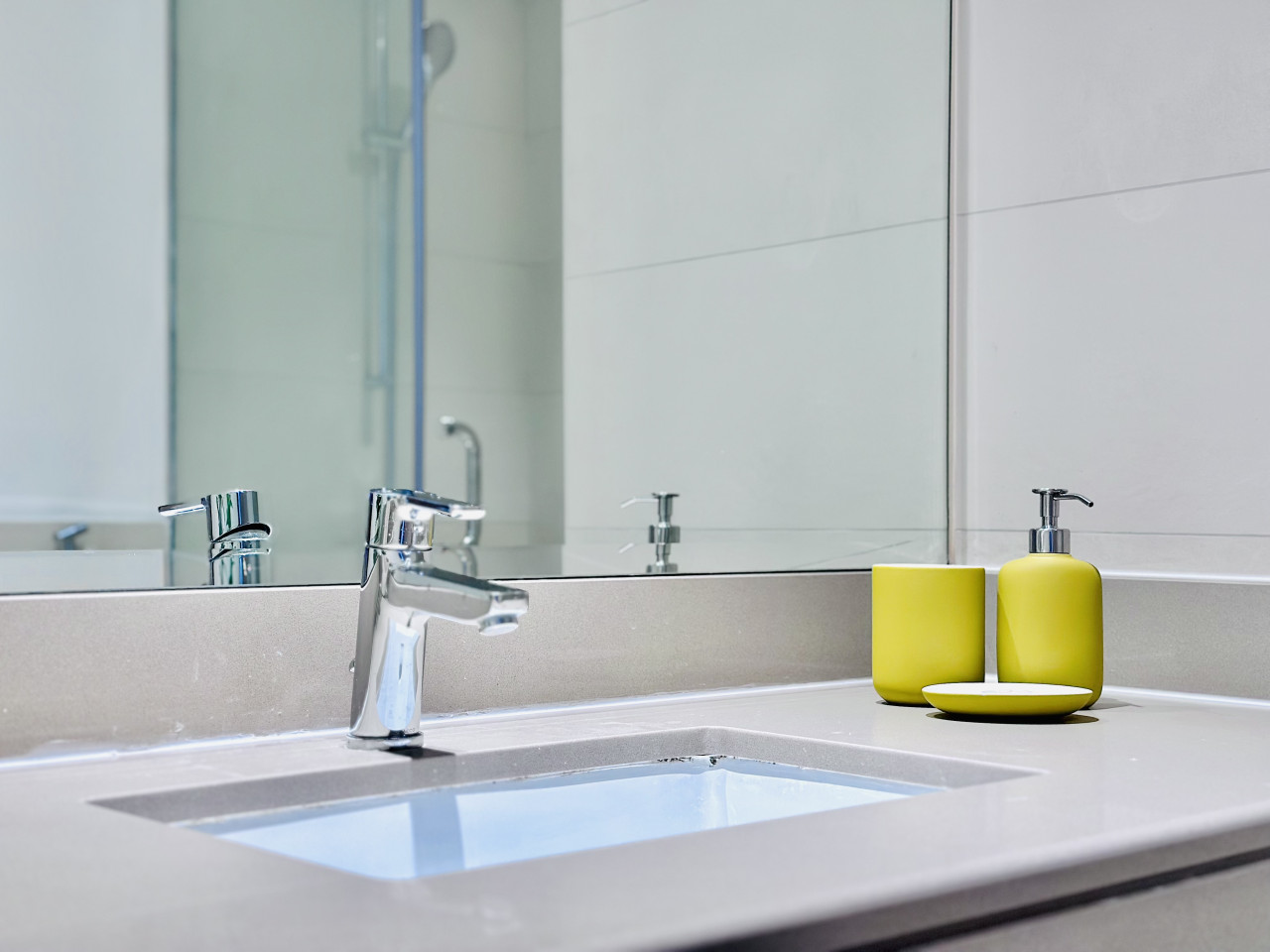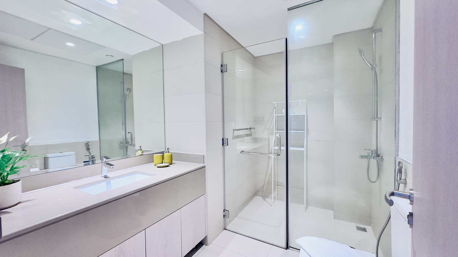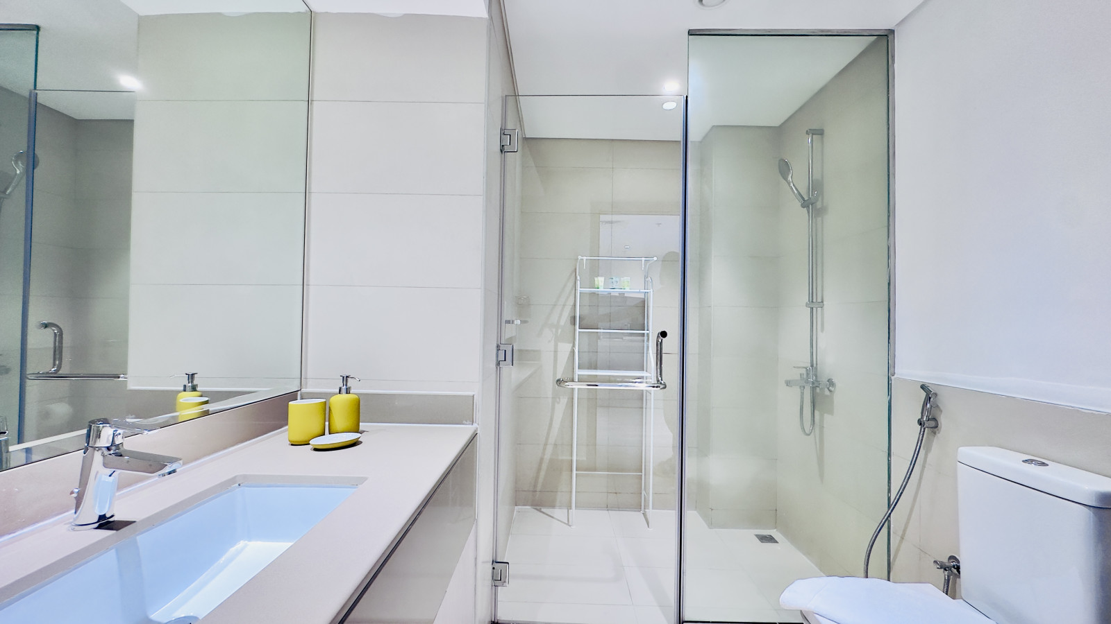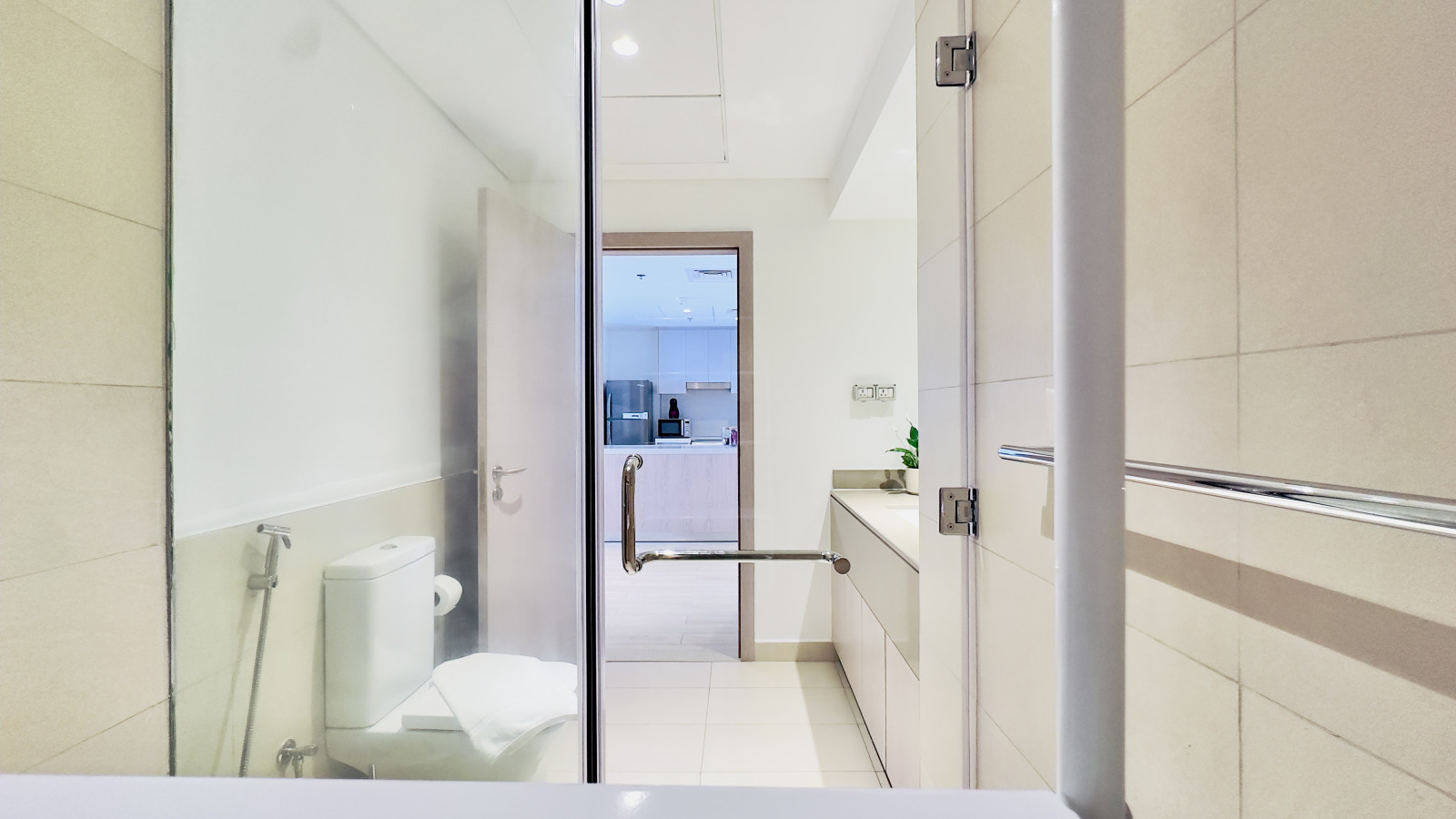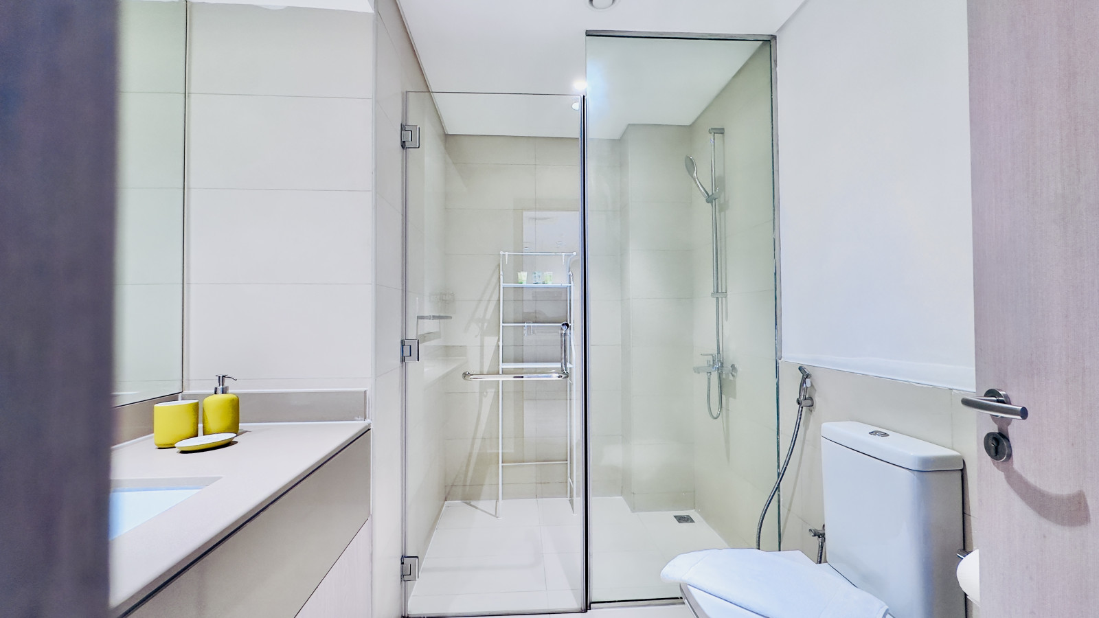 The apartment includes a clean and modern bathroom with a walk-in shower, fresh towels, and basic toiletries.