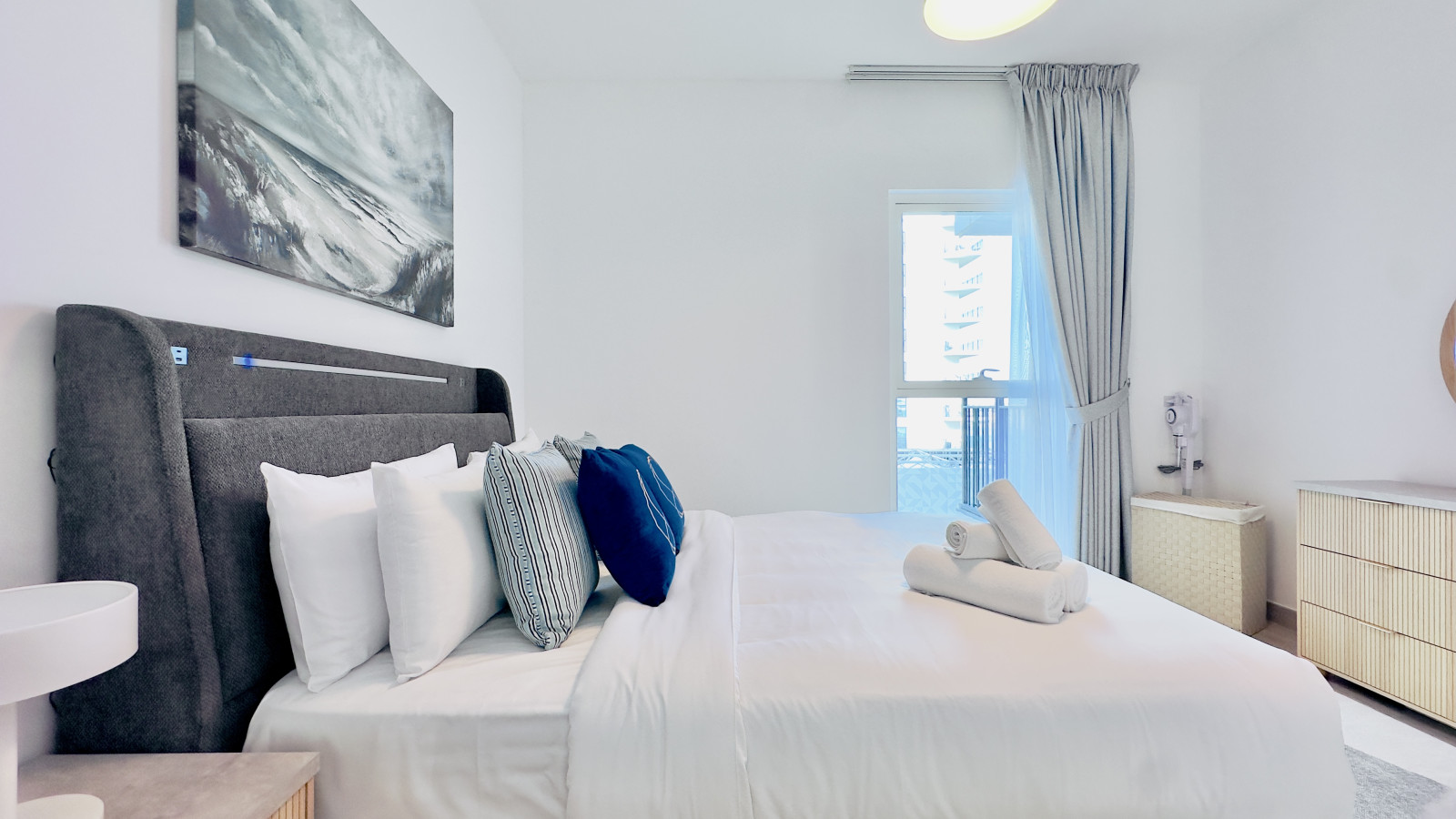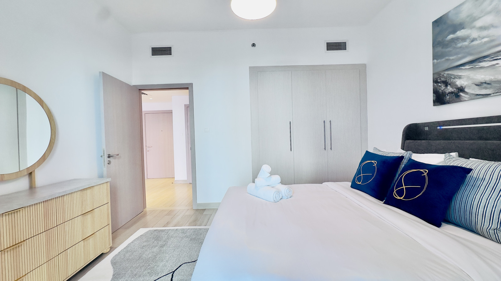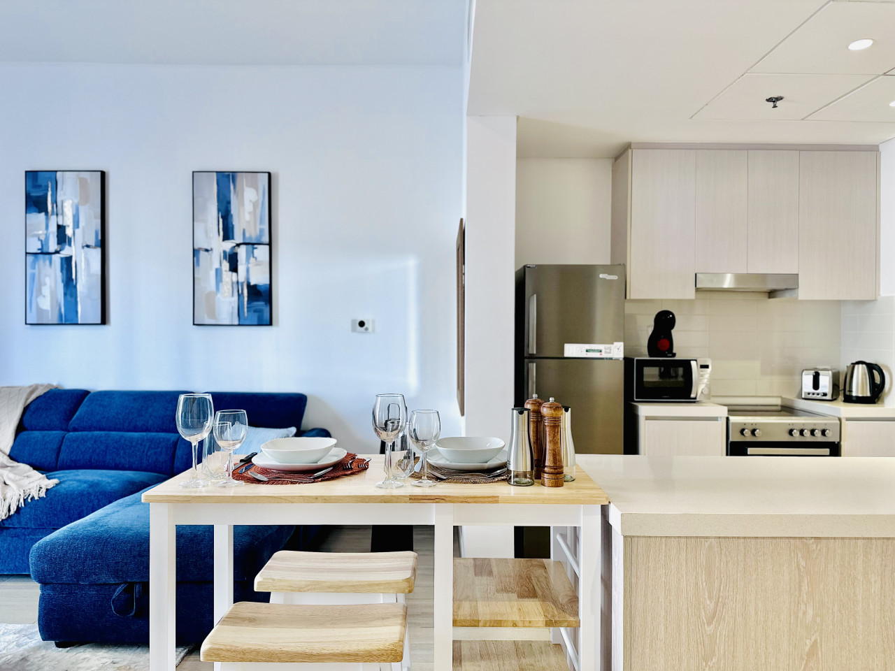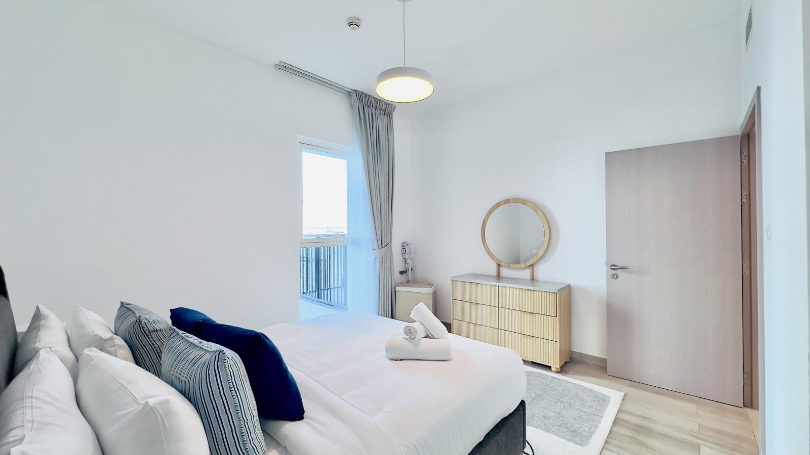 The bedroom features a comfortable queen-sized bed, built-in wardrobes, and blackout curtains to ensure a restful night’s sleep. Fresh linens and towels are provided for every stay.